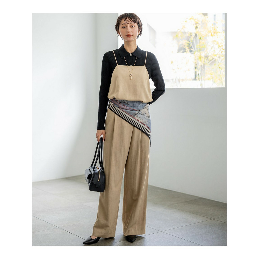 洗練されたドレープが魅せる、大人のラップ風ワイドパンツ