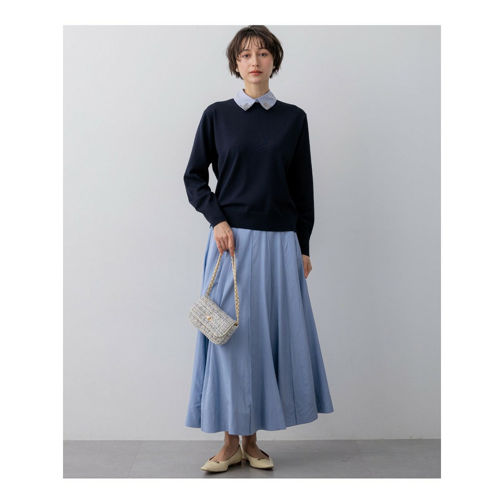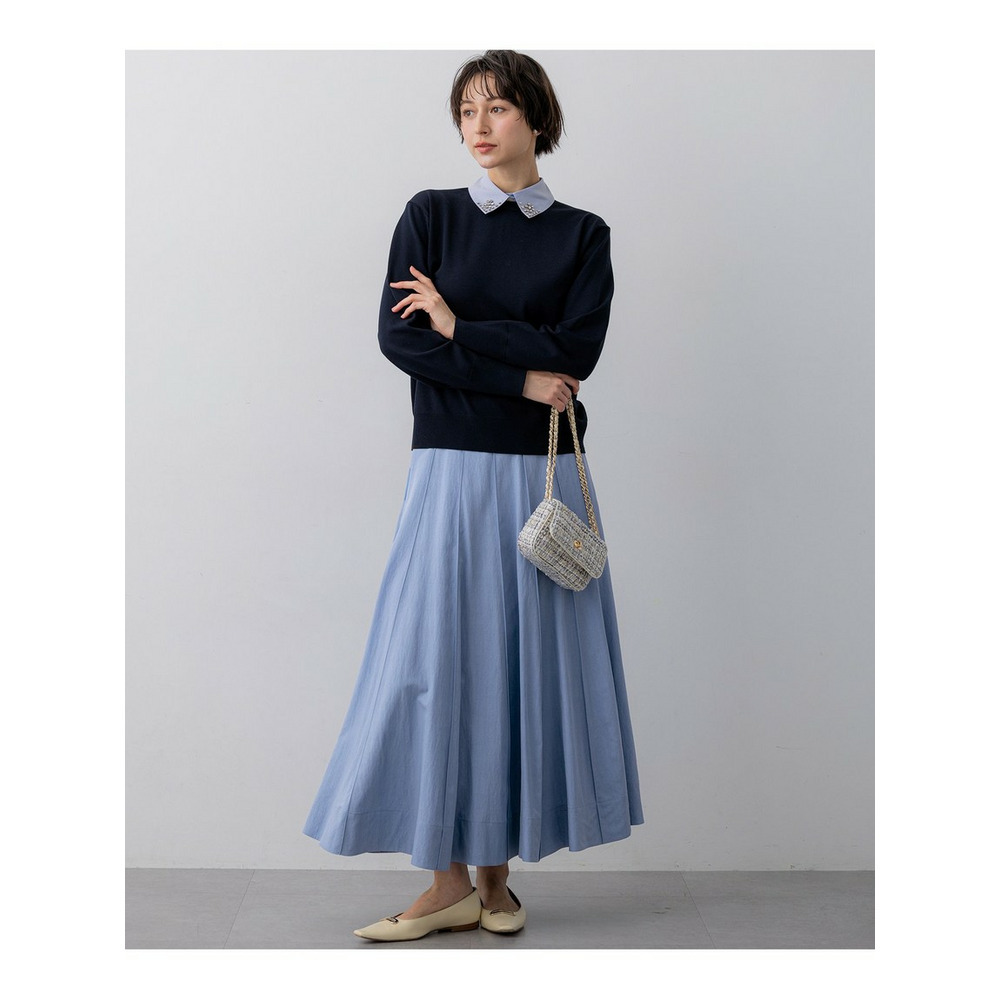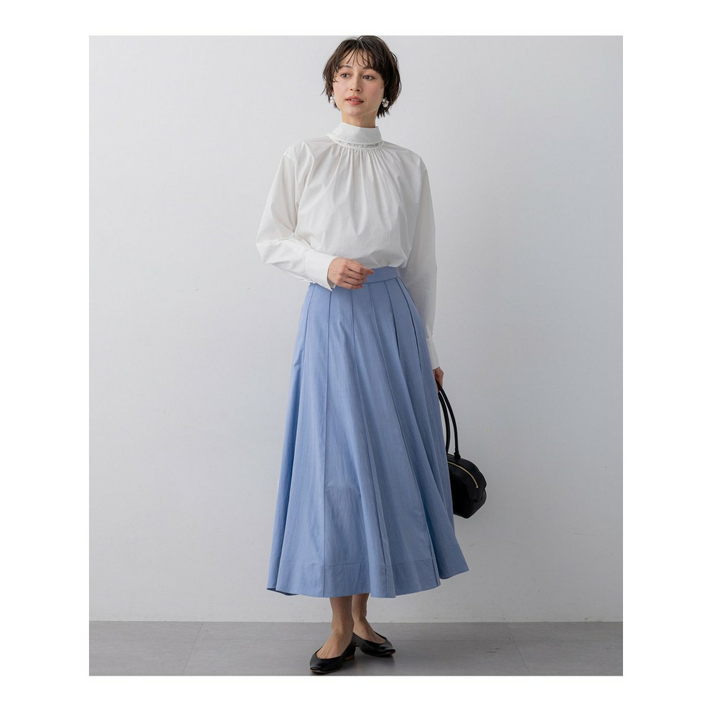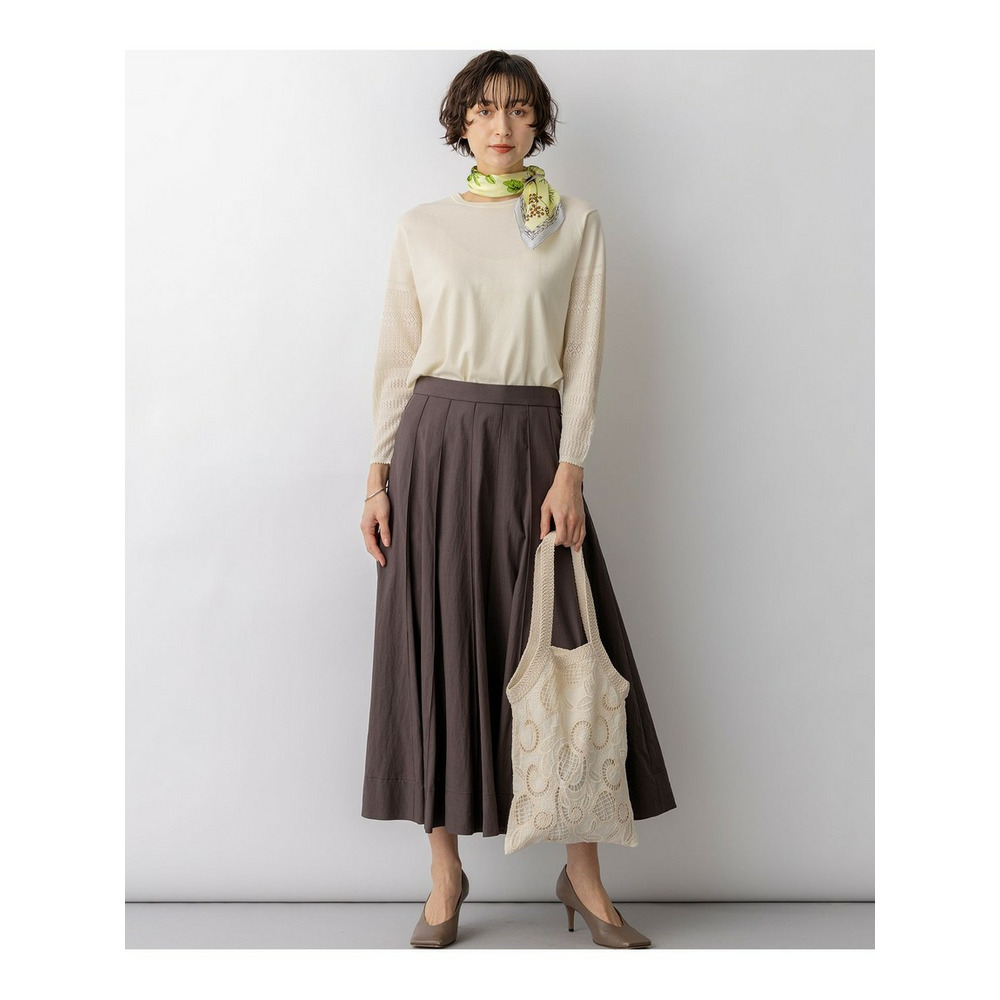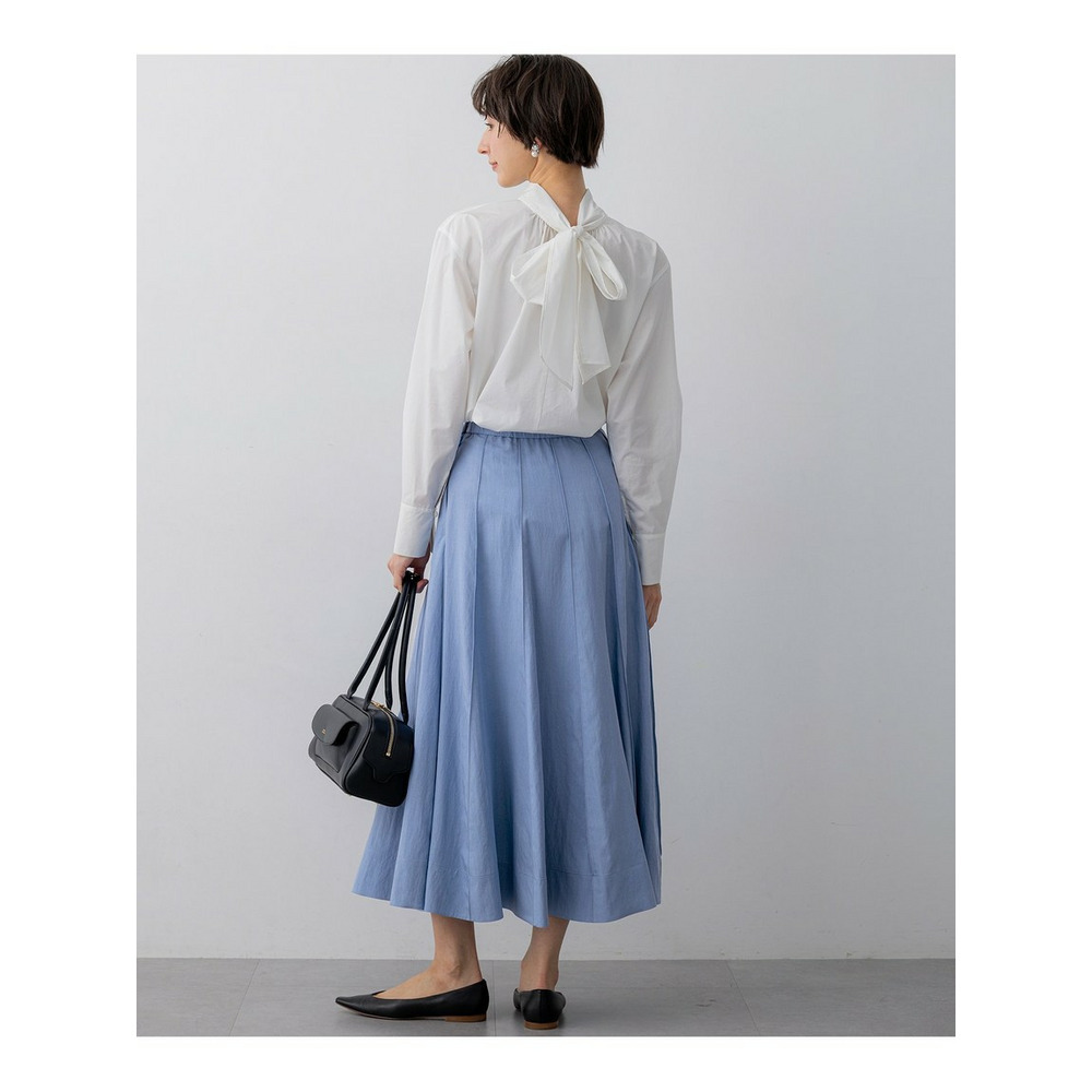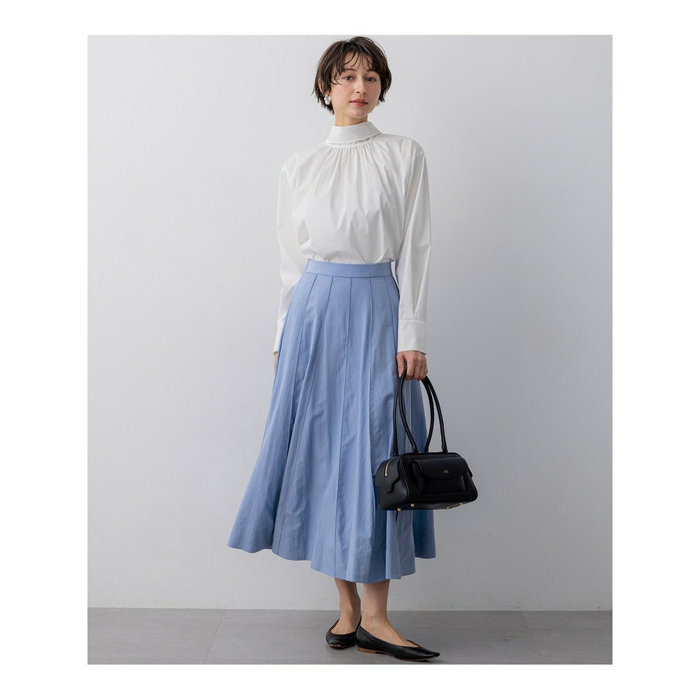 春らしい軽やかなボリューム感が魅力のフレアスカートです。腰回りはすっきりと見せつつ、裾に向かって優雅に広がるフレアラインが、女性らしい華やかさを添えます。ミモレ丈で長すぎないレングスはバランスがとりやすく、どんなトップスにも合わせやすい万能な一枚です。ブラウスと合わせてオフィススタイルに、Tシャツやニットと合わせてカジュアルダウンした休日スタイルにと、幅広いシーンで活躍します。足元はパンプスで上品に、スニーカーで抜け感を出すのもおすすめです。 カラーは、優しく上品な印象のベージュ(033)、爽やかで洗練されたサックス(072)、深みがあり落ち着いたブラウン(035)、着回し力抜群のシックなブラック(005)の4色展開です。