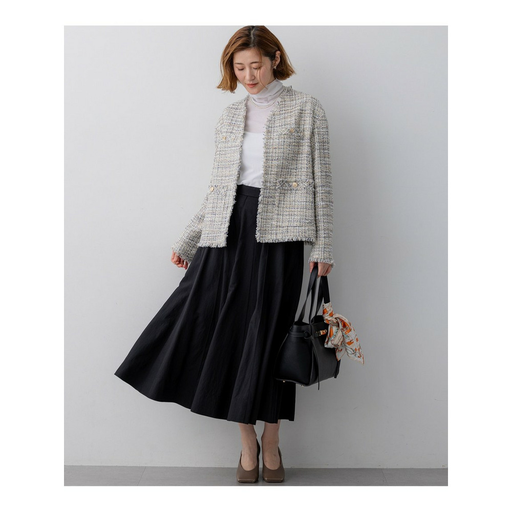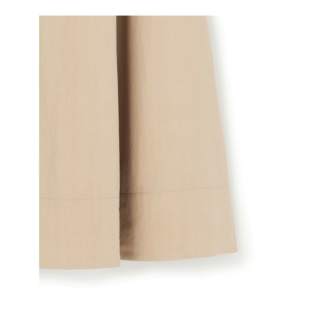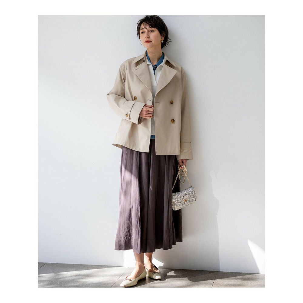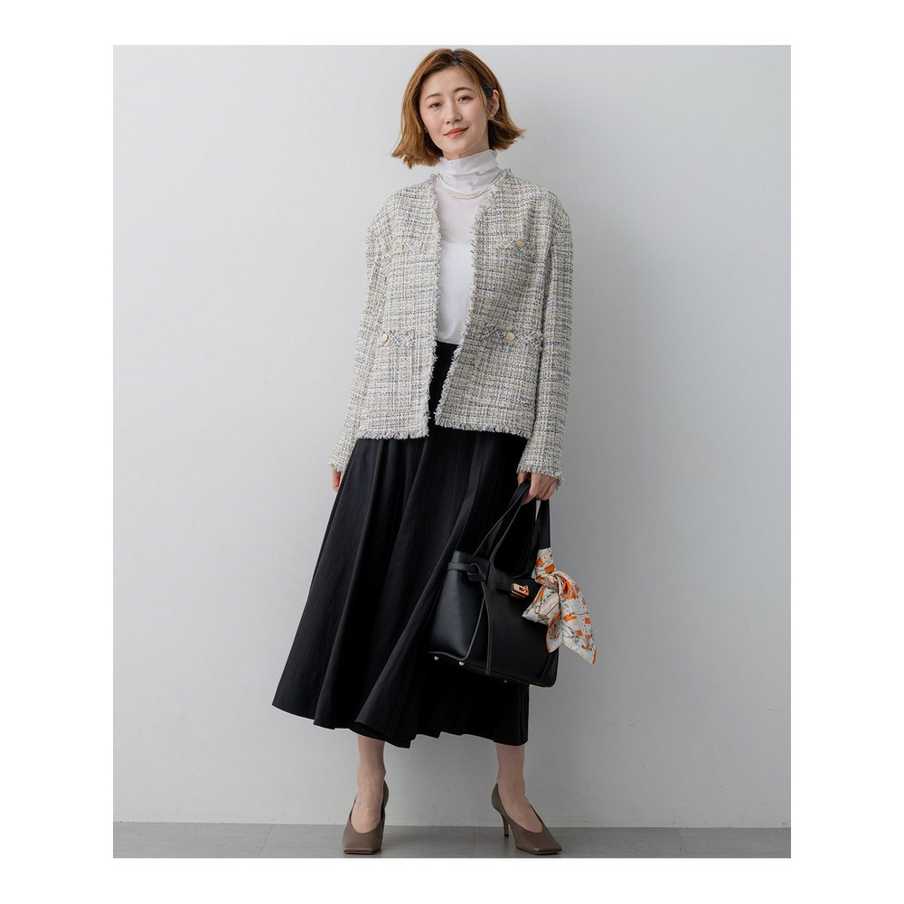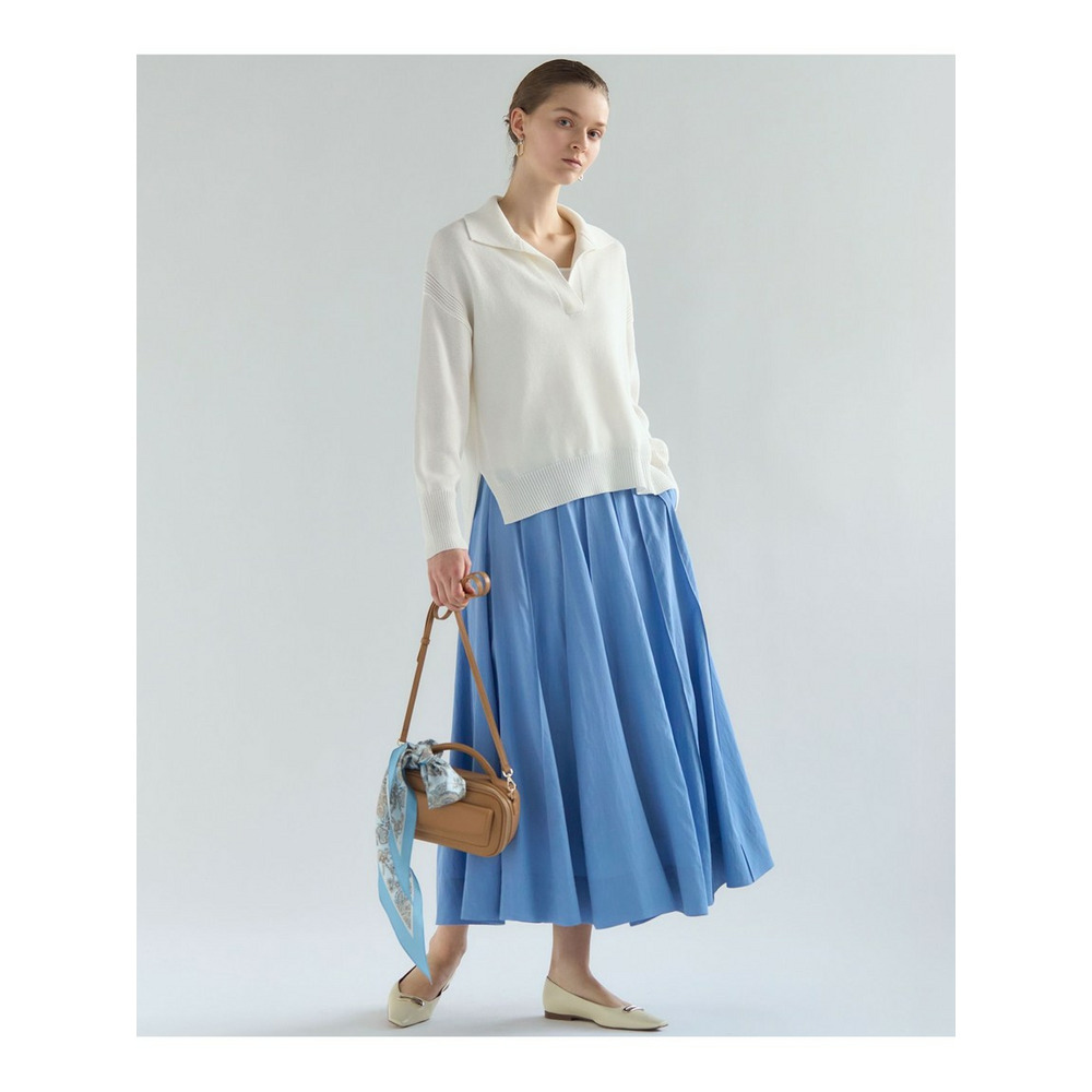 春らしい軽やかなボリューム感が魅力のフレアスカートです。腰回りはすっきりと見せつつ、裾に向かって優雅に広がるフレアラインが、女性らしい華やかさを添えます。ミモレ丈で長すぎないレングスはバランスがとりやすく、どんなトップスにも合わせやすい万能な一枚です。ブラウスと合わせてオフィススタイルに、Tシャツやニットと合わせてカジュアルダウンした休日スタイルにと、幅広いシーンで活躍します。足元はパンプスで上品に、スニーカーで抜け感を出すのもおすすめです。 カラーは、優しく上品な印象のベージュ(033)、爽やかで洗練されたサックス(072)、深みがあり落ち着いたブラウン(035)、着回し力抜群のシックなブラック(005)の4色展開です。