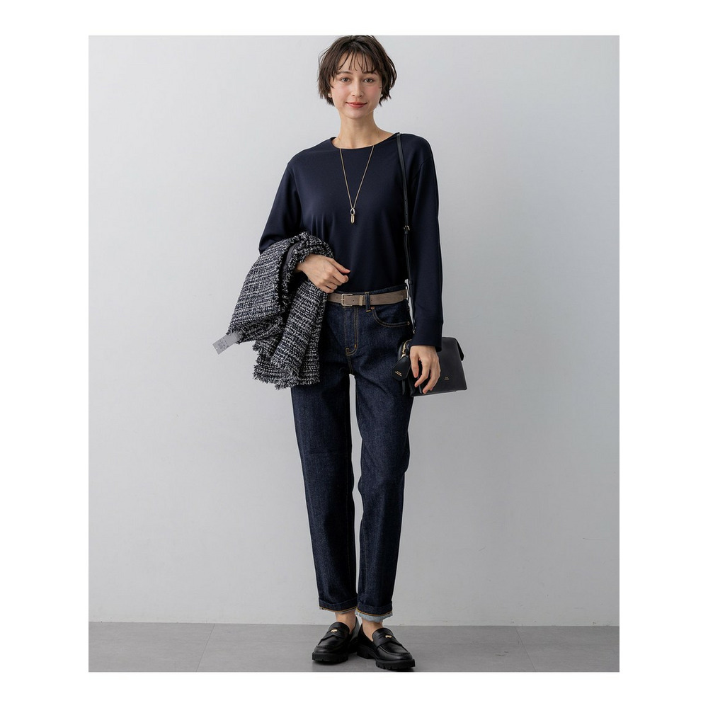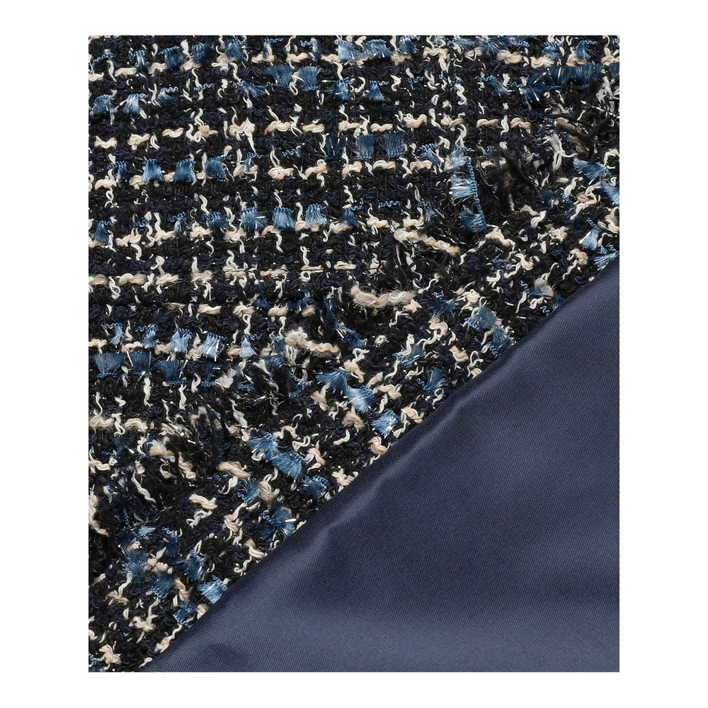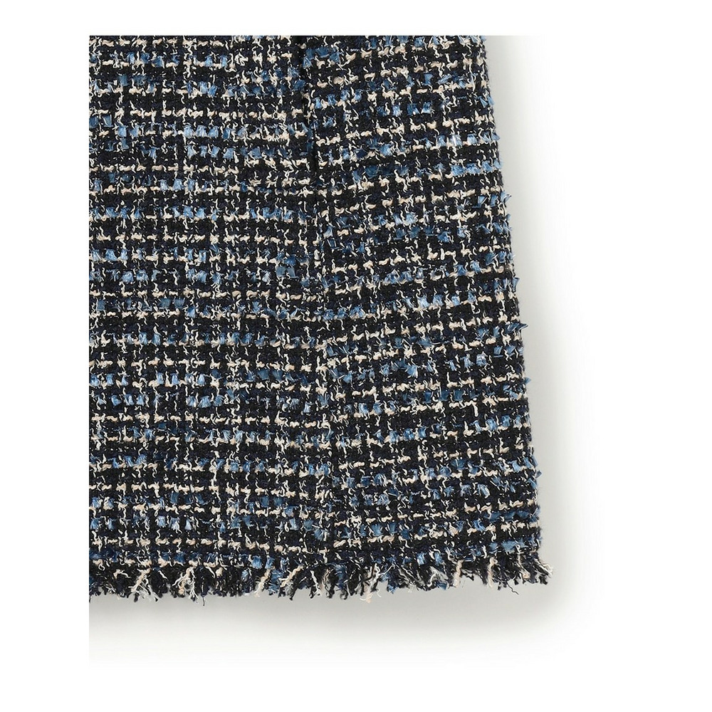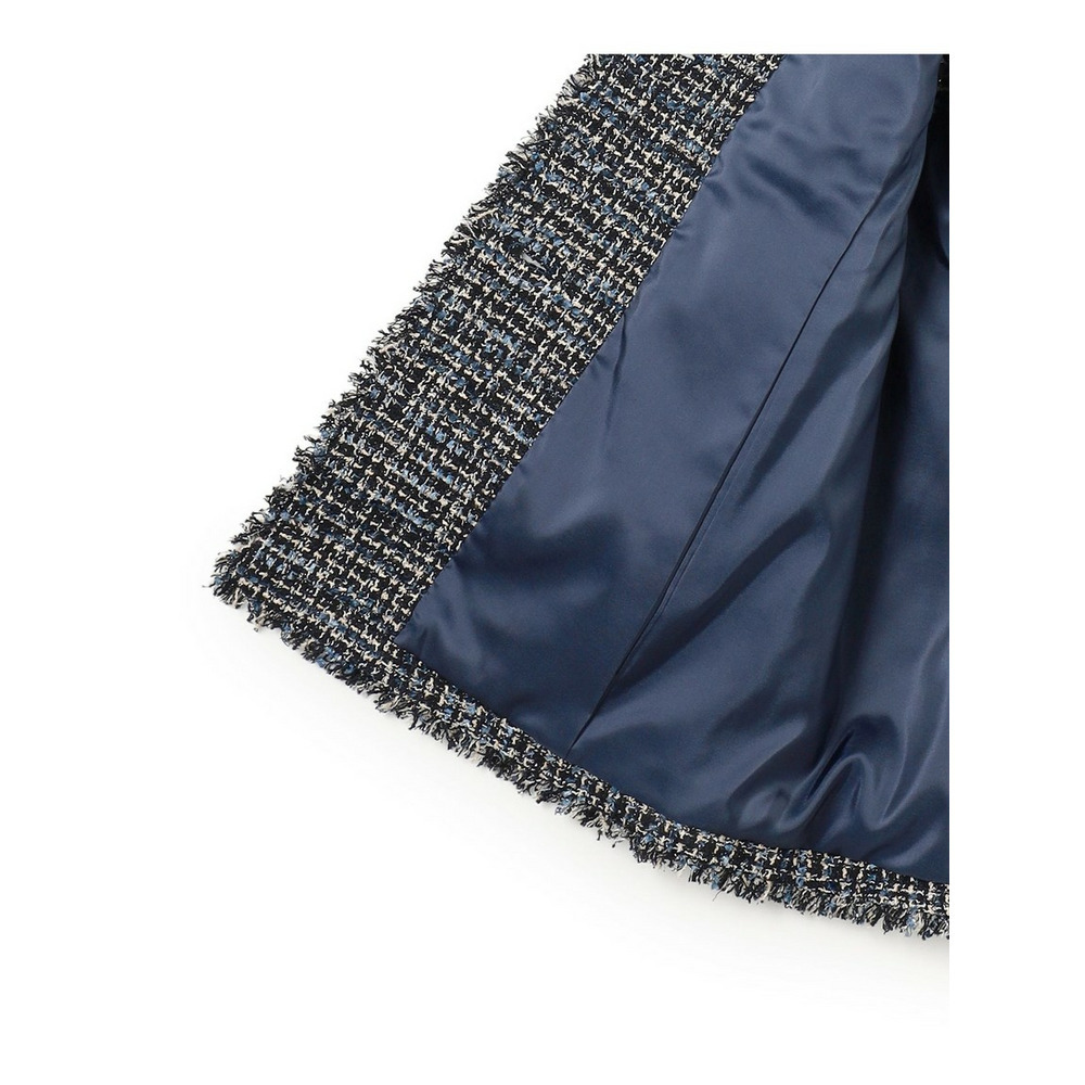 イタリア・プラトーの「GIOLICA」社による23区オリジナルツイード素材です。細番手の糸で構成されたベース組織に、異なる色合いのブークレ糸とラメ糸を織り込み、複雑で繊細な表情を生み出すことで、生地全体に深みのある色調と上品な輝きがプラスしています。表面に立体的な表情をもたらす特殊な糸で織りあげられた、高級感のあるツイードらしい凹凸感を引き立てています。