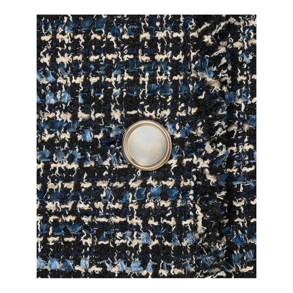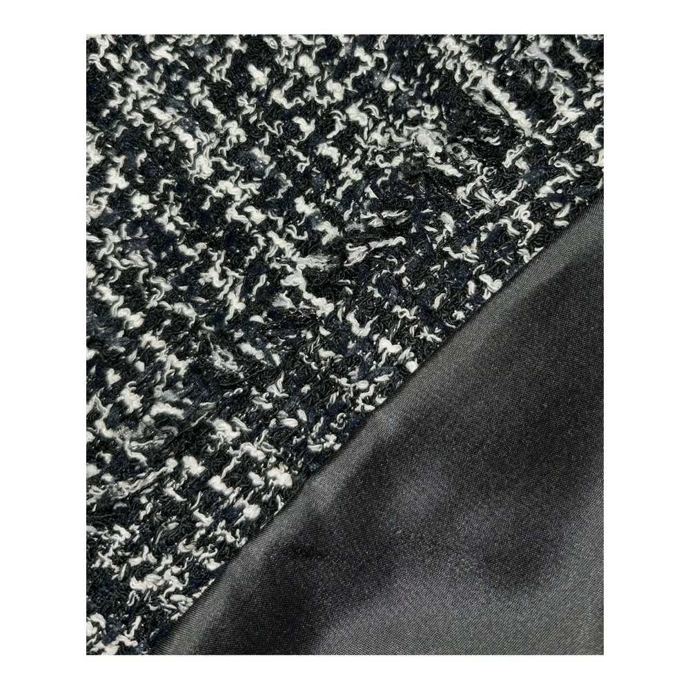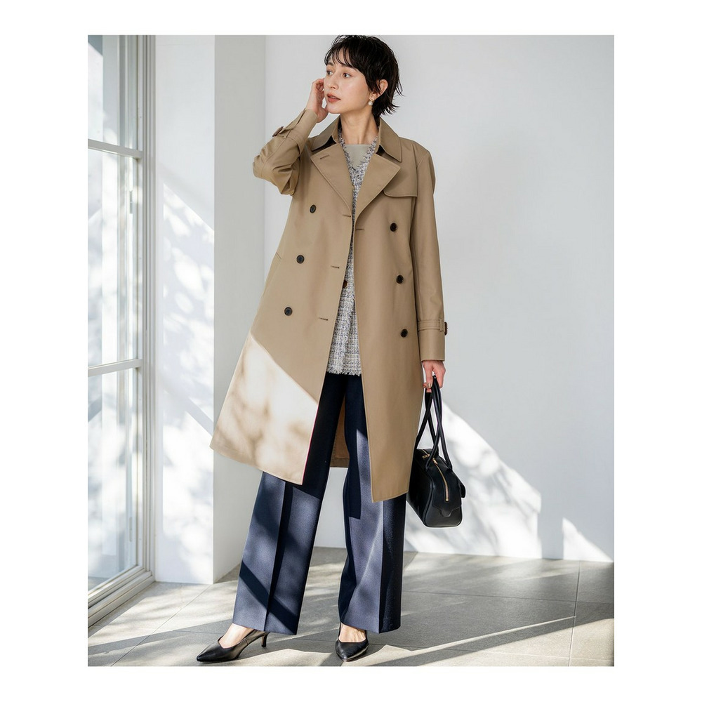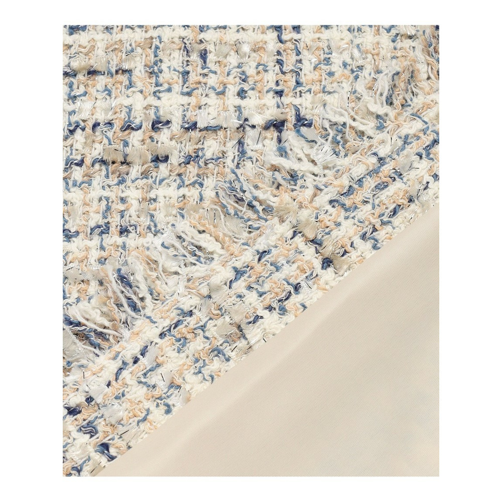 イタリア・プラトーの「GIOLICA」社による23区オリジナルツイード素材です。細番手の糸で構成されたベース組織に、異なる色合いのブークレ糸とラメ糸を織り込み、複雑で繊細な表情を生み出すことで、生地全体に深みのある色調と上品な輝きがプラスしています。表面に立体的な表情をもたらす特殊な糸で織りあげられた、高級感のあるツイードらしい凹凸感を引き立てています。