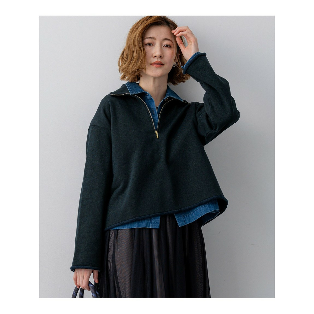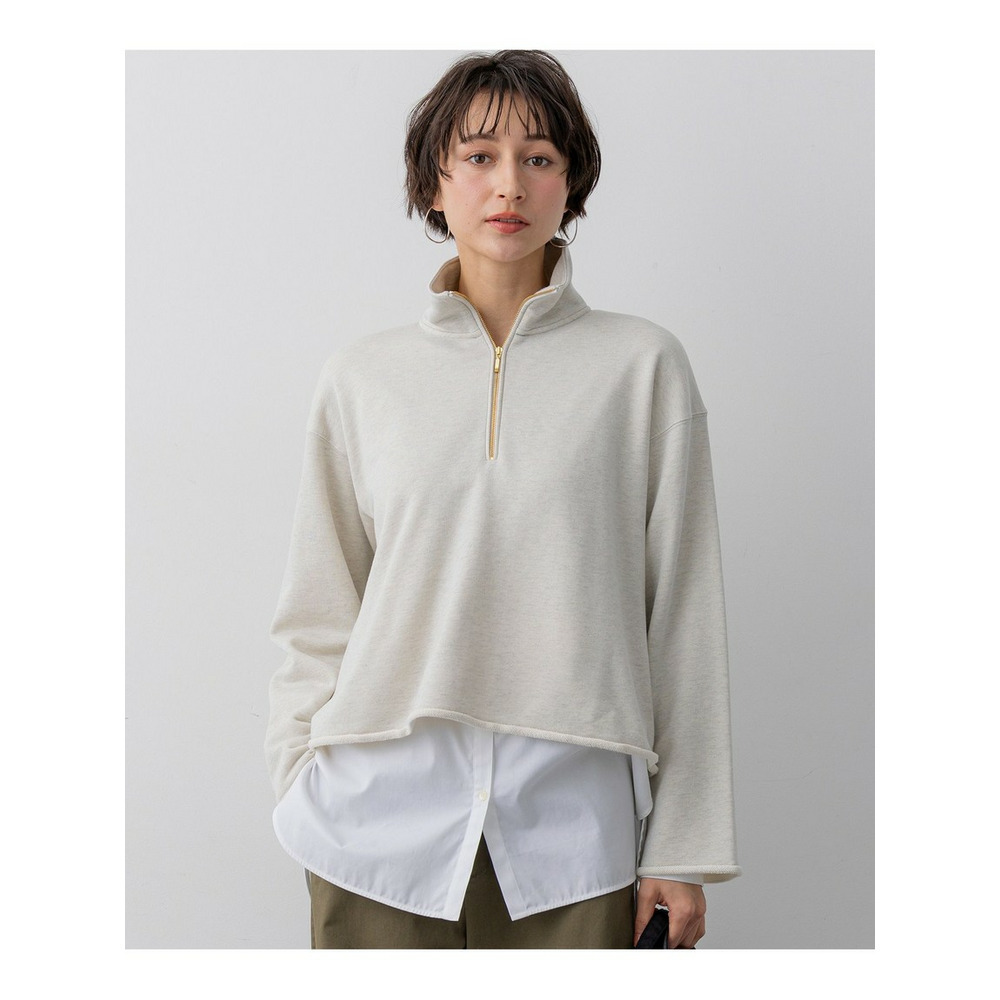 ハーフジップが今季らしいトレンド感を演出するプルオーバーです。襟元を開けてインナーを見せるレイヤードスタイルがおすすめで、シャツやタートルネックを覗かせると、よりこなれた印象に仕上がります。袖口と裾は断ち切り風のラフな仕様にすることで、抜け感をプラスしました。ゆったりとしたシルエットながらも、上品な素材感でカジュアルになりすぎず、大人の女性にぴったりの一枚です。 カラーは、クリーンで上品な印象のアイボリー(#002)と、シックで着回し力の高いネイビー(#075)の2色展開です。