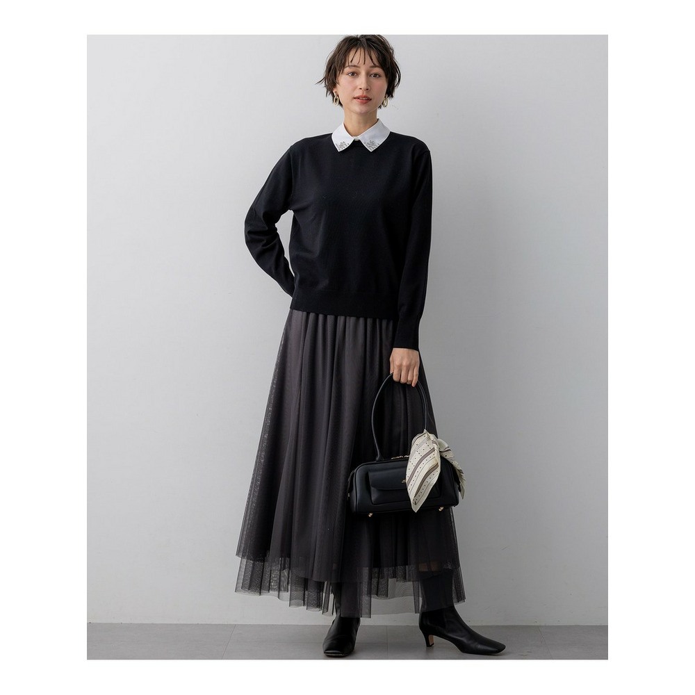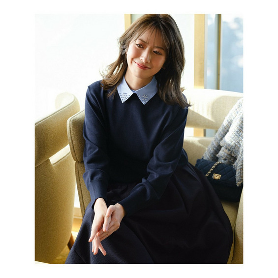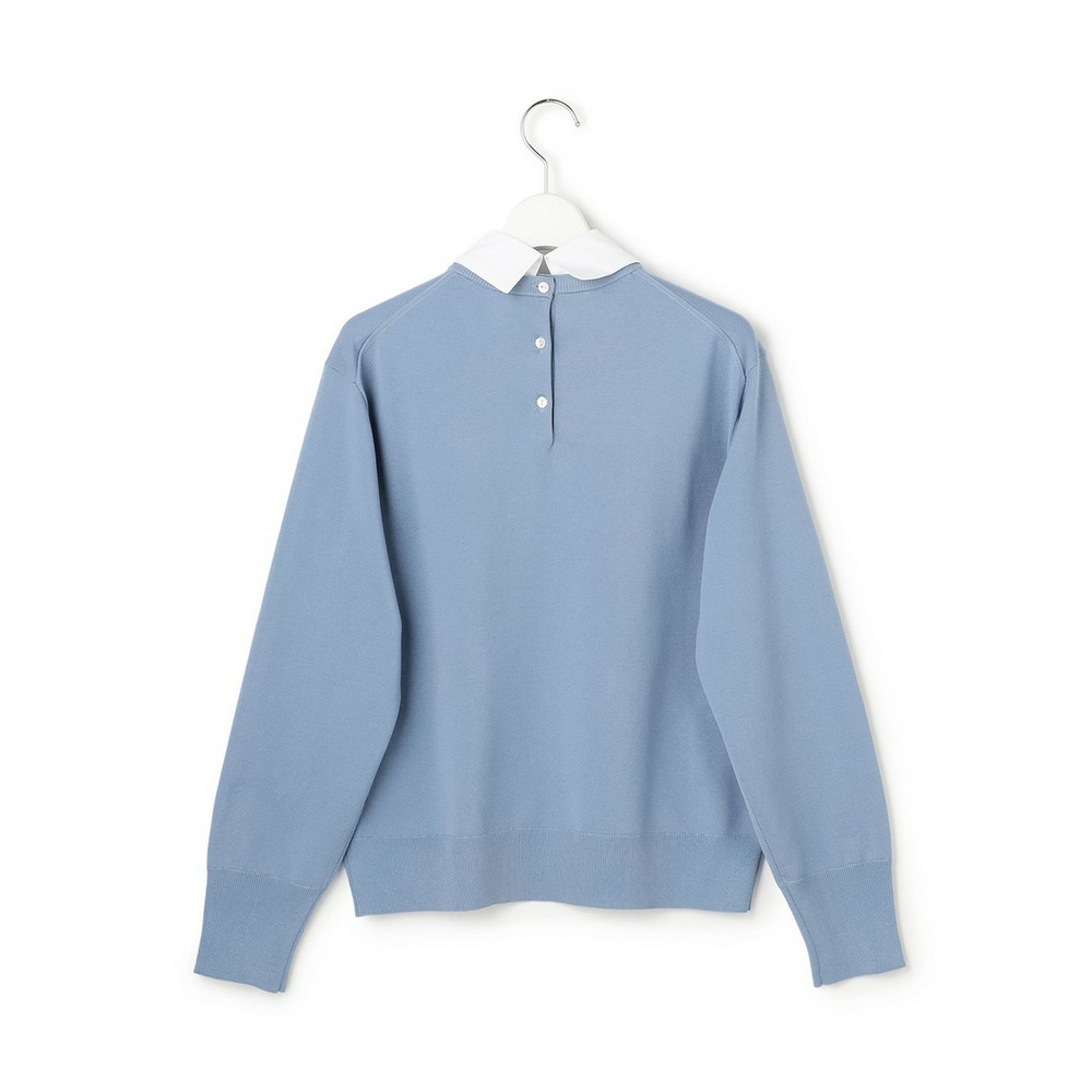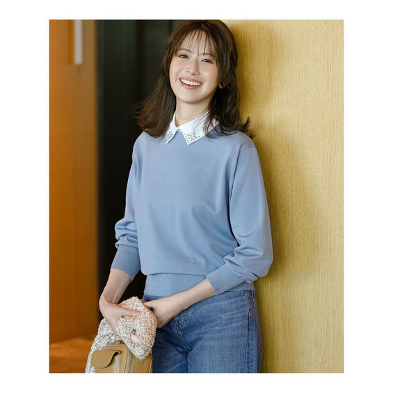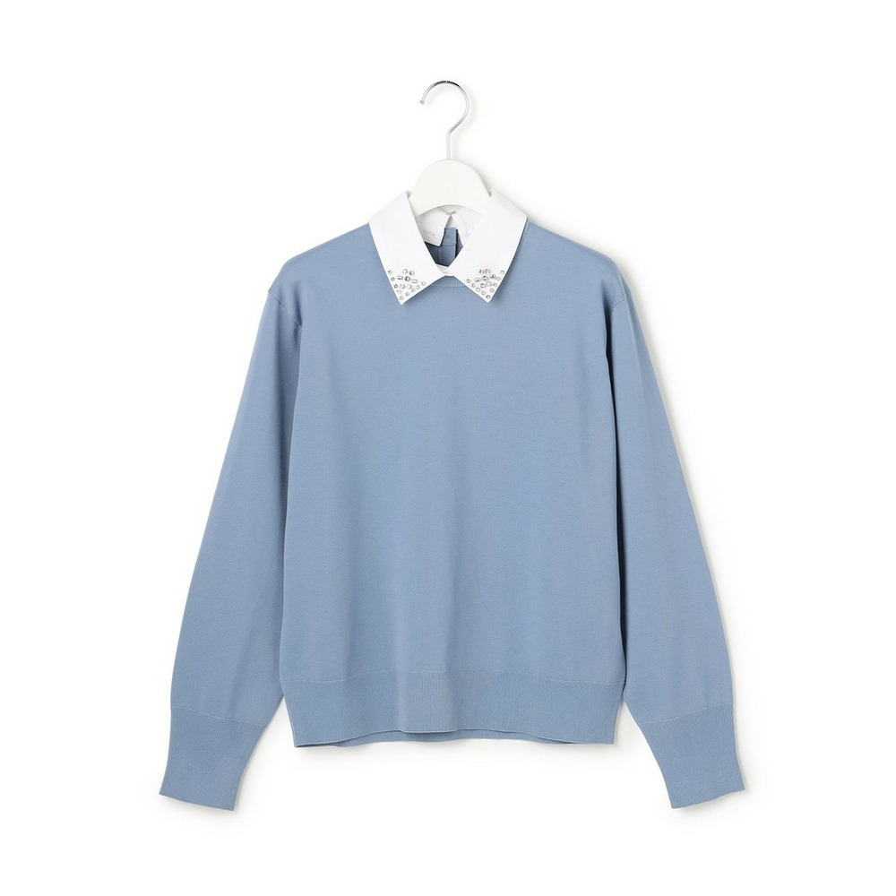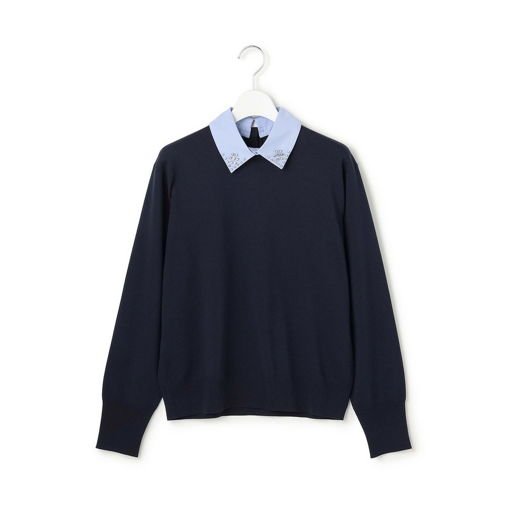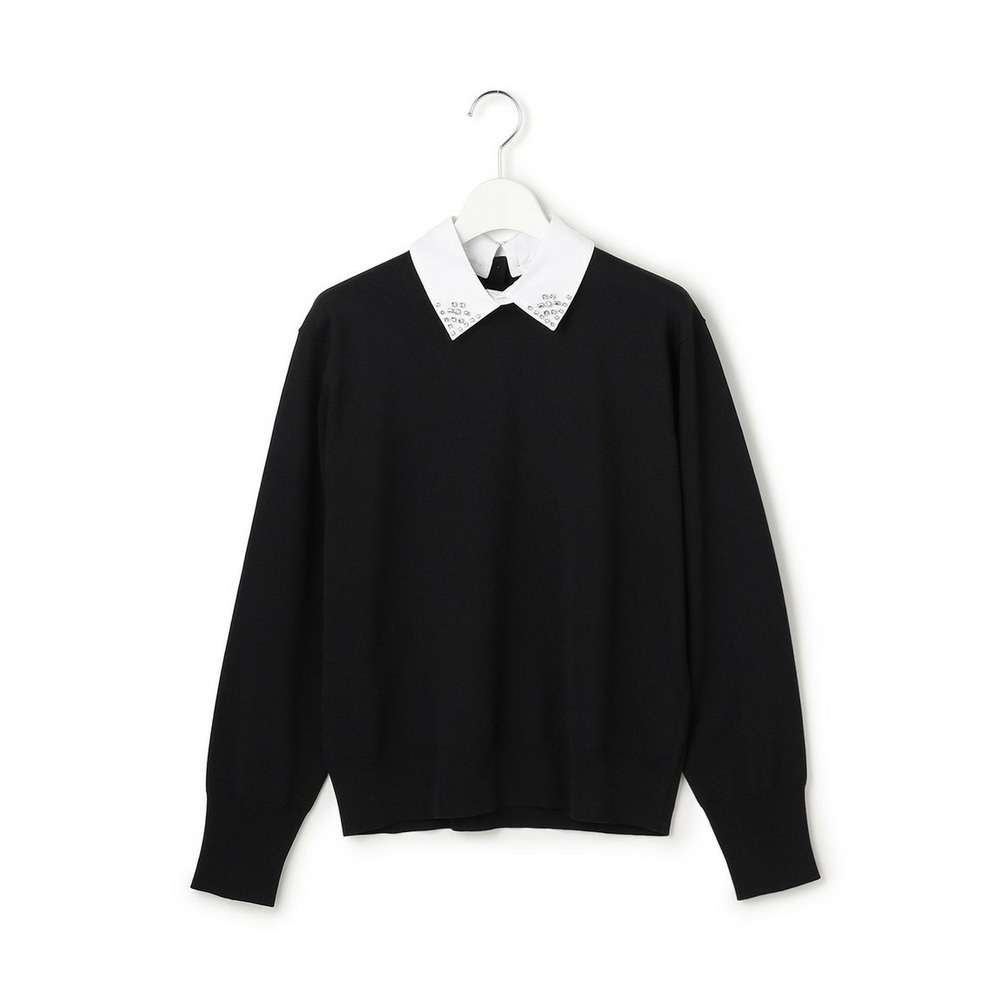 まるでブラウスを重ね着しているかのような、布帛の襟がドッキングされたニットプルオーバーです。襟の先端には繊細なビジューがあしらわれ、顔周りを華やかに彩ります。襟は取り外しが可能で、シンプルなクルーネックニットとしてもお楽しみいただける2WAY仕様です。身頃はストレッチ糸を一緒に編み込んだ天竺編みで、着心地の良さも追求しました。後ろは開閉できる仕様になっており、着脱のしやすさもポイントです。 オフィススタイルにはもちろん、デニムと合わせてカジュアルダウンしたり、きれいめスカートと合わせてお食事会にも。幅広いシーンで上品な着こなしを叶えます。 カラーは、シックなブラック(#005)、爽やかなスカイブルー(#072)、そして知的な印象のネイビー(#075)の3色展開で、ブラックとスカイブルーには清潔感のあるオフの襟を配し、ネイビーには爽やかなサックスの襟を配しました。