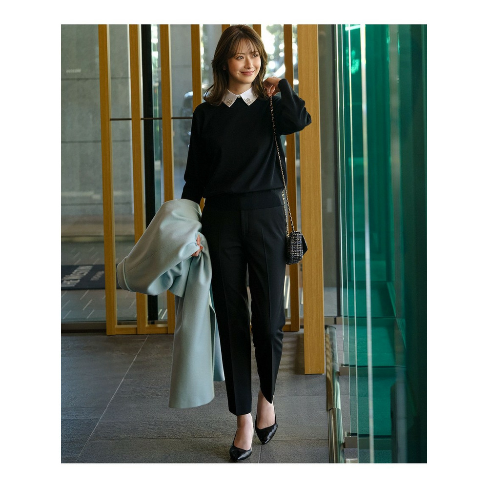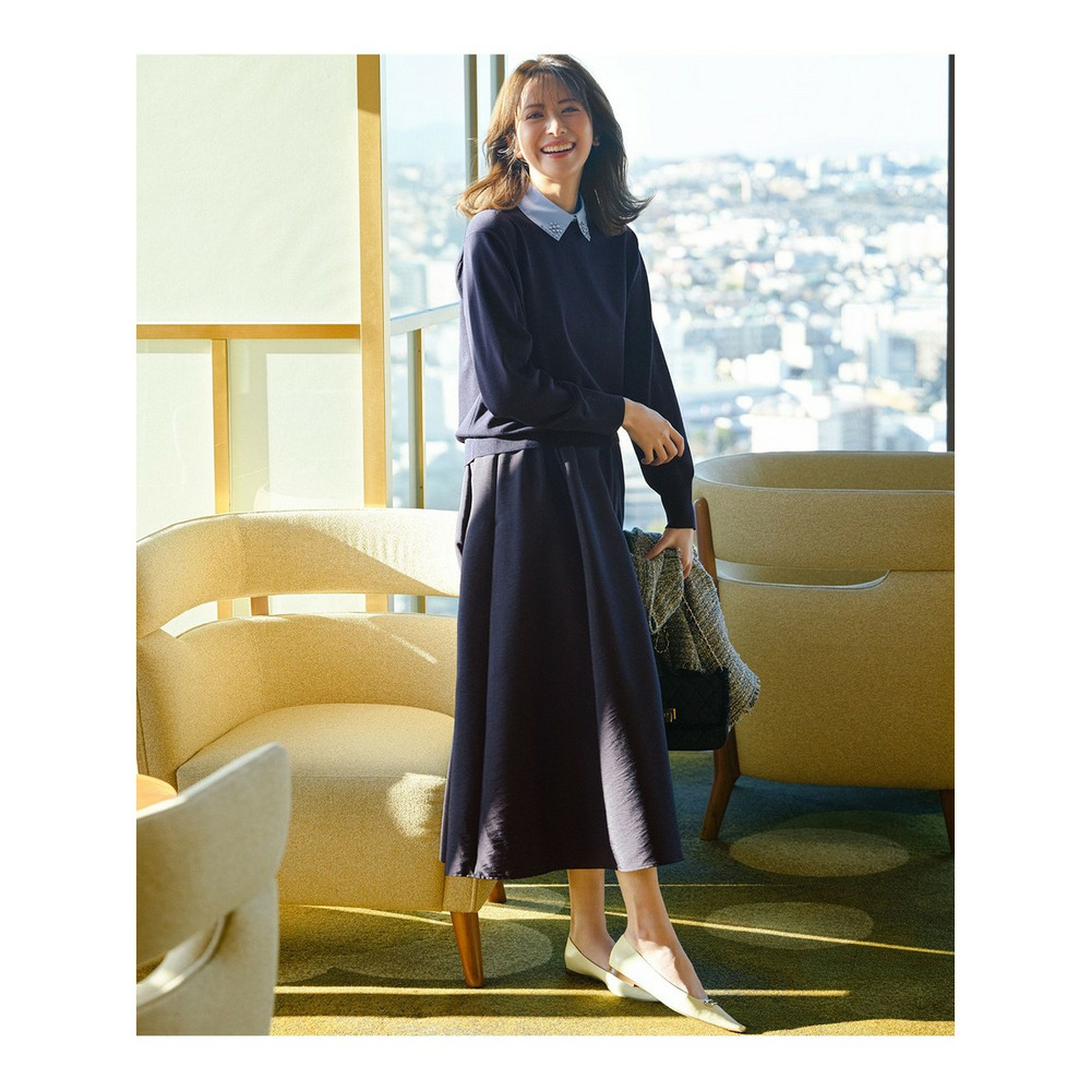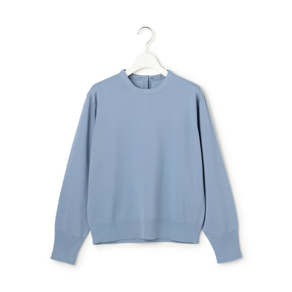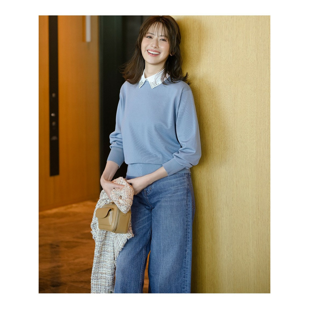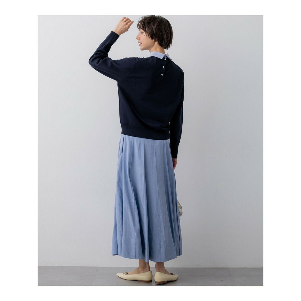 まるでブラウスを重ね着しているかのような、布帛の襟がドッキングされたニットプルオーバーです。襟の先端には繊細なビジューがあしらわれ、顔周りを華やかに彩ります。襟は取り外しが可能で、シンプルなクルーネックニットとしてもお楽しみいただける2WAY仕様です。身頃はストレッチ糸を一緒に編み込んだ天竺編みで、着心地の良さも追求しました。後ろは開閉できる仕様になっており、着脱のしやすさもポイントです。 オフィススタイルにはもちろん、デニムと合わせてカジュアルダウンしたり、きれいめスカートと合わせてお食事会にも。幅広いシーンで上品な着こなしを叶えます。 カラーは、シックなブラック(#005)、爽やかなスカイブルー(#072)、そして知的な印象のネイビー(#075)の3色展開で、ブラックとスカイブルーには清潔感のあるオフの襟を配し、ネイビーには爽やかなサックスの襟を配しました。