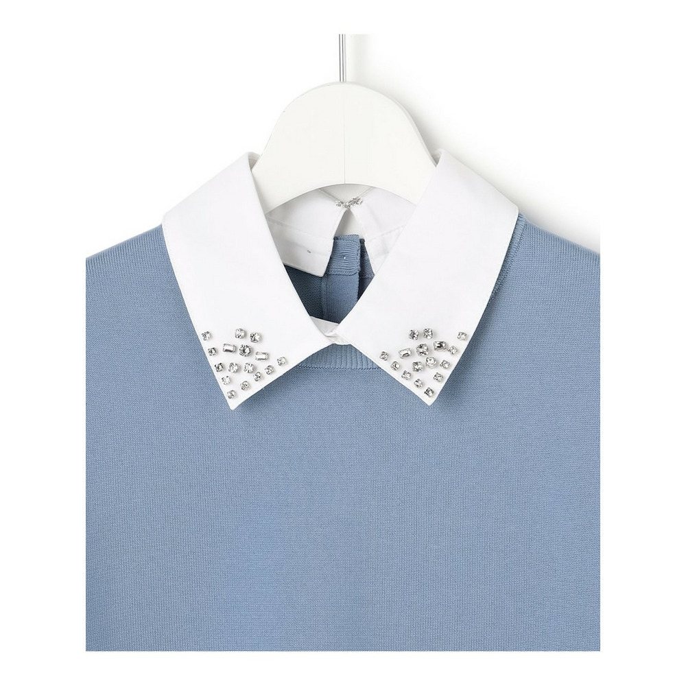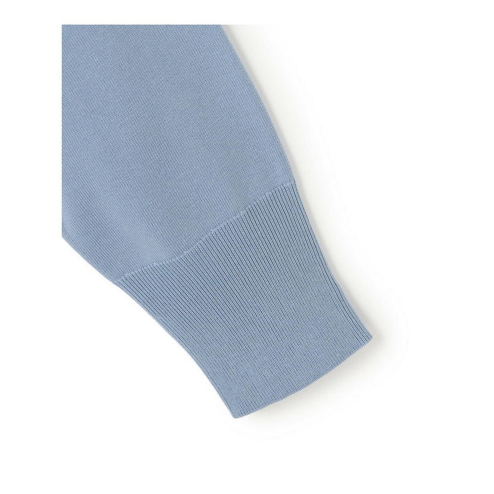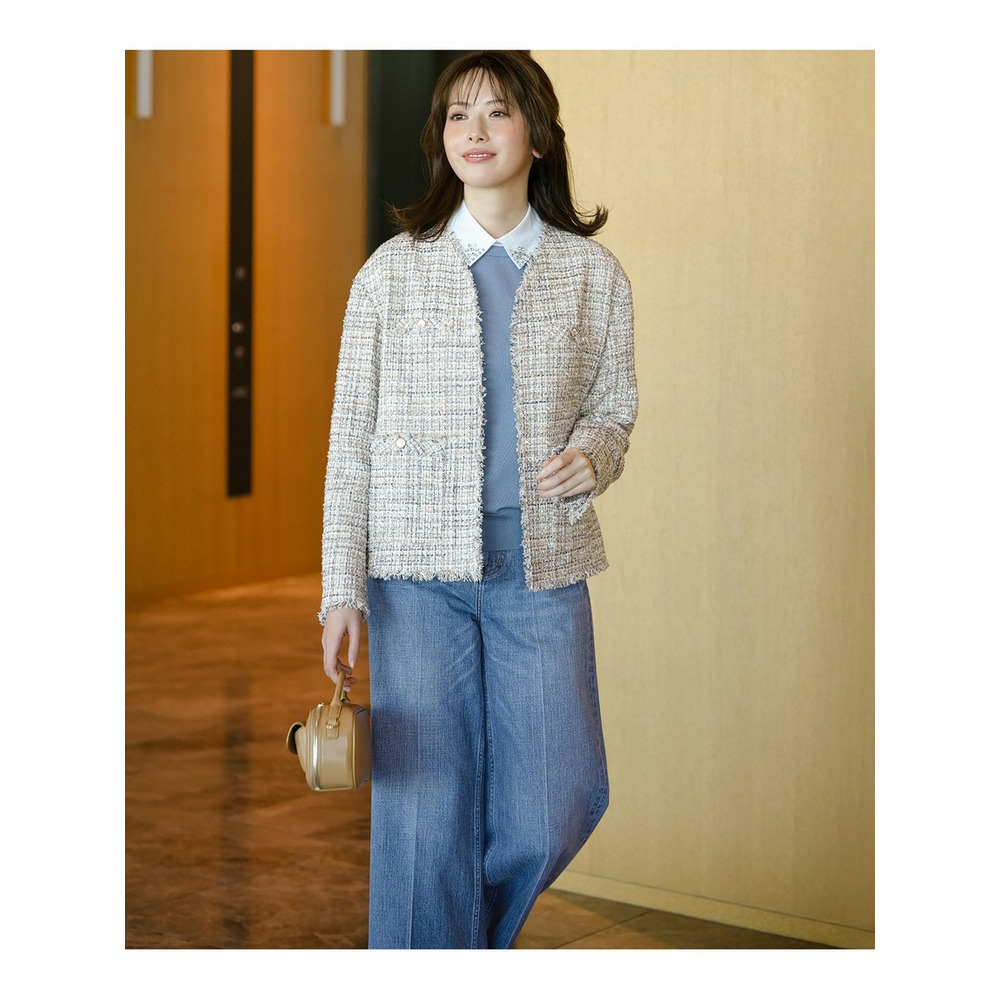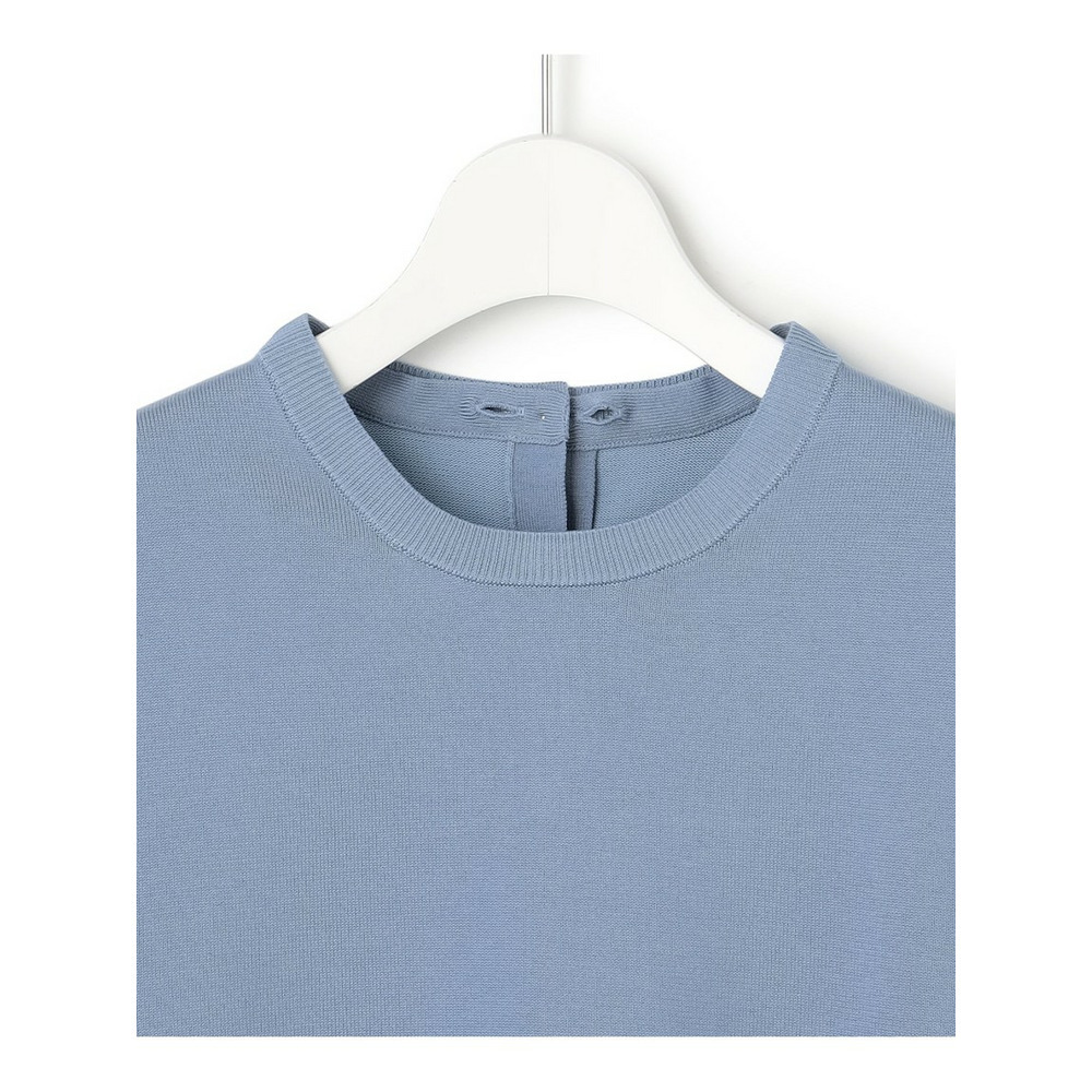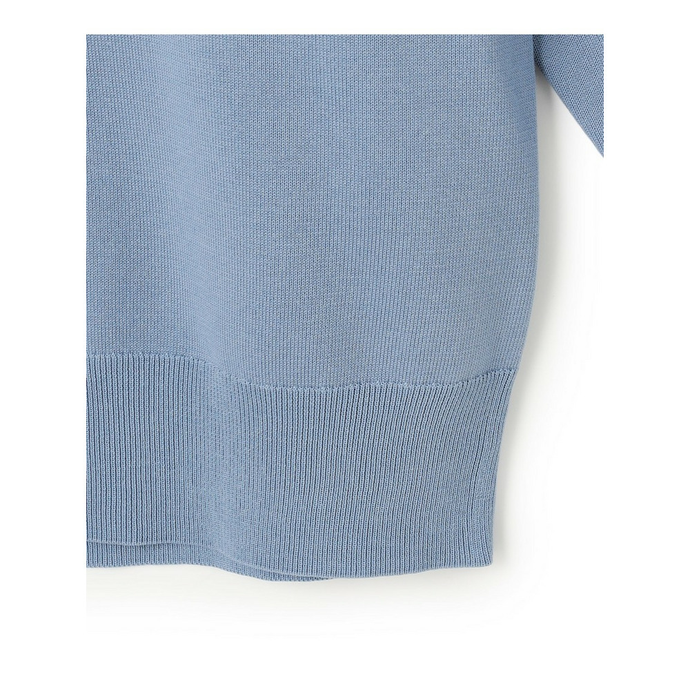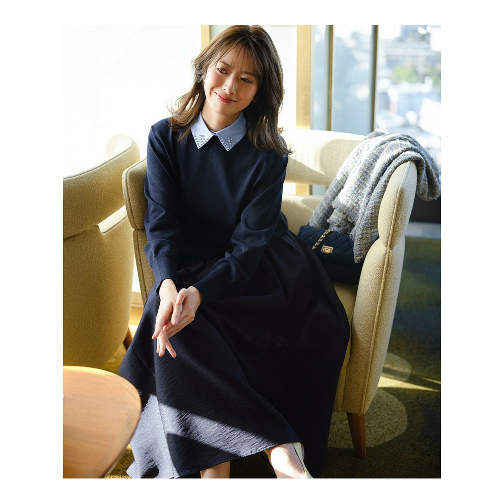 まるでブラウスを重ね着しているかのような、布帛の襟がドッキングされたニットプルオーバーです。襟の先端には繊細なビジューがあしらわれ、顔周りを華やかに彩ります。襟は取り外しが可能で、シンプルなクルーネックニットとしてもお楽しみいただける2WAY仕様です。身頃はストレッチ糸を一緒に編み込んだ天竺編みで、着心地の良さも追求しました。後ろは開閉できる仕様になっており、着脱のしやすさもポイントです。 オフィススタイルにはもちろん、デニムと合わせてカジュアルダウンしたり、きれいめスカートと合わせてお食事会にも。幅広いシーンで上品な着こなしを叶えます。 カラーは、シックなブラック(#005)、爽やかなスカイブルー(#072)、そして知的な印象のネイビー(#075)の3色展開で、ブラックとスカイブルーには清潔感のあるオフの襟を配し、ネイビーには爽やかなサックスの襟を配しました。
