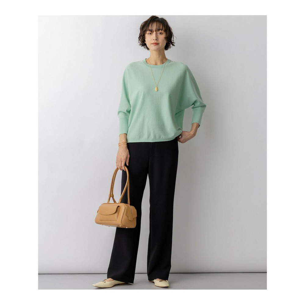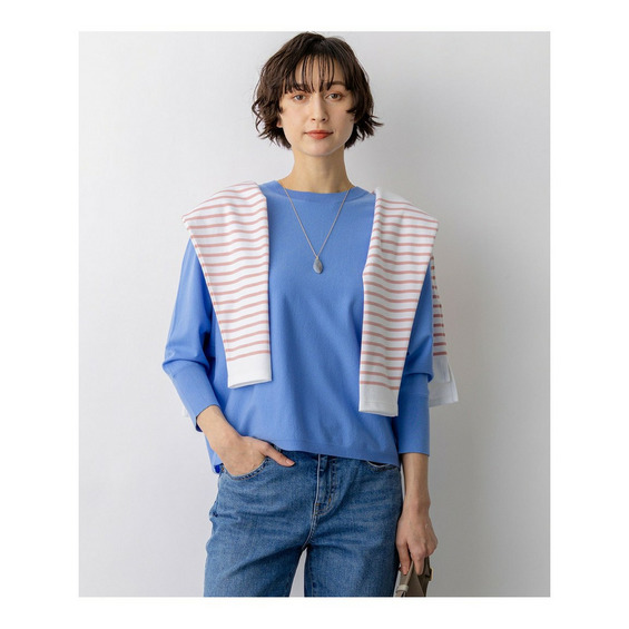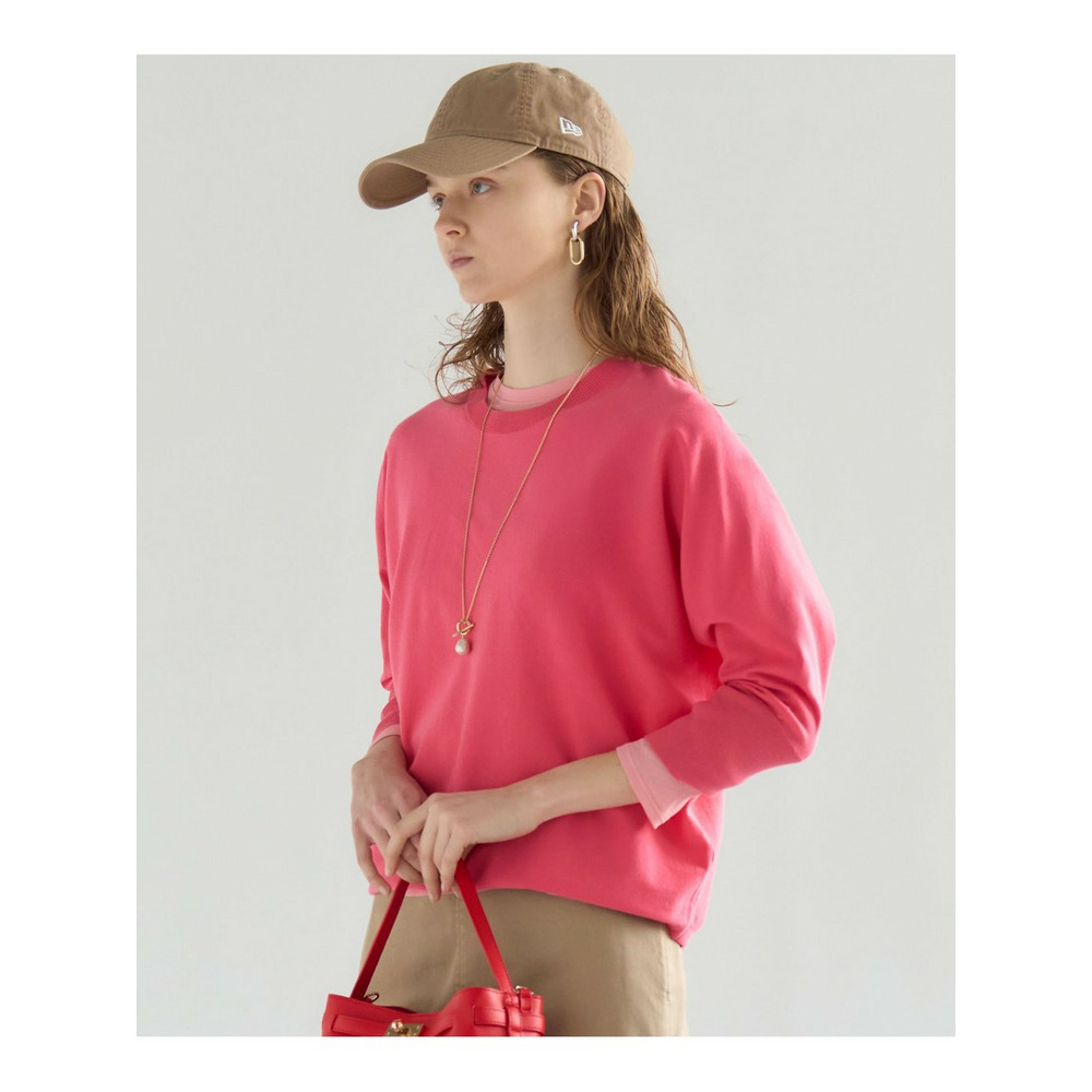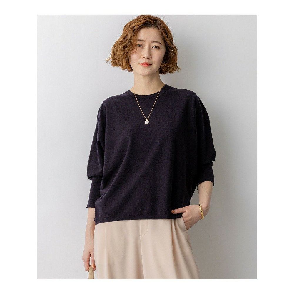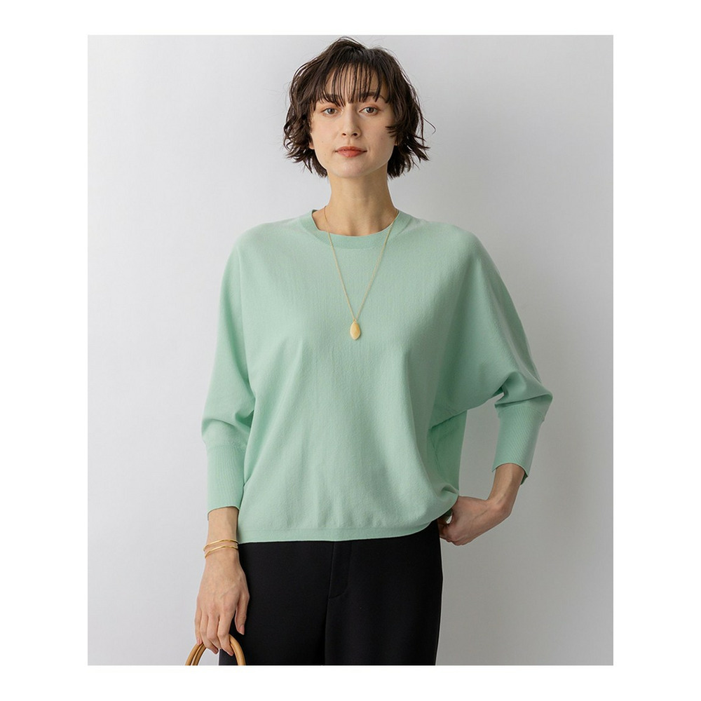 天竺編みですっきりと仕上げた、7分袖のクルーネックドルマンプルオーバーです。ゆったりとしたドルマンスリーブのデザインが、体のラインを拾いすぎず、リラックス感のある着心地と体型カバーを同時に叶えます。裾には前後の長さに変化をつけているため、そのまま着るのはもちろん、襟元を少し後ろに抜いて着用していただくと、デコルテ周りがすっきりと見え、より女性らしく柔らかな印象を演出できます。 袖口に施したスリットが手元のさりげないアクセントになり、時計やブレスレットなどのアクセサリーも映えるデザインです。シンプルなボトムスに合わせるだけで洗練されたスタイリングが完成し、きれいめパンツと合わせればオフィスシーンに、デニムやフレアスカートと合わせれば休日のカジュアルスタイルにと、幅広いシーンで活躍します。 カラーは、着回し力抜群で上品なアイボリー(#002)、コーディネートの主役になる華やかなコーラル(#011)、トレンド感のある落ち着いたスモーキーグリーン(#063)、爽やかで清潔感のあるスカイブルー(#072)、シーンを問わず使える知的なネイビー(#075)の5色展開です。