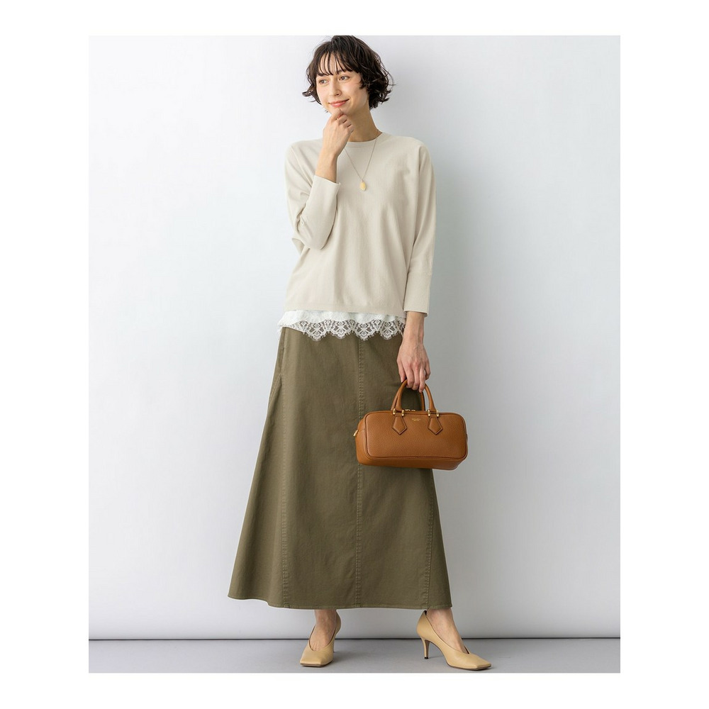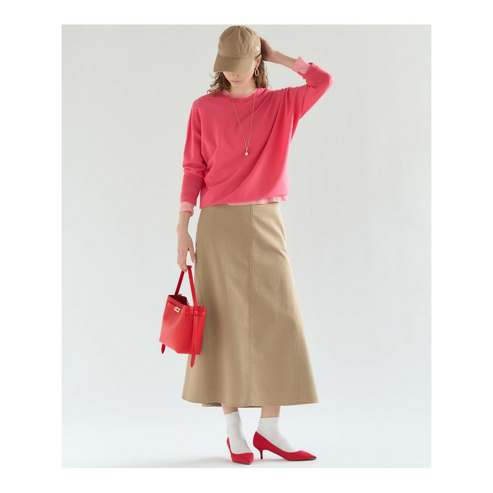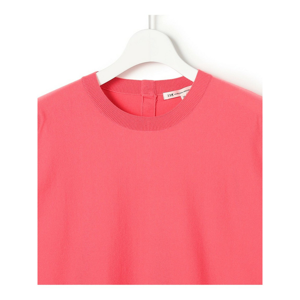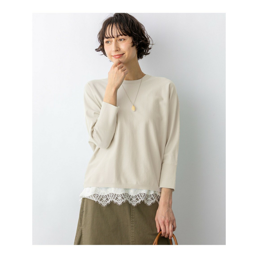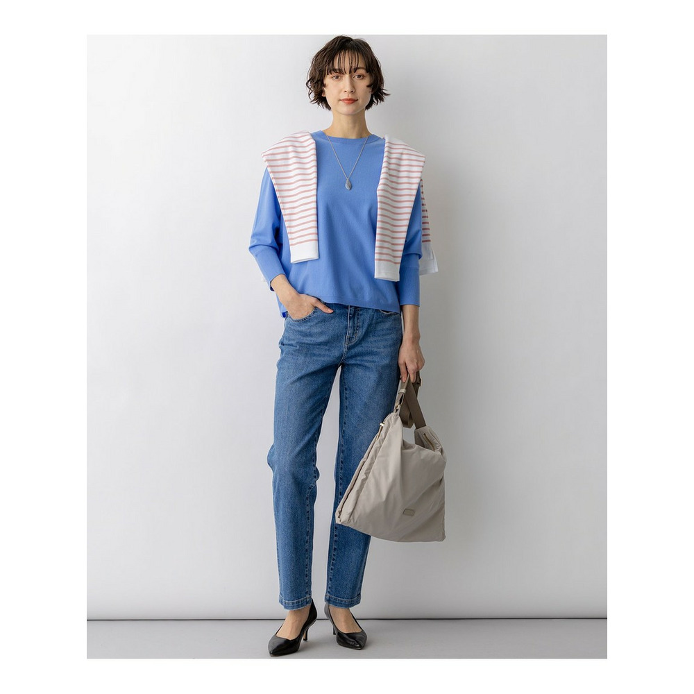 天竺編みですっきりと仕上げた、7分袖のクルーネックドルマンプルオーバーです。ゆったりとしたドルマンスリーブのデザインが、体のラインを拾いすぎず、リラックス感のある着心地と体型カバーを同時に叶えます。裾には前後の長さに変化をつけているため、そのまま着るのはもちろん、襟元を少し後ろに抜いて着用していただくと、デコルテ周りがすっきりと見え、より女性らしく柔らかな印象を演出できます。 袖口に施したスリットが手元のさりげないアクセントになり、時計やブレスレットなどのアクセサリーも映えるデザインです。シンプルなボトムスに合わせるだけで洗練されたスタイリングが完成し、きれいめパンツと合わせればオフィスシーンに、デニムやフレアスカートと合わせれば休日のカジュアルスタイルにと、幅広いシーンで活躍します。 カラーは、着回し力抜群で上品なアイボリー(#002)、コーディネートの主役になる華やかなコーラル(#011)、トレンド感のある落ち着いたスモーキーグリーン(#063)、爽やかで清潔感のあるスカイブルー(#072)、シーンを問わず使える知的なネイビー(#075)の5色展開です。
