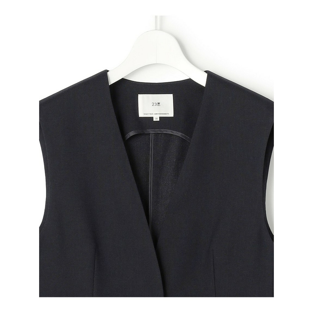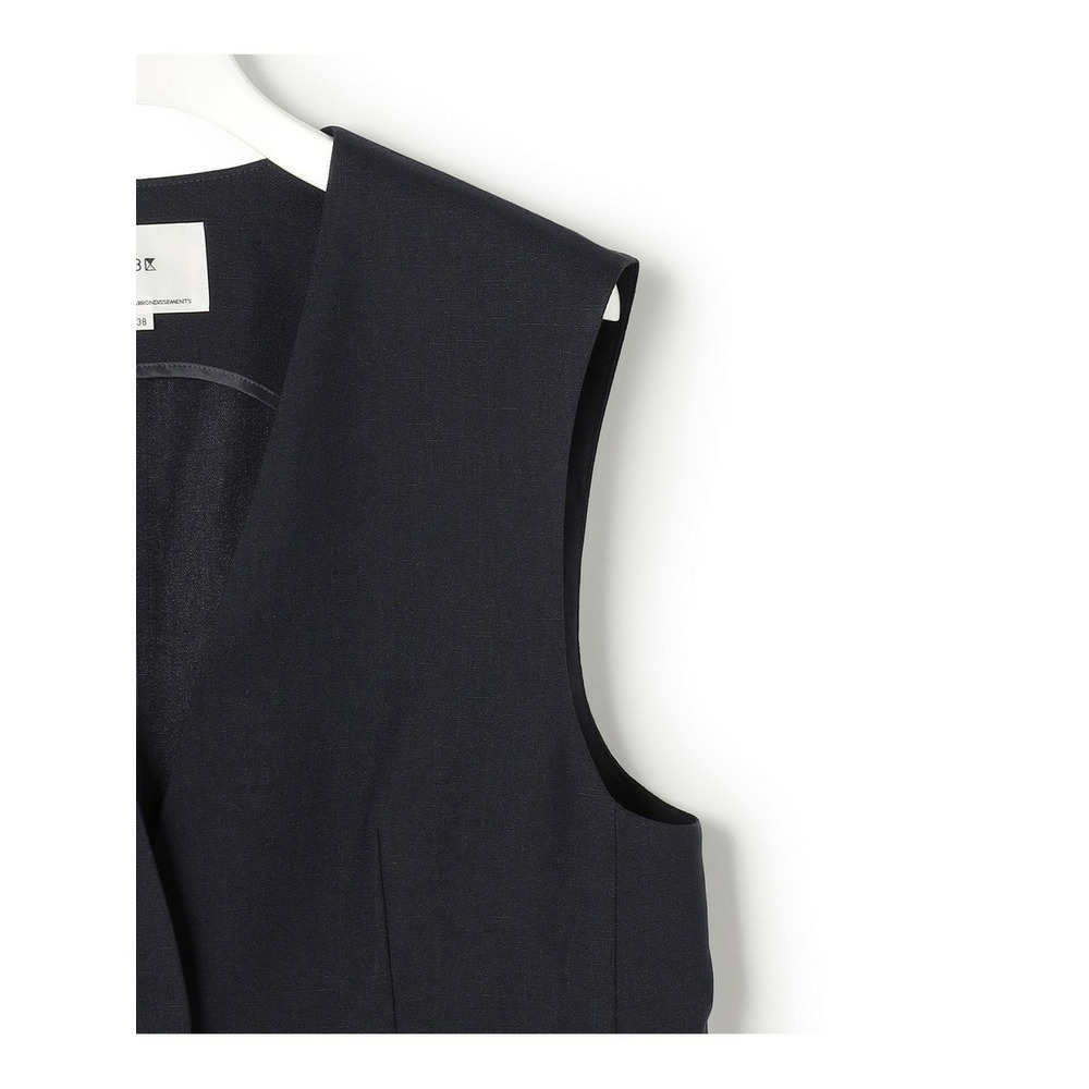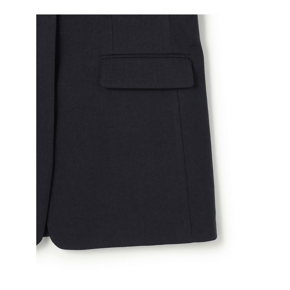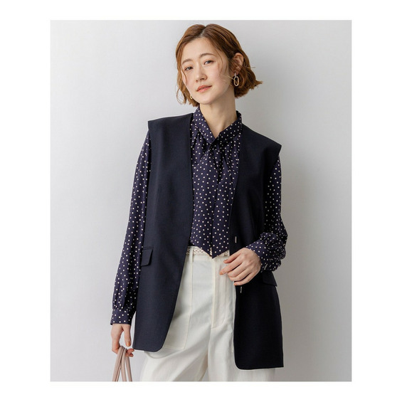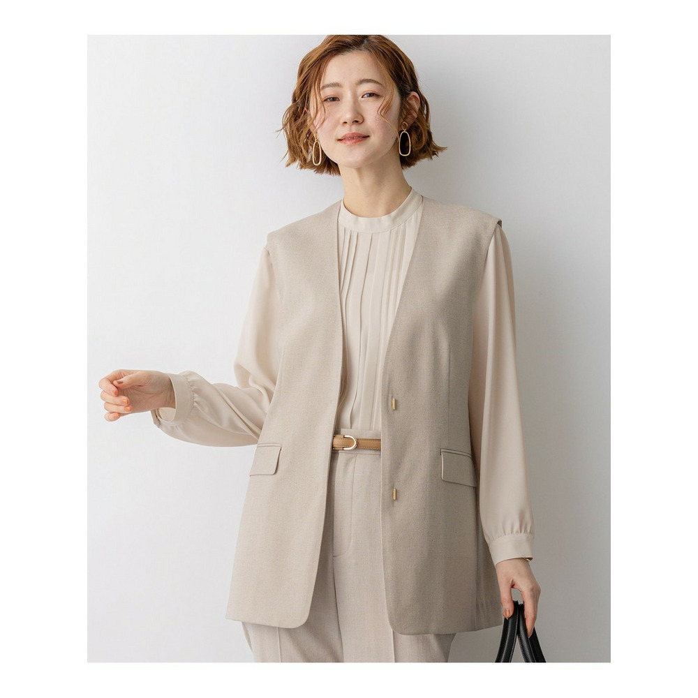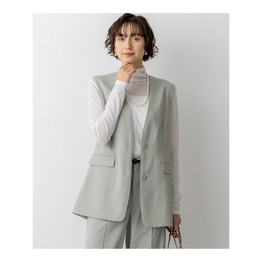 麻のようなナチュラルな風合いが魅力のノーカラージレです。フロントの開閉はホック仕様になっており、留めても開けても上品な印象を保ちます。ちらりと覗くゴールドパーツが、さりげないアクセントとなり、着こなしに華を添えます。 同素材のパンツと合わせれば、洗練されたセットアップスタイルが完成し、オフィスシーンにも最適です。また、Tシャツやブラウスにデニムやワイドパンツを合わせたカジュアルなスタイルに羽織るだけで、ぐっとこなれた印象に。幅広いコーディネートに活躍する、着回し力抜群の一着です。 カラーは、上品で洗練された印象のライトグレー(#003)、やわらかくどんなスタイルにも馴染む万能カラーのベージュ(#033)、知的で落ち着いた印象でビジネスシーンにも最適なネイビー(#075)の3色展開です。