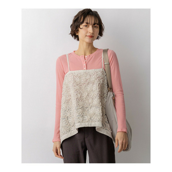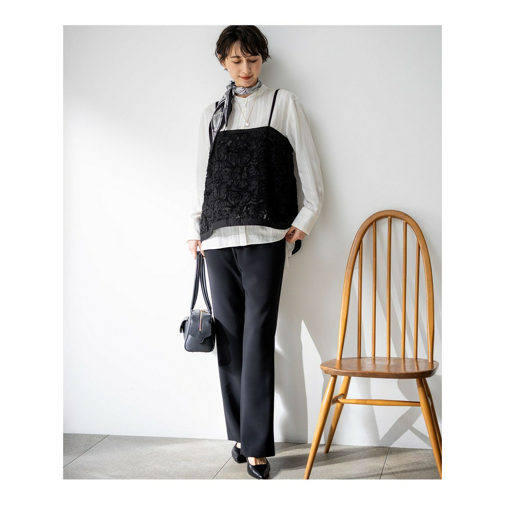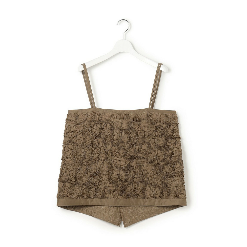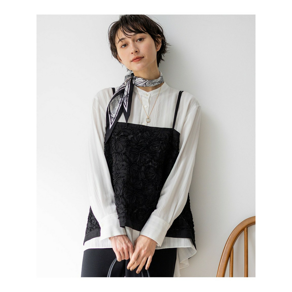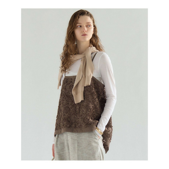 23区オリジナルの刺繍柄が目を引く、存在感のあるキャミソールです。透け感のあるポリエステル生地を細いテープ状にカットし、フリルのように立体的に刺繍した、他にはない華やかなデザインが魅力です。肩紐はボタンとホールで長さの調整が可能ですので、中に合わせるインナーや、お好みのバランスに合わせて着こなしをお楽しみいただけます。シンプルなシャツやブラウス、カットソーの上に重ねるだけで、いつものコーディネートが華やかにアップデートされます。デニムと合わせてカジュアルダウンしたり、きれいめパンツやスカートと合わせてオフィススタイルやお食事会など、幅広いシーンで上品な着こなしをお楽しみいただけます。カラーは、シックで上品な印象のブラック(#005)、落ち着いた大人の雰囲気を醸し出すブラウン(#030)、そして柔らかな印象を与えるベージュ(#033)の3色をご用意いたしました。