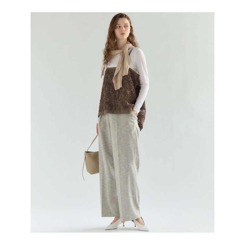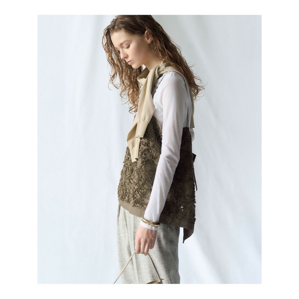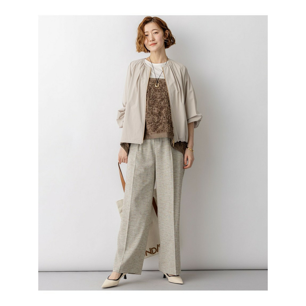 透け感のあるポリエステル生地を細いテープ状にカットし、フリルのように立体的に刺繍した、23区オリジナルの特別な素材を使用しています。シャリ感のある涼しげな透け素材を組み合わせることで、見た目のボリューム感とは裏腹に、軽やかな着心地を実現しました。肌に触れる部分もさらりとしており、快適にお召しいただけます。