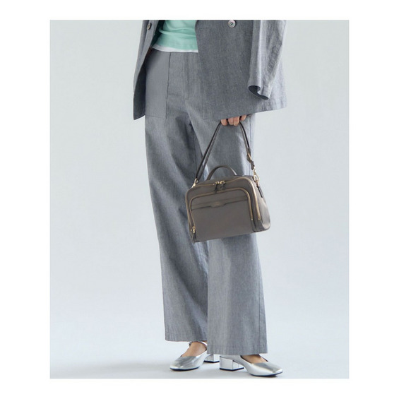 ■素材23区オリジナルのスラブツイルストレッチ素材を使用しています。リネン特有のナチュラルな表情と、ポリエステルの持つしわになりにくい機能性、さらにコットンポリウレタンのストレッチ性を兼ね備えたこだわりの生地です。綾織りの美しい表情が特徴で、柔らかすぎない適度な張り感と弾力、そしてさらりとしたドライな肌触りが魅力。昨年よりもさらに柔らかく、深みのあるシャンブレーの色合いが美しく表現されるよう改良を重ねました。リネン特有の繊維の節(麻カス)も出にくいように工夫されており、上品な見た目と快適な着心地を両立しています。