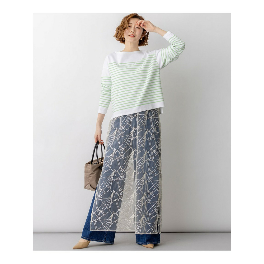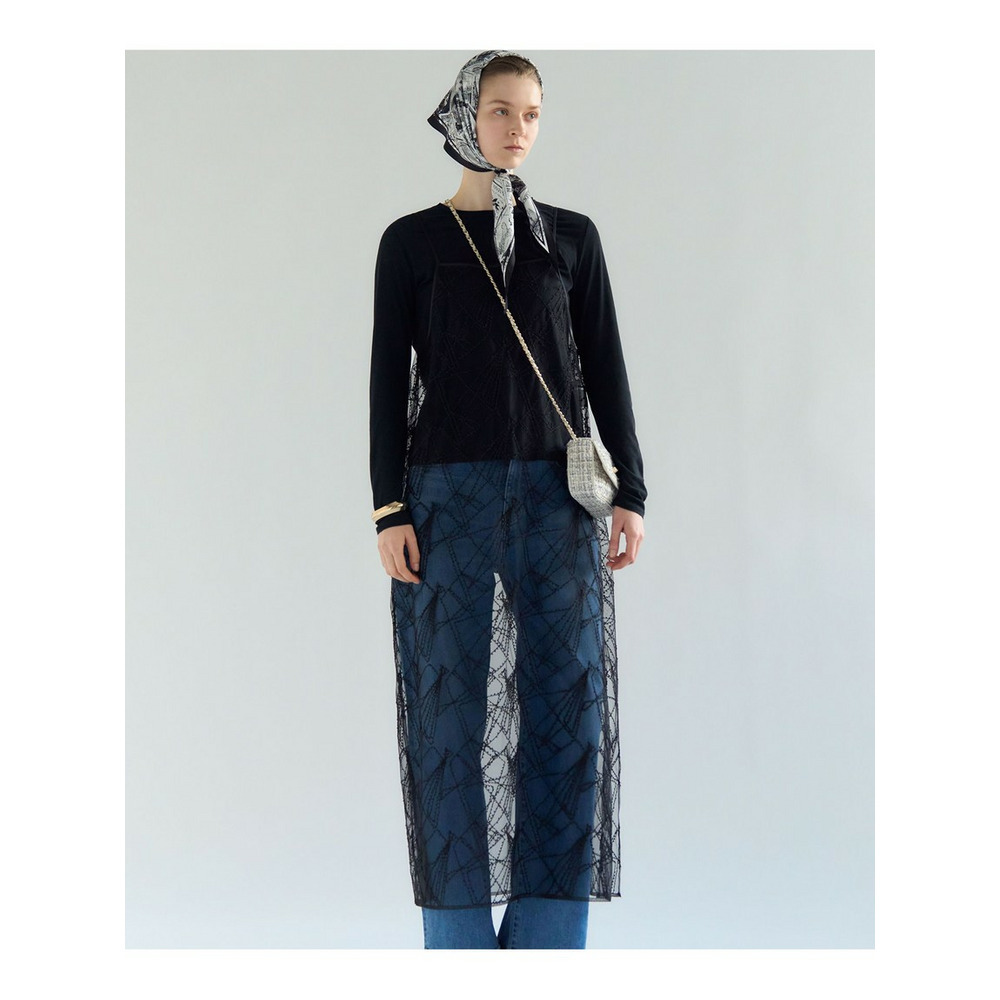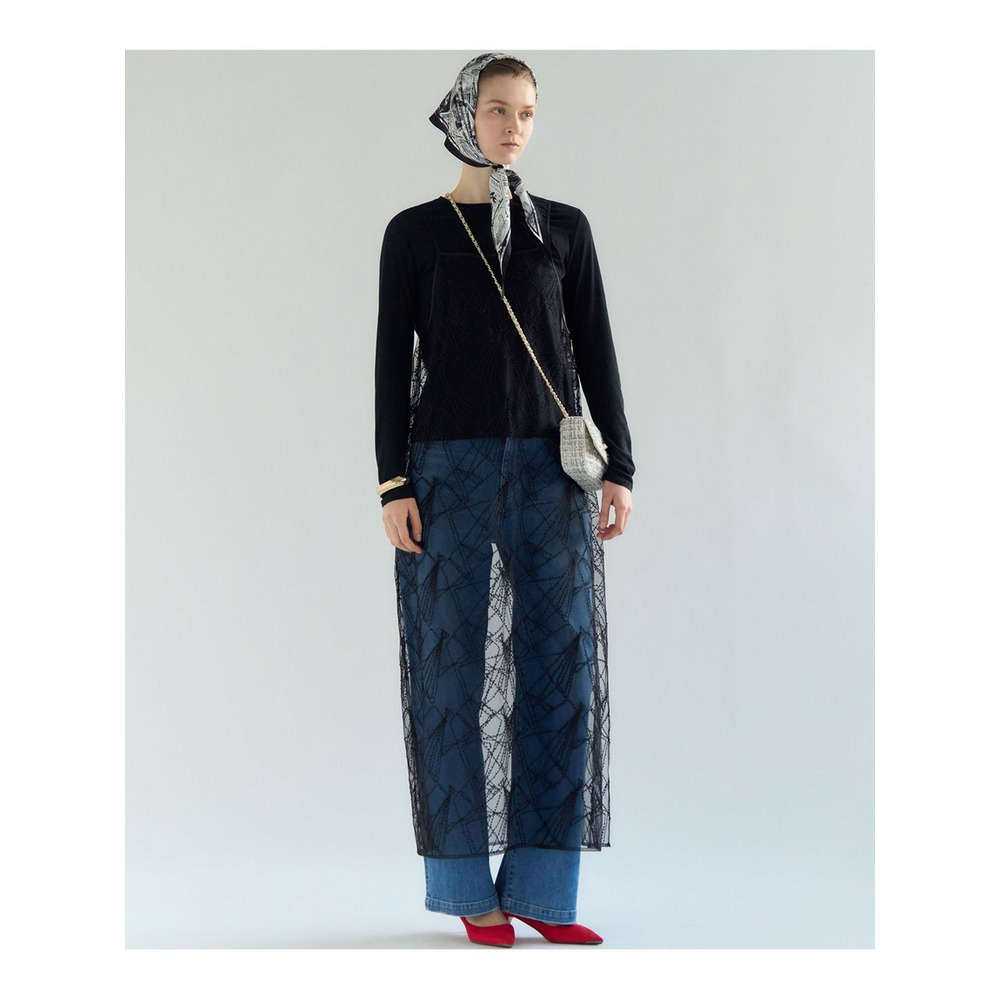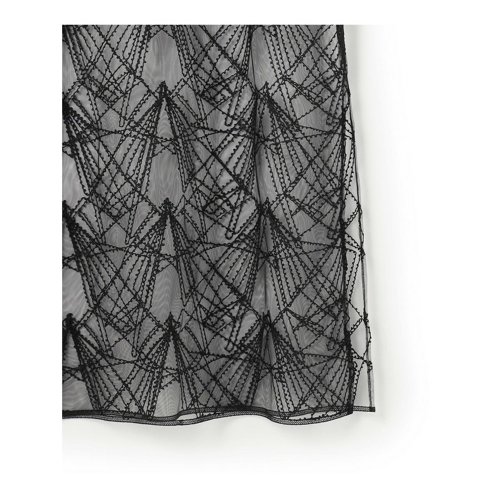 透け感のある柔らかなチュール素材をベースに、リボンヤーン刺繍を施した素材を使用しています。23区オリジナルの大ぶりな幾何学柄を採用することで、レース特有の甘さを抑えた上品な雰囲気に仕上げています。