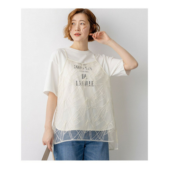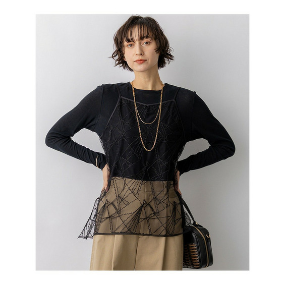 今シーズンのトレンドアイテムとして注目の、総刺繍デザインのキャミソールです。シンプルなシアー素材のカットソーやロゴTシャツに一枚重ねるだけで、いつものスタイリングが一気に華やぎ、洗練されたレイヤードスタイルが完成します。ふんわりとしたシルエットが気になるお腹周りをさりげなくカバーしてくれるのも嬉しいポイントです。肩ひもの長さはアジャスターで調整可能なので、合わせるボトムスのバランスに応じて着丈を変えられ、スカートからパンツまで幅広いコーディネートを楽しめます。カラーは、優しく上品な印象で馴染みの良いアイボリー(#002)と、シックでモードな雰囲気をプラスするブラック(#005)の2色展開です。