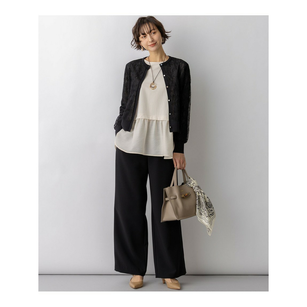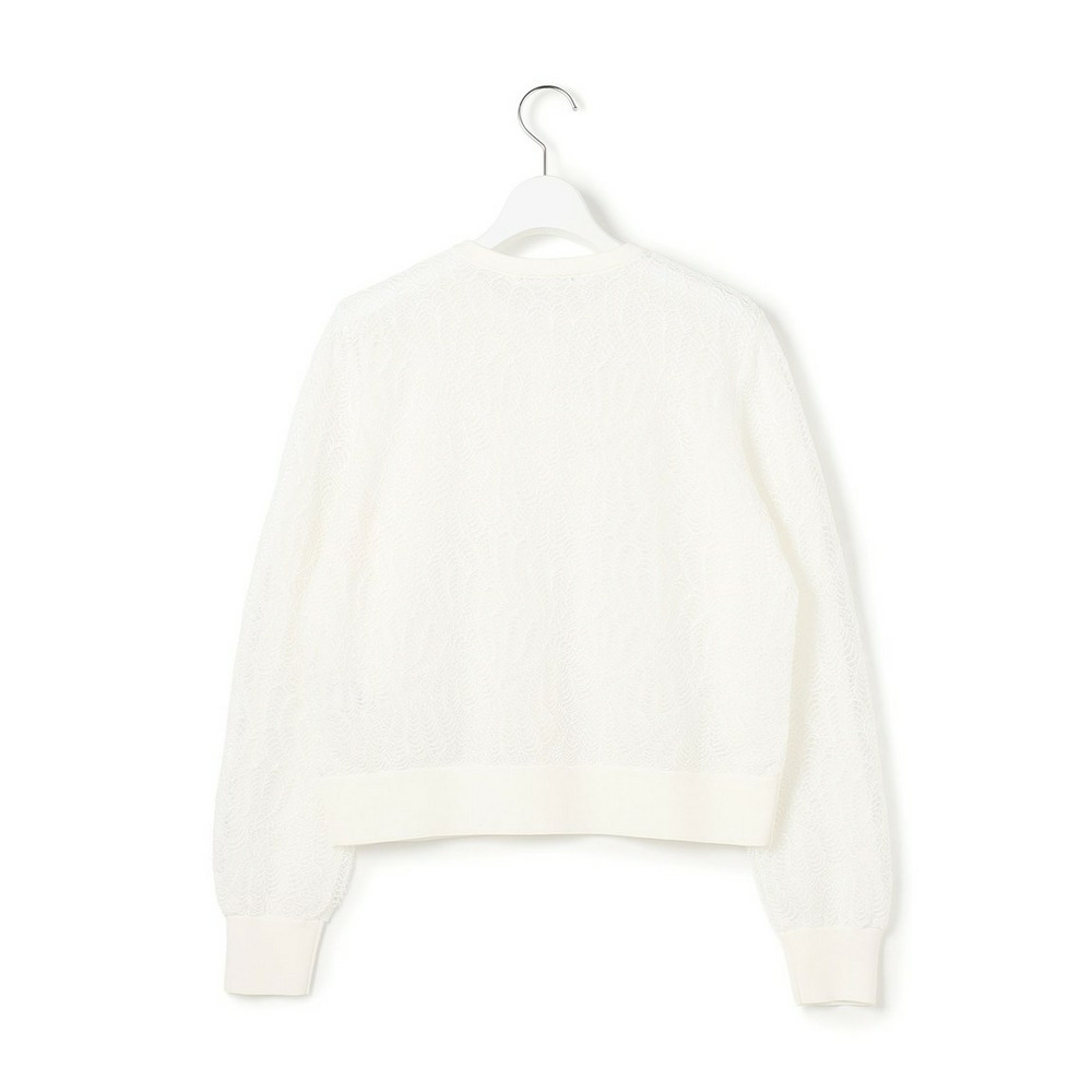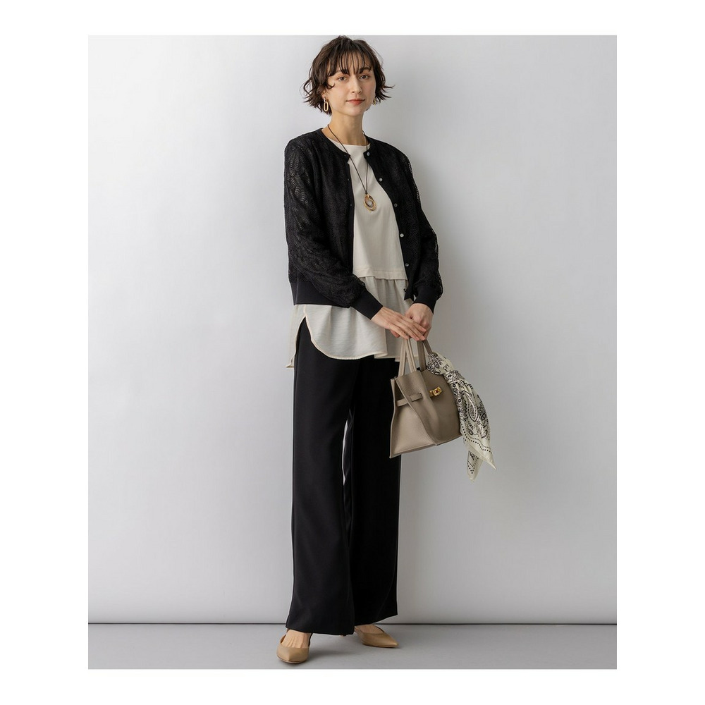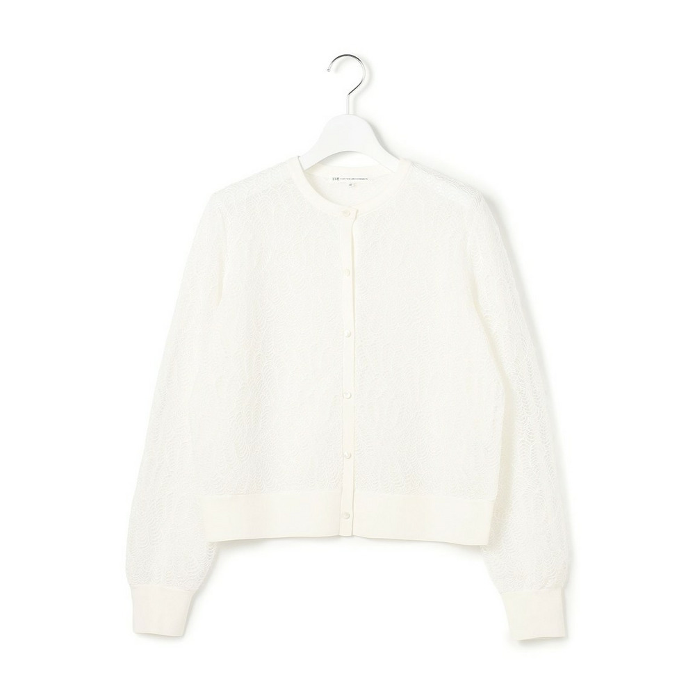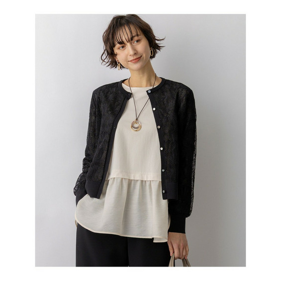 繊細な総レースが美しい、クルーネックのカーディガンです。透け感のある軽やかな素材感が、季節の変わり目に上品な華やかさを添えます。カーディガンとしてワンピースやカットソーの上にさらりと羽織るのはもちろん、フロントのボタンを全て留めてプルオーバー風に着こなすスタイルもおすすめです。 ボトムスを選ばないベーシックなシルエットで、きれいめなパンツやスカートと合わせればオフィスシーンに、デニムなどのカジュアルボトムと合わせれば大人の休日スタイルにと、幅広いシーンで活躍します。カラーは、肌なじみが良くフェミニンな印象のアイボリー(#002)と、コーディネートをシックに引き締めるブラック(#005)の2色展開です。