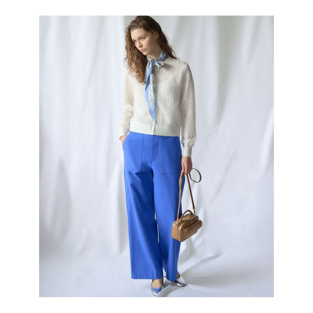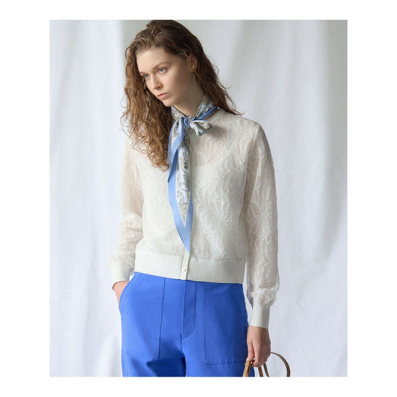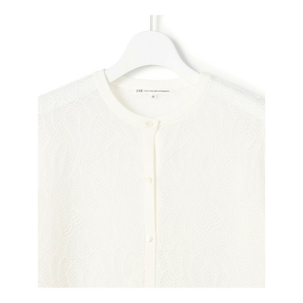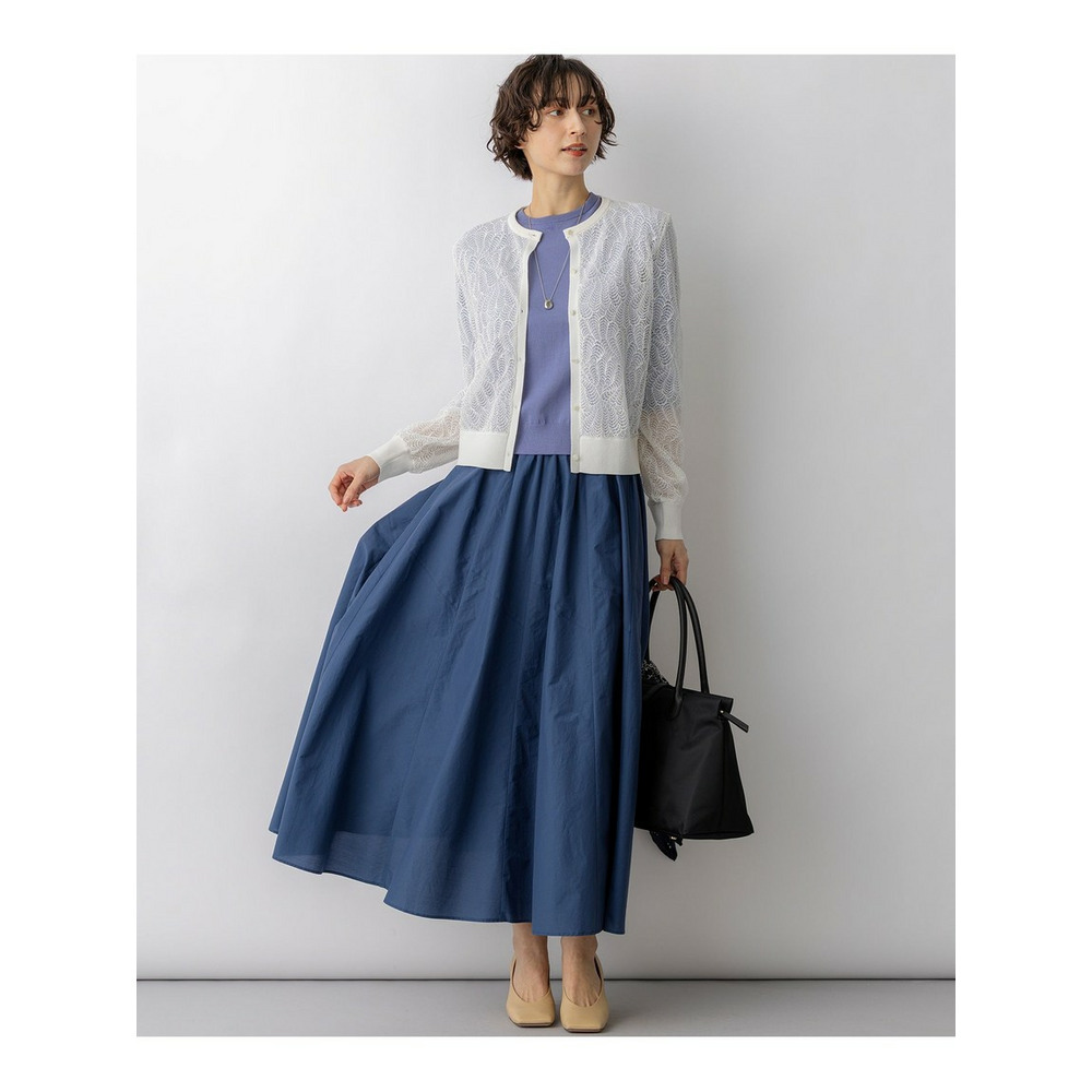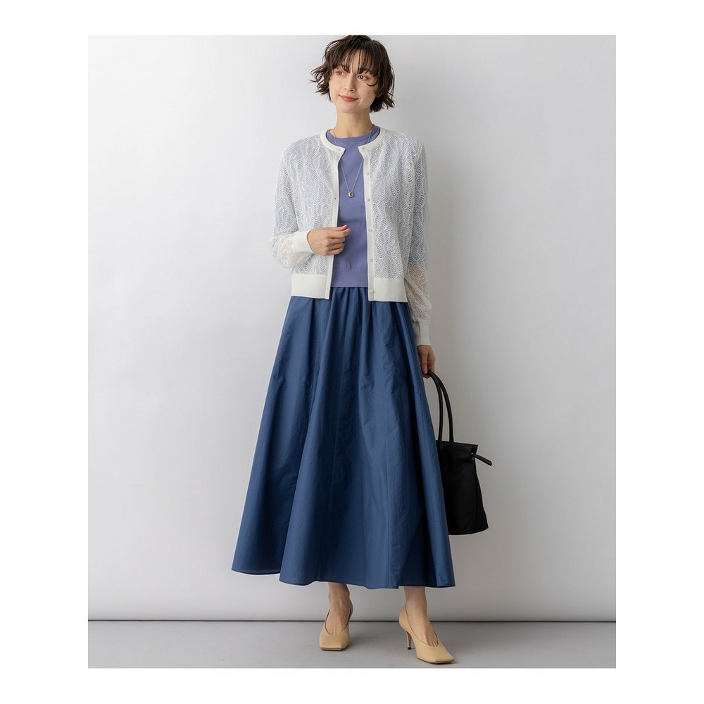 繊細な総レースが美しい、クルーネックのカーディガンです。透け感のある軽やかな素材感が、季節の変わり目に上品な華やかさを添えます。カーディガンとしてワンピースやカットソーの上にさらりと羽織るのはもちろん、フロントのボタンを全て留めてプルオーバー風に着こなすスタイルもおすすめです。 ボトムスを選ばないベーシックなシルエットで、きれいめなパンツやスカートと合わせればオフィスシーンに、デニムなどのカジュアルボトムと合わせれば大人の休日スタイルにと、幅広いシーンで活躍します。カラーは、肌なじみが良くフェミニンな印象のアイボリー(#002)と、コーディネートをシックに引き締めるブラック(#005)の2色展開です。