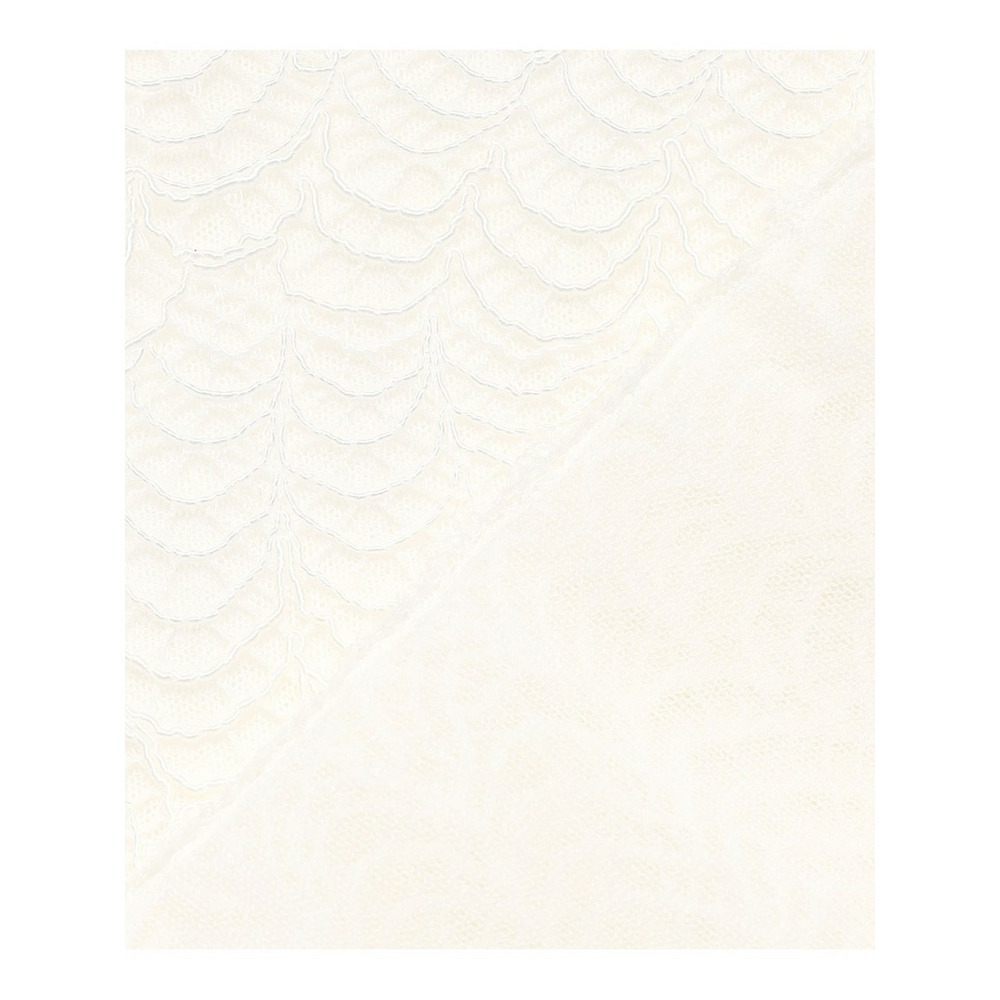 異なる太さや素材の糸を巧みに組み合わせ、専用の編み機で丁寧に編み上げられたレース生地を使用しています。羽のモチーフからインスピレーションを受けてデザインされた図案は、緻密で繊細な表情が魅力です。立体感のある糸を使用することで、奥行きと高級感あふれる上質な素材に仕上がっています。