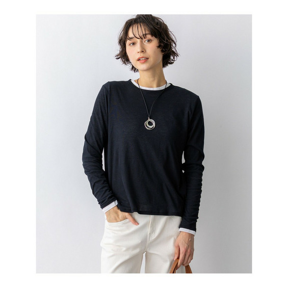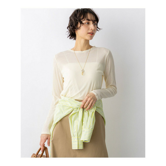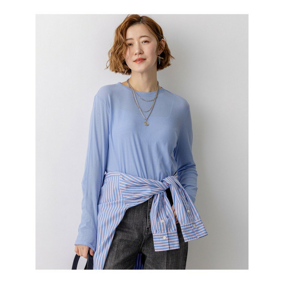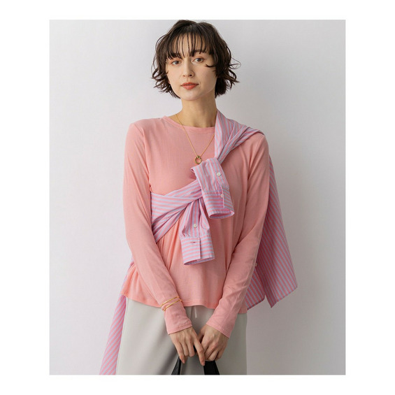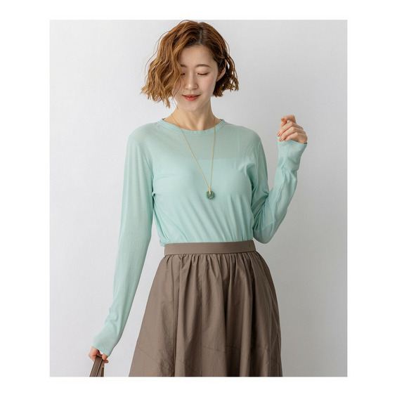 シンプルなクルーネックで仕立てた、ベーシックな長袖カットソーです。コンパクトなシルエットながら、肌に張り付かない絶妙なサイジングにこだわっており、一枚ではもちろん、カラー違いで重ねてもすっきりと着こなせます。トレンドのシアー感を取り入れたデザインは、ジャケットやカーディガン、ニットのインナーとして襟元や袖口から覗かせるだけで、コーディネートに抜け感と奥行きをプラスします。季節を問わずオールシーズン活躍する汎用性の高さも魅力です。 カラーは、どんなアイテムとも馴染むクリーンなホワイト(#001)、シックで着こなしを引き締めるブラック(#005)、顔周りをパッと明るく華やかに見せるピンク(#012)、ニュアンスのある色味で大人っぽいスモーキーグリーン(#063)、清涼感があり洗練された印象のスカイブルー(#072)、柔らかなトーンで優しげなライトイエロー(#042)の6色展開です。