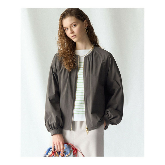 襟元に寄せた繊細なギャザーと、ふんわりと丸みのあるシルエットが魅力のジップブルゾンです。首元はすっきりとしたクルーネックで、上品な印象を与えます。袖にはボリューム感のあるギャザーを施し、カジュアルな中にも女性らしい柔らかな雰囲気をプラスしています。裾にはドローコードが付いており、絞ることでブラウジングができ、お好みのシルエットに調整して立体感を演出できます。逆開ファスナーは、下からも開閉できるため、フレアスカートなどボリュームのあるボトムスと合わせる際に、裾を開けてこなれた印象に仕上げることも可能です。フロントジップのゴールドパーツが、さりげなく上品なアクセントを添えています。デニムなどのカジュアルなアイテムから、きれいめなスカートまで、合わせるボトムを選ばない着回し力の高さも魅力。春先の軽アウターとして、幅広いシーンで活躍します。 カラーは、洗練された印象のグレー(#004)、シックで着回し力抜群のブラック(#005)、柔らかな雰囲気で合わせやすいベージュ(#033)の3色展開です。