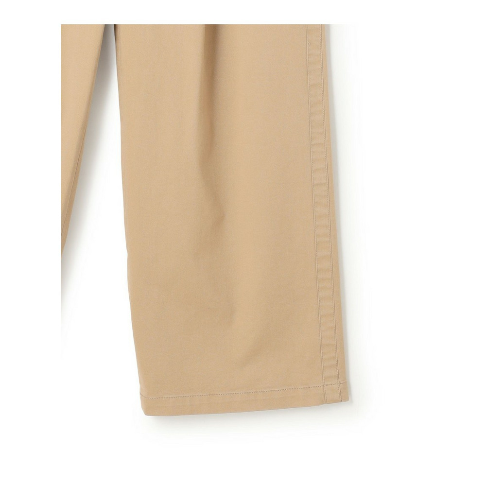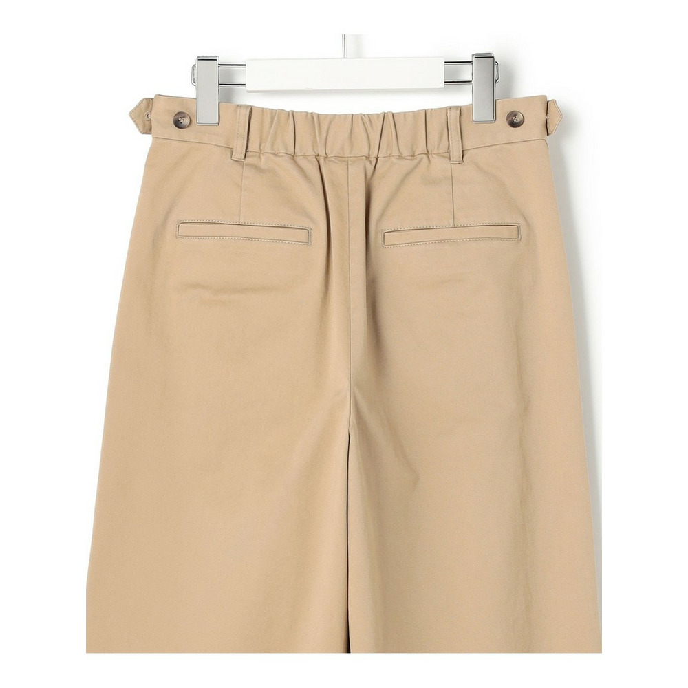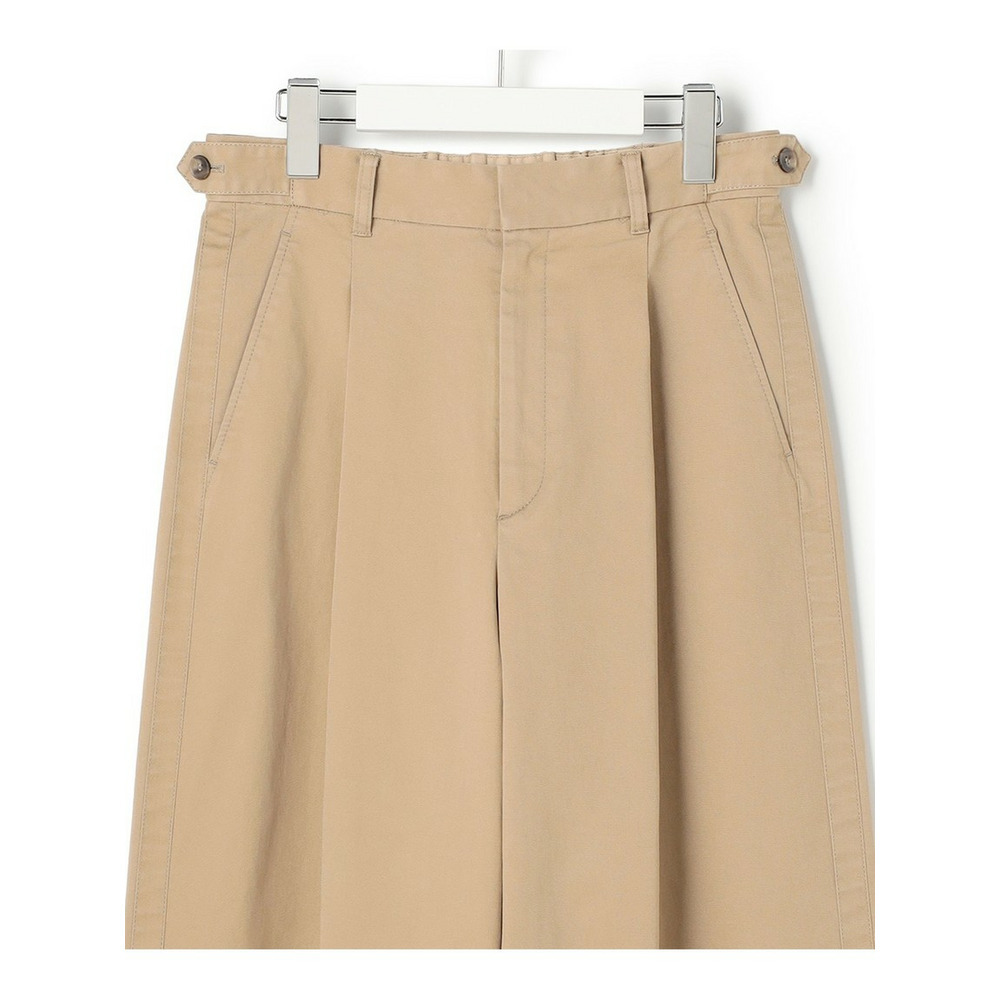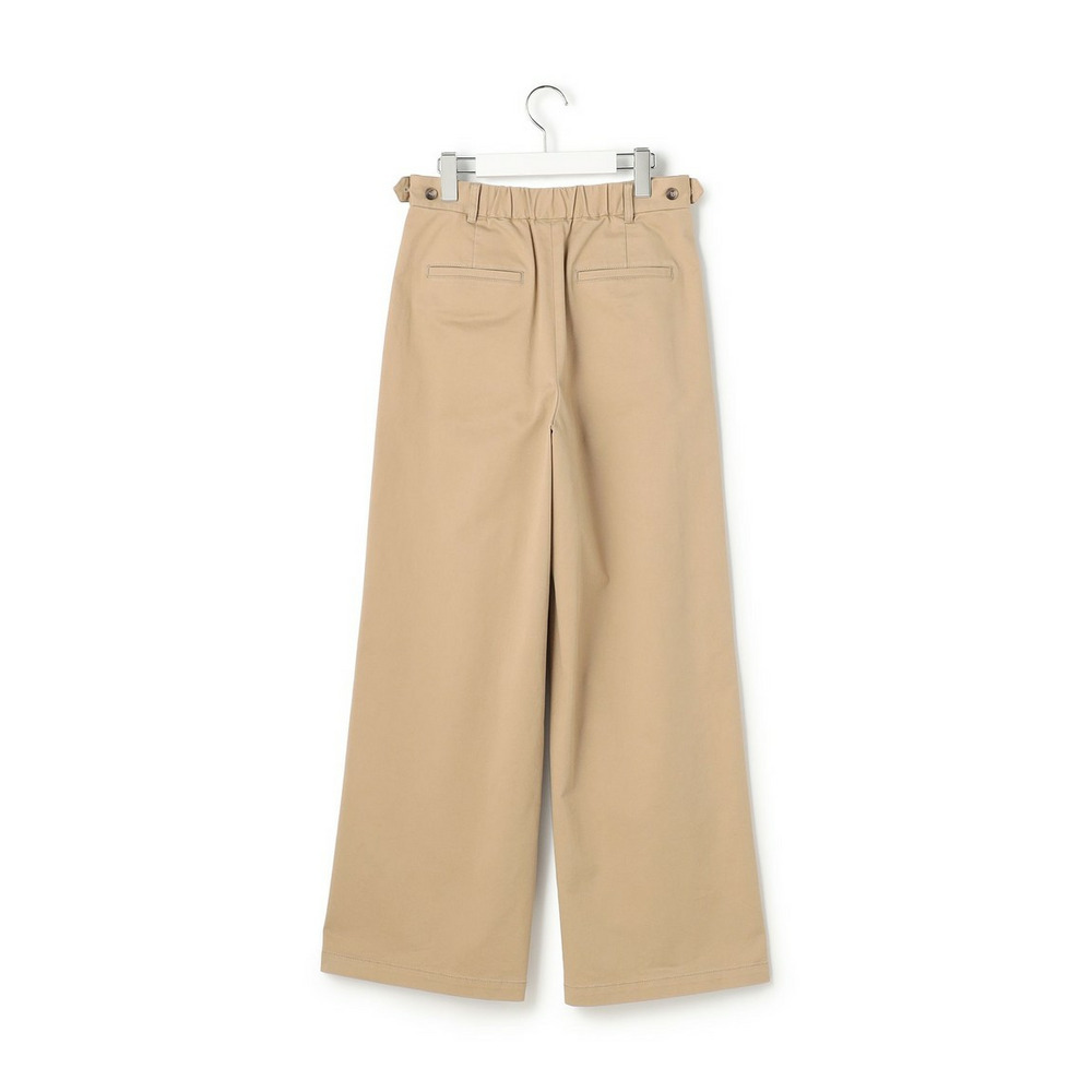 ■デザインストレッチの効いたギャバジン素材で仕立てた、リラックス感ときちんと感を兼ね備えたチノワイドパンツです。絶妙なワイドシルエットで、すっきりとしたシルエットになっています。 ウエストベルトのサイドにはタブとボタンをあしらっており、お好みで調節が可能。 カットソーをタックインしてすっきりと着こなしたり、シャツを合わせてシャープにまとめたりと、合わせるトップスを選びません。足元にパンプスを合わせれば通勤スタイルに、フラットシューズなら休日のカジュアルスタイルにと、幅広いシーンで活躍します。カラーは、肌なじみが良く、女性らしい柔らかさを演出するベージュ(#033)の1色展開です。