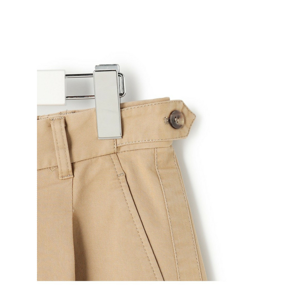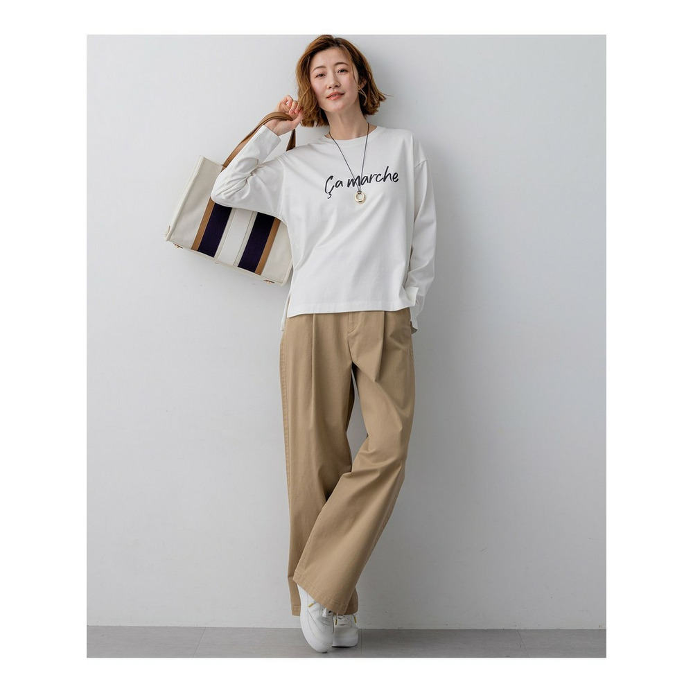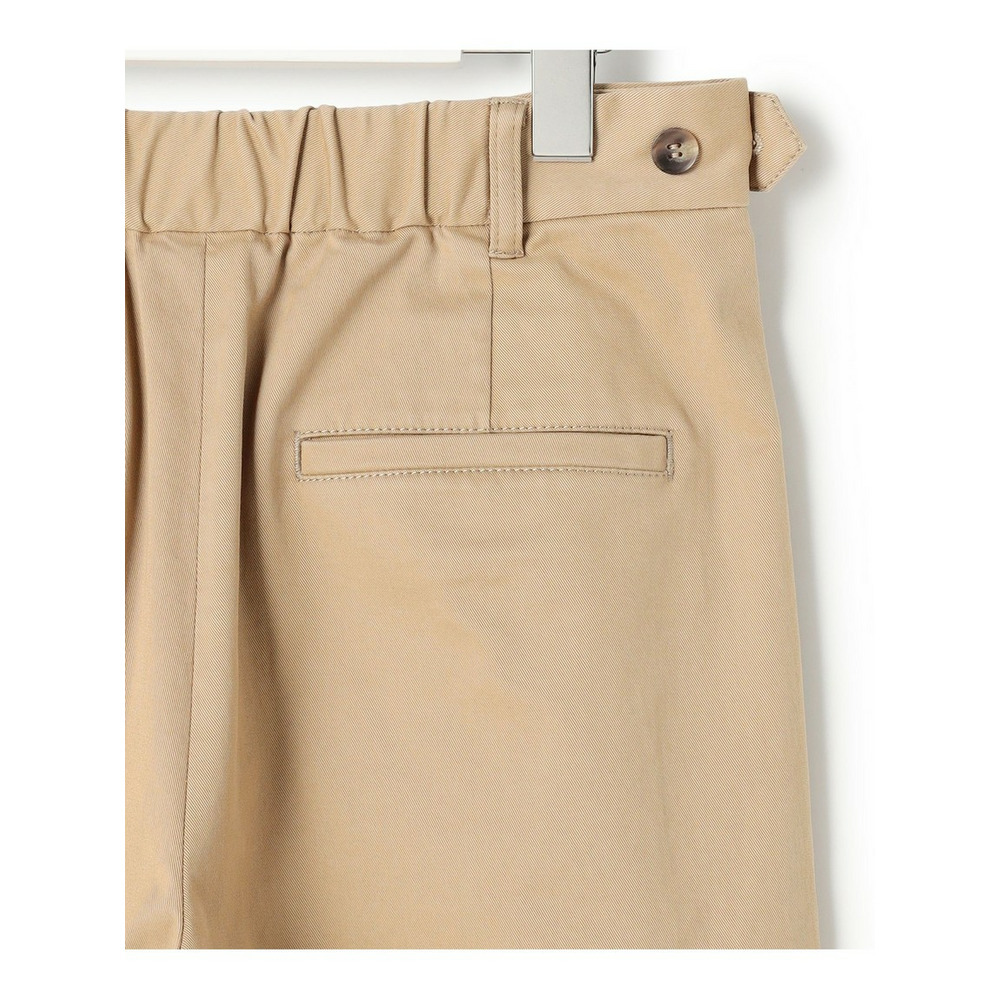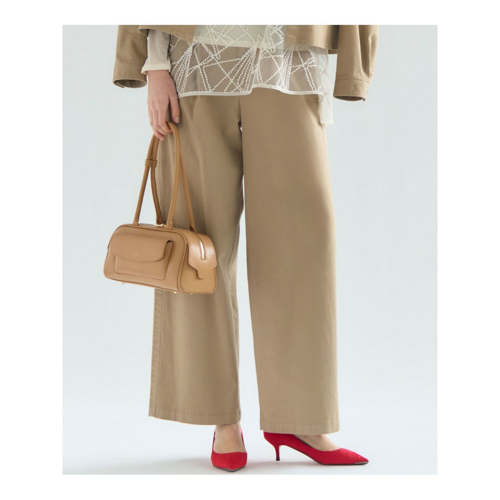 ■デザインストレッチの効いたギャバジン素材で仕立てた、リラックス感ときちんと感を兼ね備えたチノワイドパンツです。絶妙なワイドシルエットで、すっきりとしたシルエットになっています。 ウエストベルトのサイドにはタブとボタンをあしらっており、お好みで調節が可能。 カットソーをタックインしてすっきりと着こなしたり、シャツを合わせてシャープにまとめたりと、合わせるトップスを選びません。足元にパンプスを合わせれば通勤スタイルに、フラットシューズなら休日のカジュアルスタイルにと、幅広いシーンで活躍します。カラーは、肌なじみが良く、女性らしい柔らかさを演出するベージュ(#033)の1色展開です。