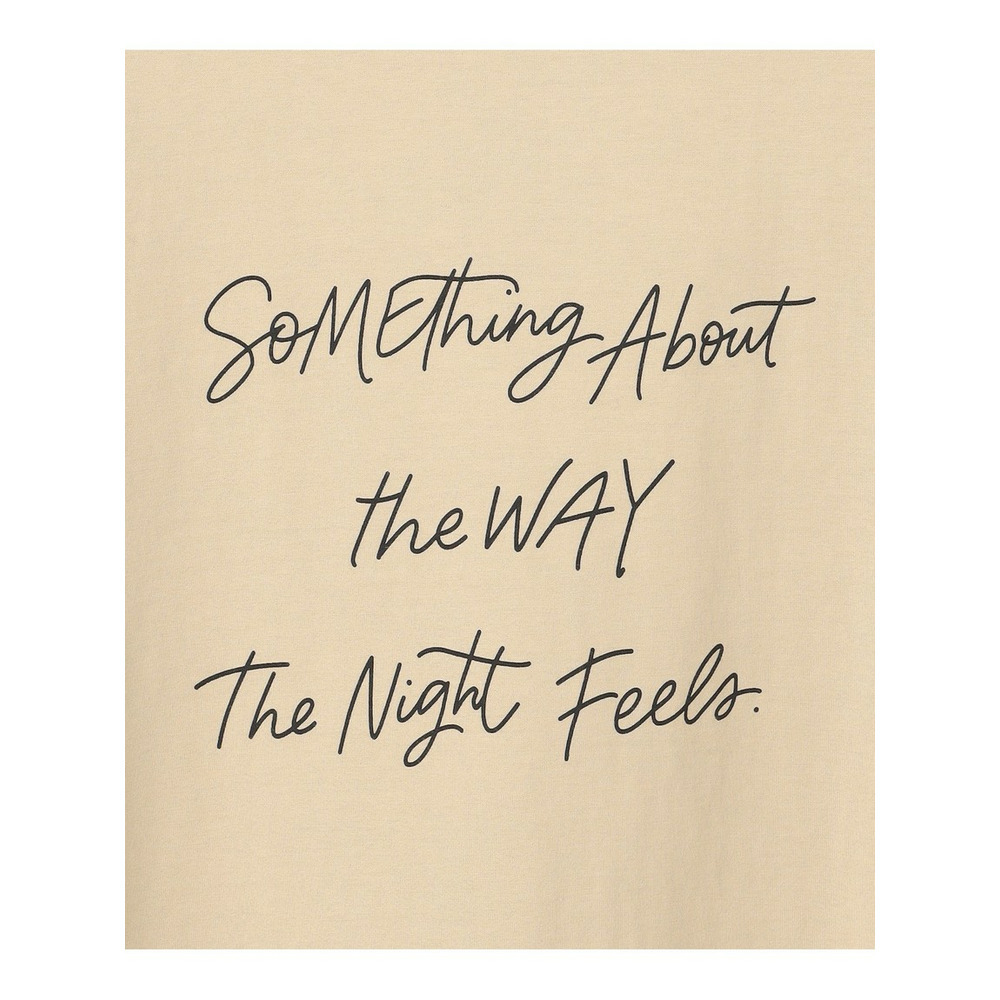ゆったりとしたサイズ感でヒップまで隠れるオーバーサイズのプリントTシャツです。「Something about the way the night feels(この夜の空気感、なんかいい)」というSLOW 23区らしいリラックスムード漂うメッセージロゴをあしらいました。ホールガーメントのリブニットスカートやガーメントツイルのスカートなど細身のIラインスカートと合わせることで、今年らしいメリハリのあるバランスを楽しめます。休日のリラックススタイルや、気負わないデイリーウェアとして最適です。カラーは、清潔感のあるホワイト系(#001)、シックで落ち着いたグレー系(#004)、肌馴染みの良いナチュラルなベージュ系(#033)、爽やかなアクセントになるサックスブルー系(#073)の4色展開です。