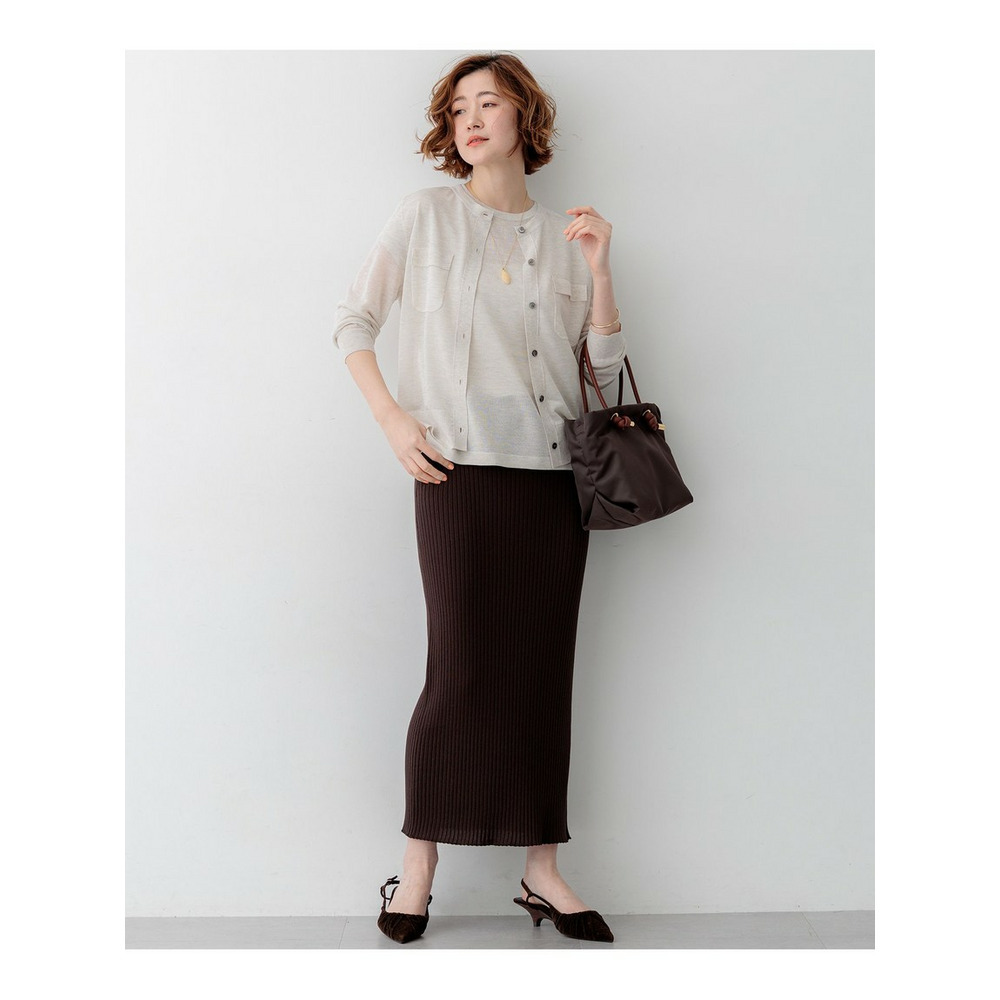 ホールガーメント製法で編み立てた、ストレスフリーな着心地のワイドリブニットスカートです。脇の縫い代がごろつかず、ごわつきを感じることなく快適に着用いただけます。太めのリブ編みが縦のラインを強調し、すっきりとした美しいシルエットを演出。ウエスト部分はゴムの厚みが出にくい見返し仕様にすることで、お腹周りをフラットに見せ、トップスをインした際もスマートに決まります。同素材のカーディガンと合わせたセットアップスタイルはもちろん、シャツやブラウスと合わせたきれいめカジュアルな着こなしもおすすめです。リラックスしたい休日のおうち時間から、軽やかなお出かけシーンまで幅広く活躍します。カラーは、洗練された印象で引き締まるブラック(#005)、ナチュラルで女性らしい柔らかさのあるベージュ(#033)、深みのある色合いが大人っぽいダークブラウン(#035)の3色展開です。