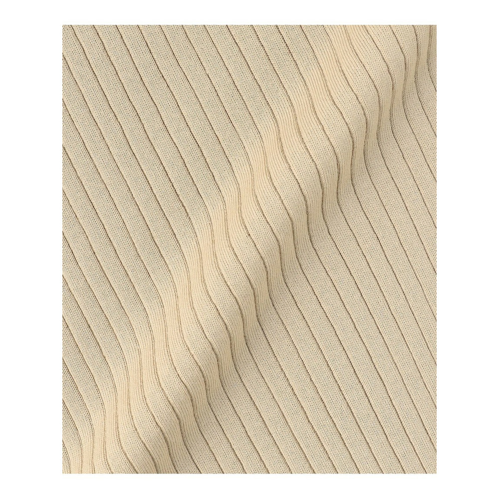 ■素材毛羽立ちの少ない上質なコットンと、程よい伸縮性を持つポリエステルをブレンドした、繊細な細番手の素材を使用しています。光沢感のあるポリエステル糸を合わせることで、上品な艶と柔らかな肌触りを兼ね備えました。ストレッチ性のある糸の特性により、編み目がきれいに整い、すっきりとした美しい表面感に仕上がっているのも特徴です。