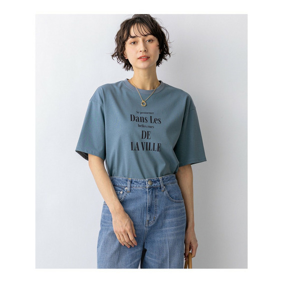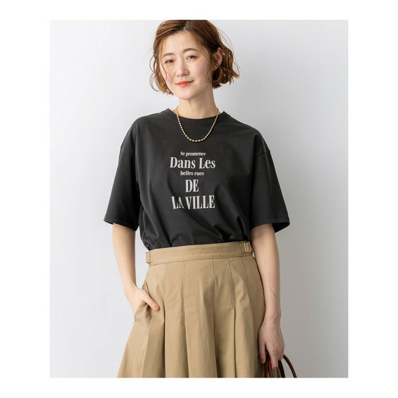 大胆に前後差をつけたシャツテールの裾が印象的な、1枚で着映えするロゴTシャツです。ゆったりとしたドロップショルダーのシルエットが、気になる二の腕を自然にカバー。リラックス感がありながらも、計算されたバランスでデニムはもちろん、シンプルなスカートと合わせても様になります。フロントには「美しい街並みをゆっくりと散歩して」という意味のロゴをあしらい、心地よい季節のリフレッシュタイムにぴったりのデザインに仕上げました。カラーは、着回し力抜群のオフ×ブラック(#001)、ニュアンスのあるスレート×サンド(#004)、落ち着いた印象のフロスト×ダークブラウン(#033)、シックで洗練されたダルブルー×ネイビー(#074)の4色展開です。