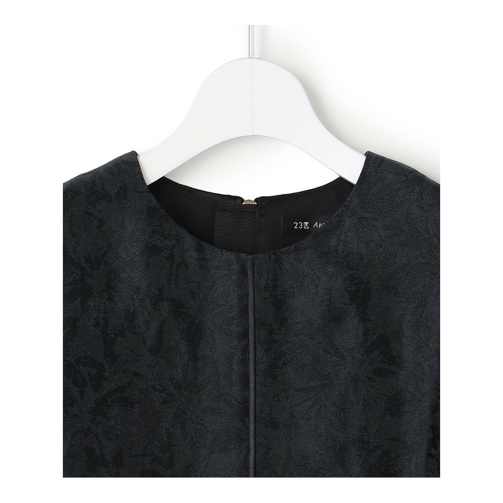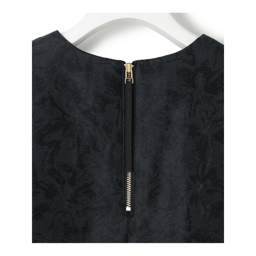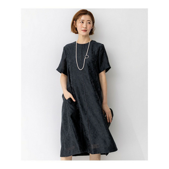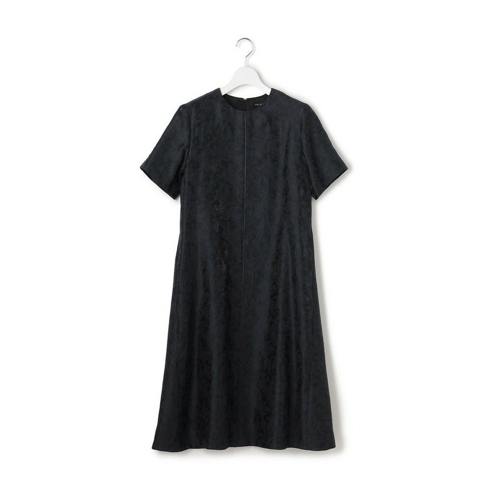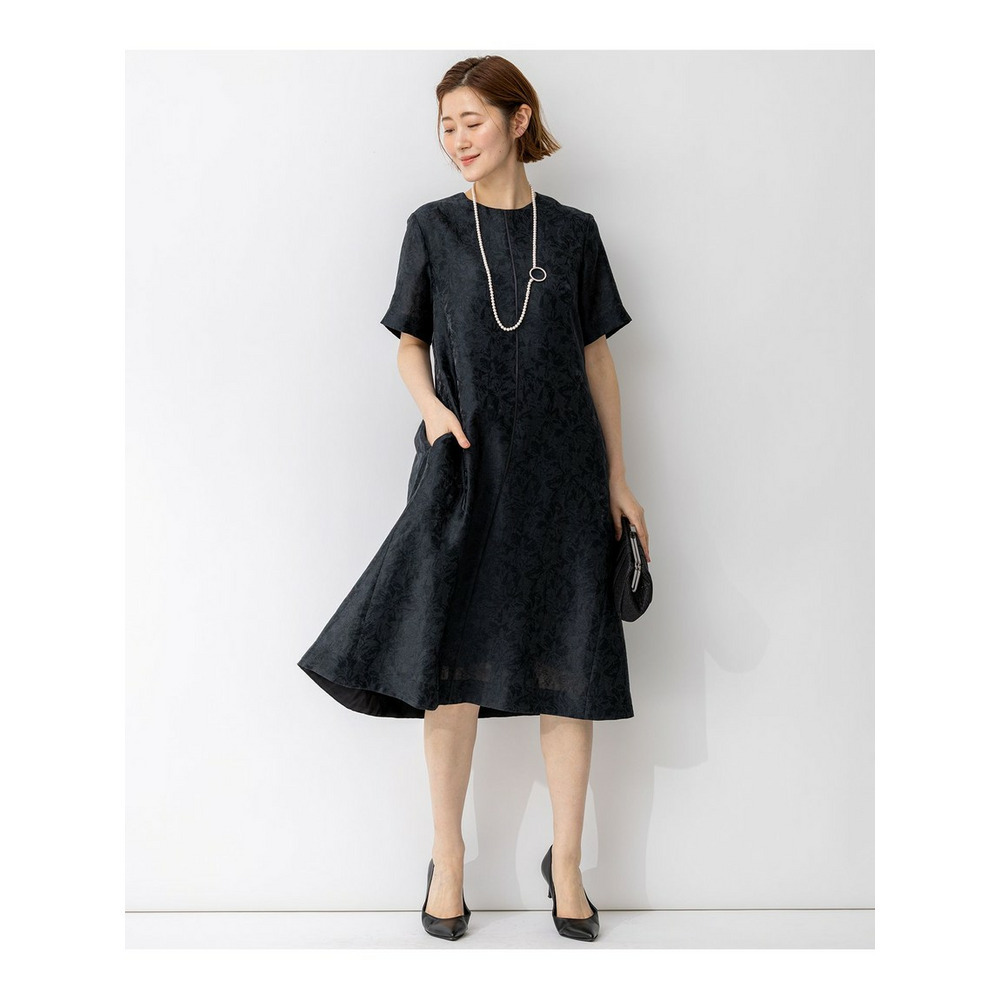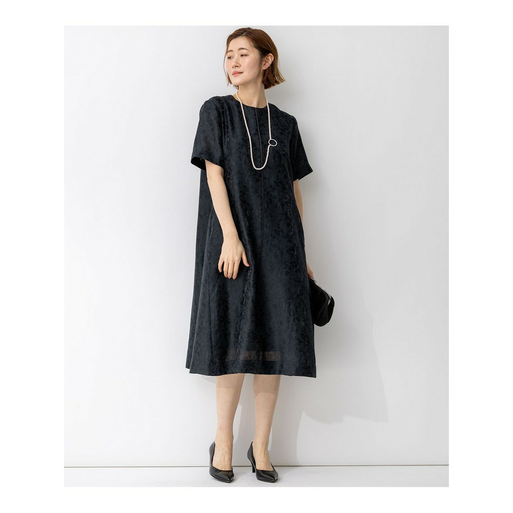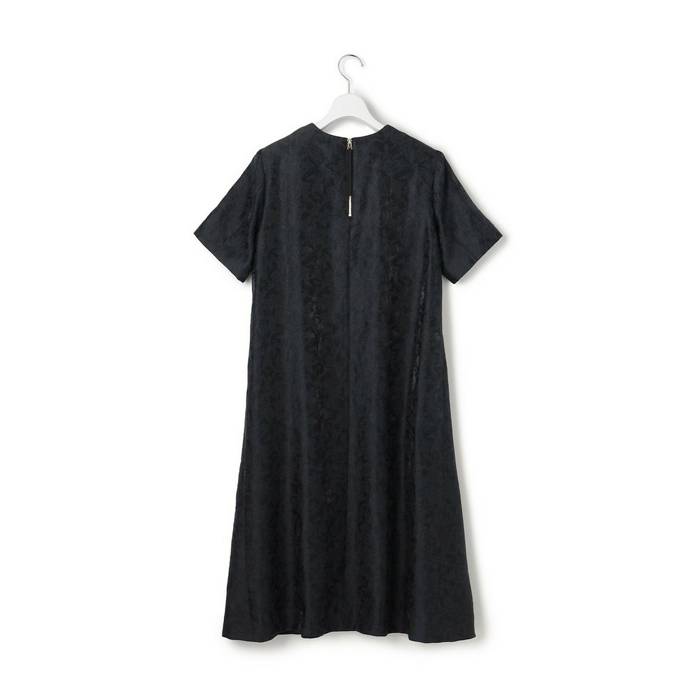 艶感とほのかにシアーな透け感のある素材で、さりげなく花柄を織りで表現した半袖ブラックドレス。すっきりとしたクルーネックのシンプルなデザインながら、裾にかけて品よくAラインに広がるように分量感やシルエットにこだわったデザイン。ややゆとりを持たせた袖感で着合わせに迷うことなく、1枚で品よく着映えが叶います。背面中央にグログランリボンの引手をつけたファスナーを採用することさりげなくアクセントを加えています。