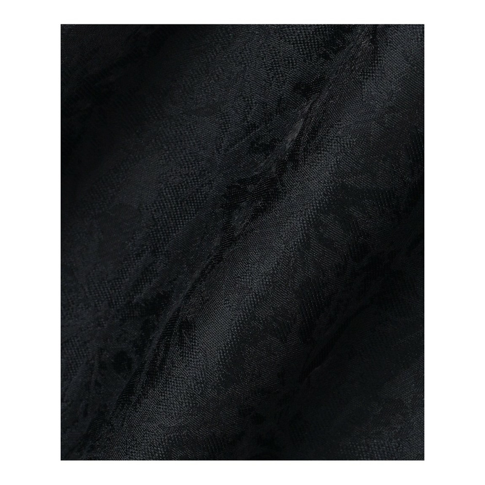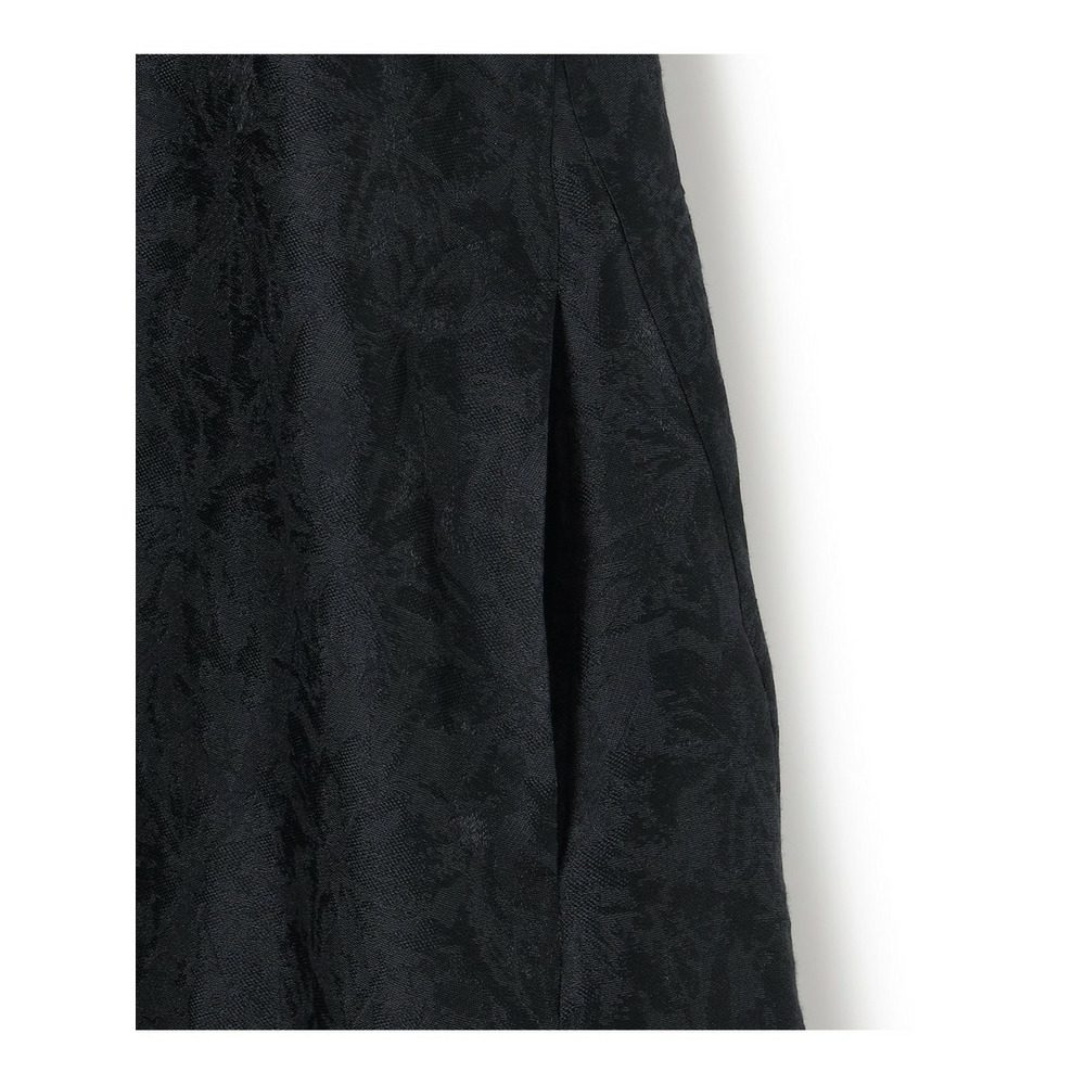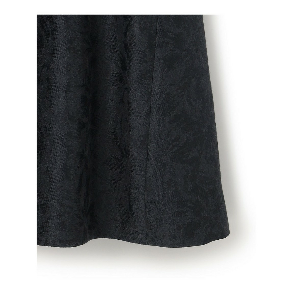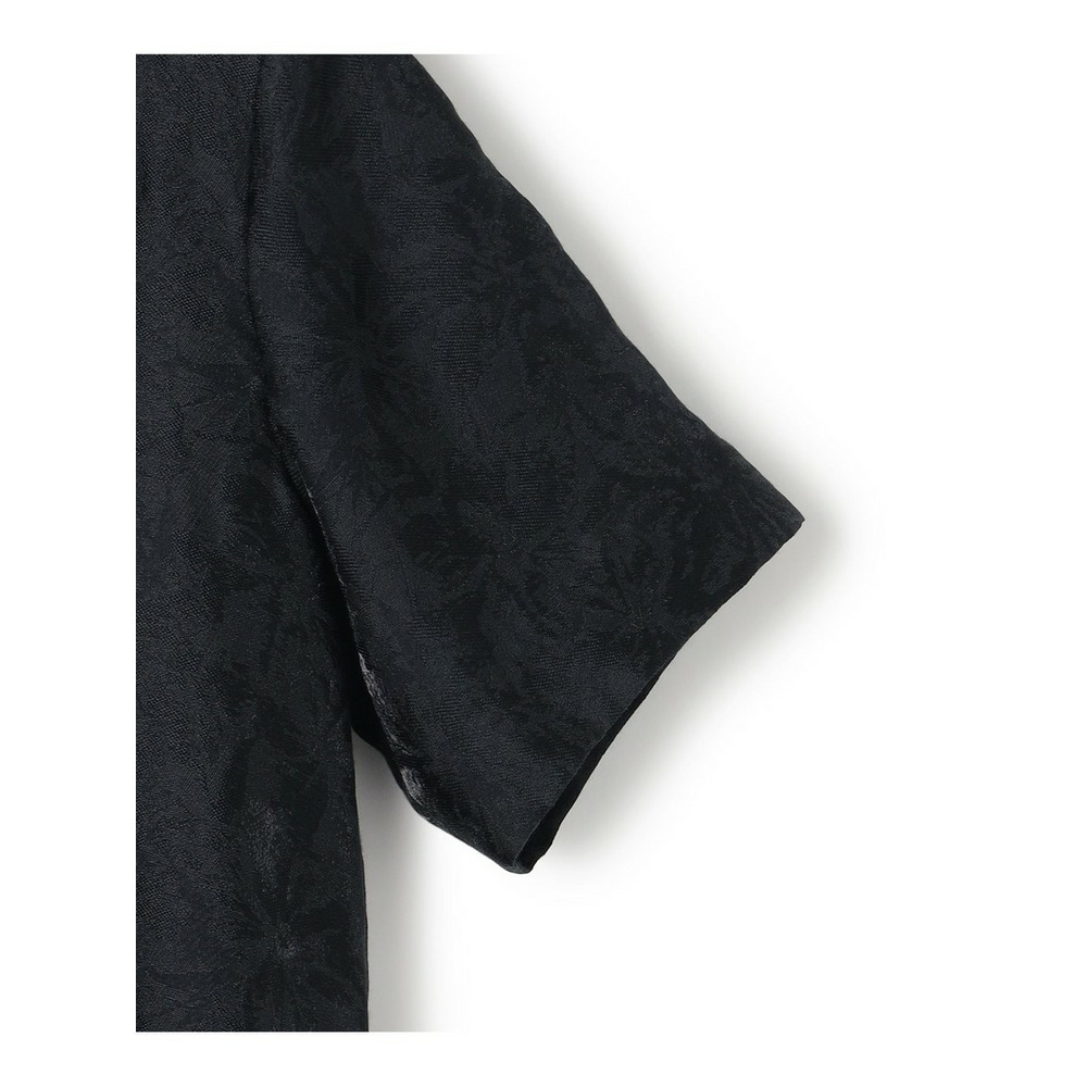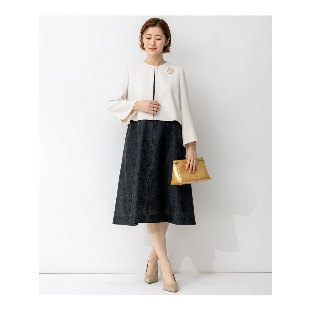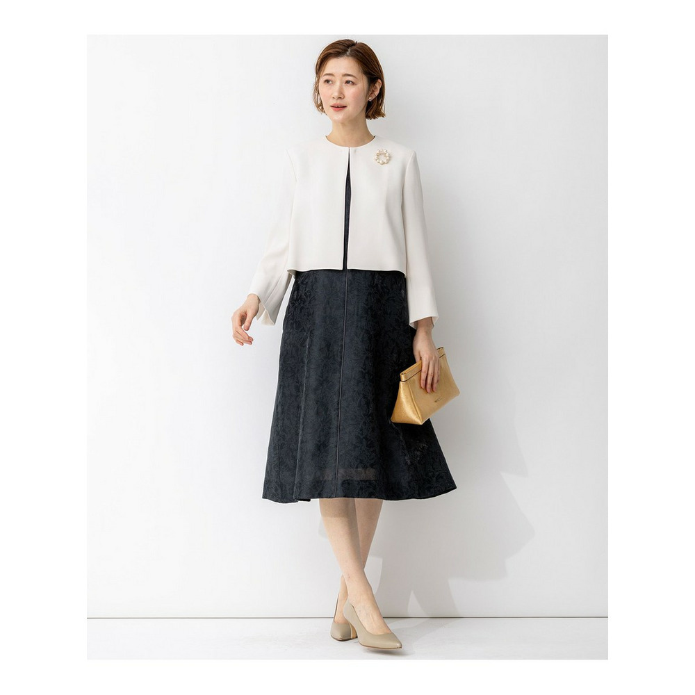 艶感とほのかにシアーな透け感のある素材で、さりげなく花柄を織りで表現した半袖ブラックドレス。すっきりとしたクルーネックのシンプルなデザインながら、裾にかけて品よくAラインに広がるように分量感やシルエットにこだわったデザイン。ややゆとりを持たせた袖感で着合わせに迷うことなく、1枚で品よく着映えが叶います。背面中央にグログランリボンの引手をつけたファスナーを採用することさりげなくアクセントを加えています。