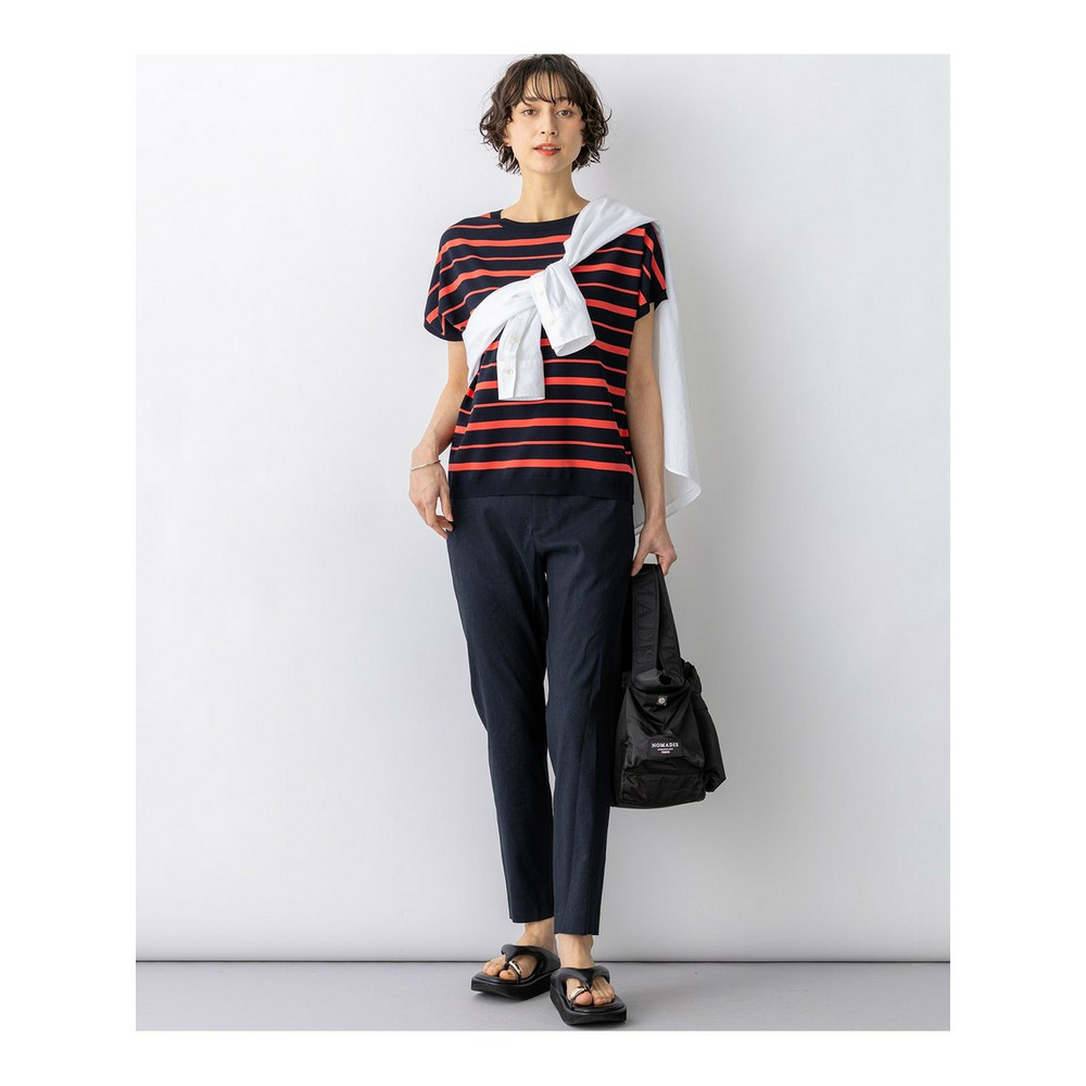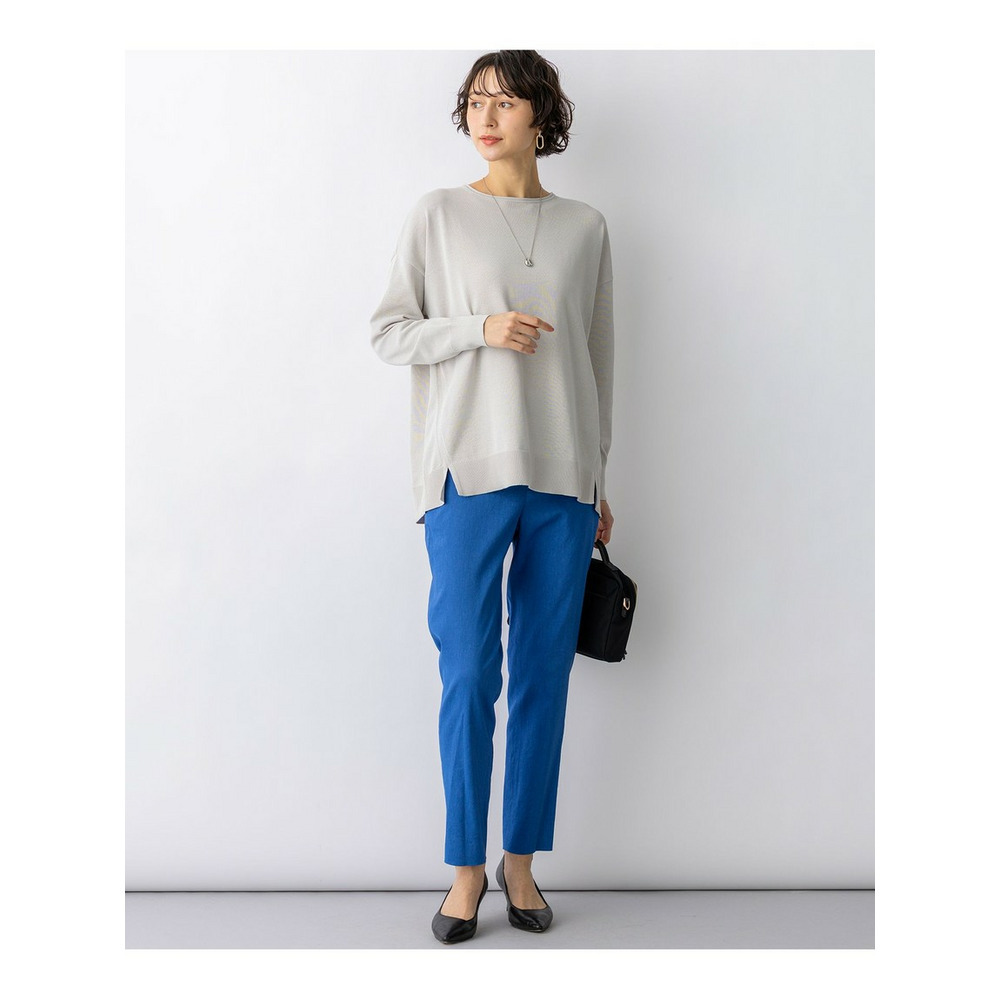 リネン混ならではの清涼感と、動きやすいストレッチ性を両立した、夏に欠かせないテーパードパンツです。フロントはファスナー開きとベルトループを施した本格的な仕様ですっきりとした印象を与えつつ、ウエストの後ろ部分はゴム仕様にすることで、締め付け感のない快適な穿き心地に仕上げました。ヒールを合わせても裾がもたつかない絶妙な丈感で、足元を軽やかに演出します。同素材のジャケットと合わせたセットアップスタイルなら、オフィスシーンにも最適。Tシャツやブラウスと合わせれば、大人のリラックスカジュアルも楽しめます。カラーは、着回しの効くオフ(#001)・ブラック(#005)・ネイビー(#075)のベーシックカラーに加え、ニュアンスのあるサンド(#033)・モカ(#030)・ダークブラウン(#035)、着こなしのアクセントになるキャロット(#020)・グレイッシュブルー(#070)の全8色展開です。