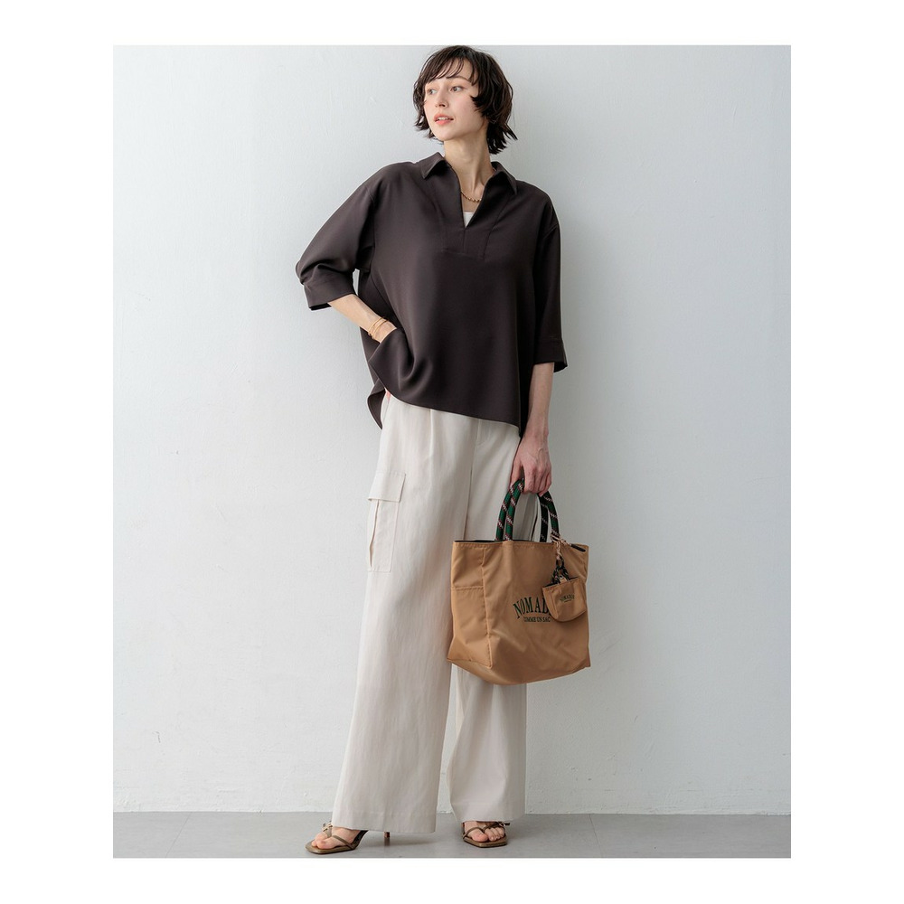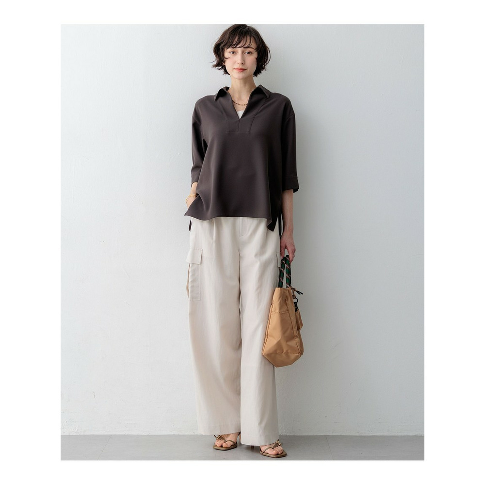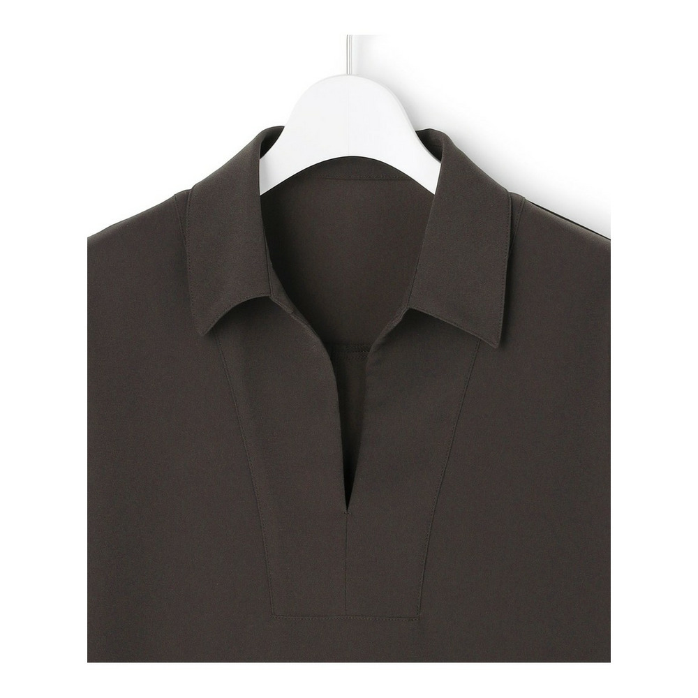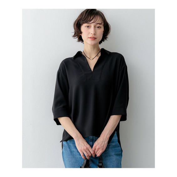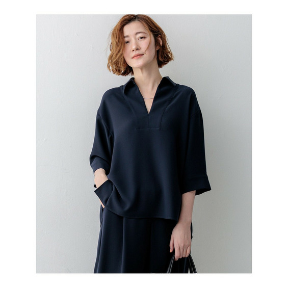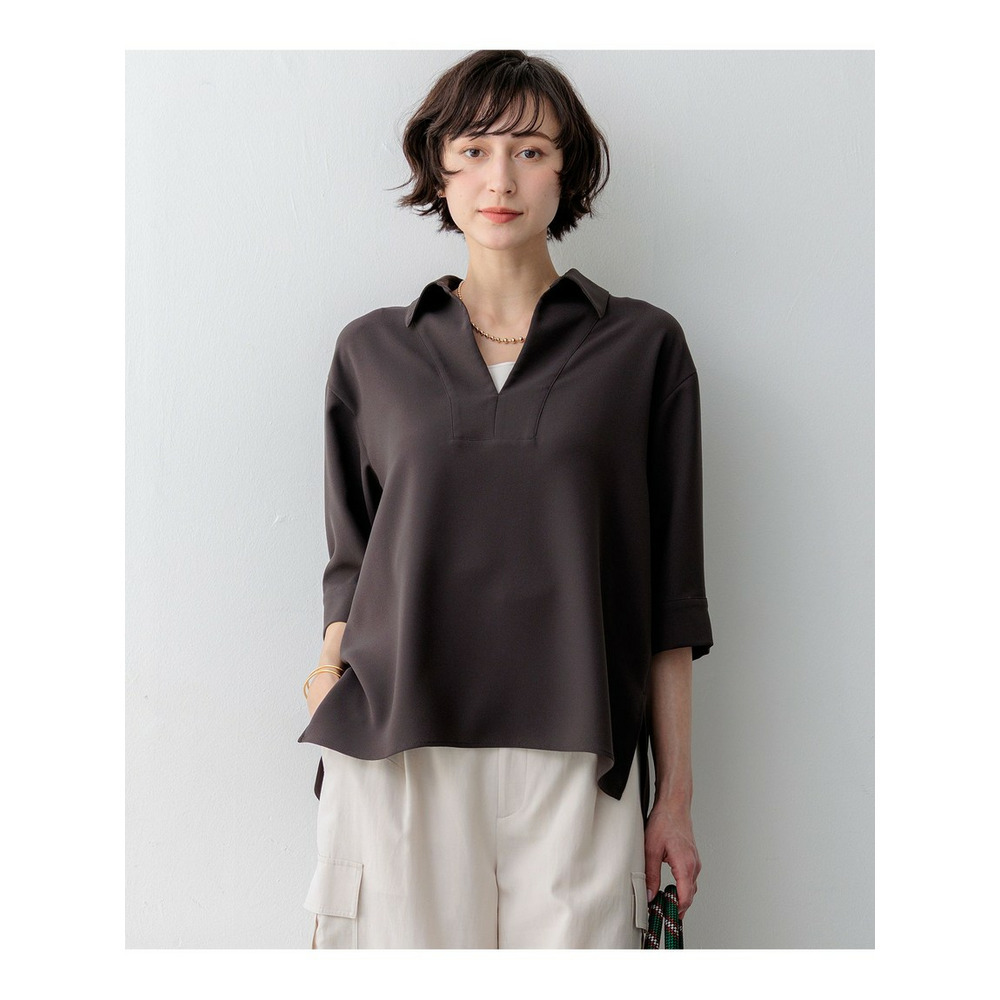 顔周りをすっきりと見せてくれる、前立てにスリットが入ったスキッパーデザインのプルオーバーです。フロントのブザム切り替えがさりげないアクセントになり、シンプルながらも洗練された印象を与えます。しっかりとした仕立てで、襟を少し後ろに抜いて着用することで、より女性らしい抜け感のある着こなしが叶います。今シーズントレンドのスキッパーデザインは、オフィスシーンなどのONスタイルにも取り入れやすく、一枚で様になるアイテムです。同素材のテーパードパンツやワイドパンツなど、きれいめなパンツと合わせた通勤スタイルはもちろん、デニムやワイドパンツと合わせたカジュアルダウンしたスタイリングもおすすめです。カラーは、抜け感のあるダークブラウン(#035)、シックで洗練された印象のブラック(#005)、知的で上品なネイビー(#075)の3色展開です。