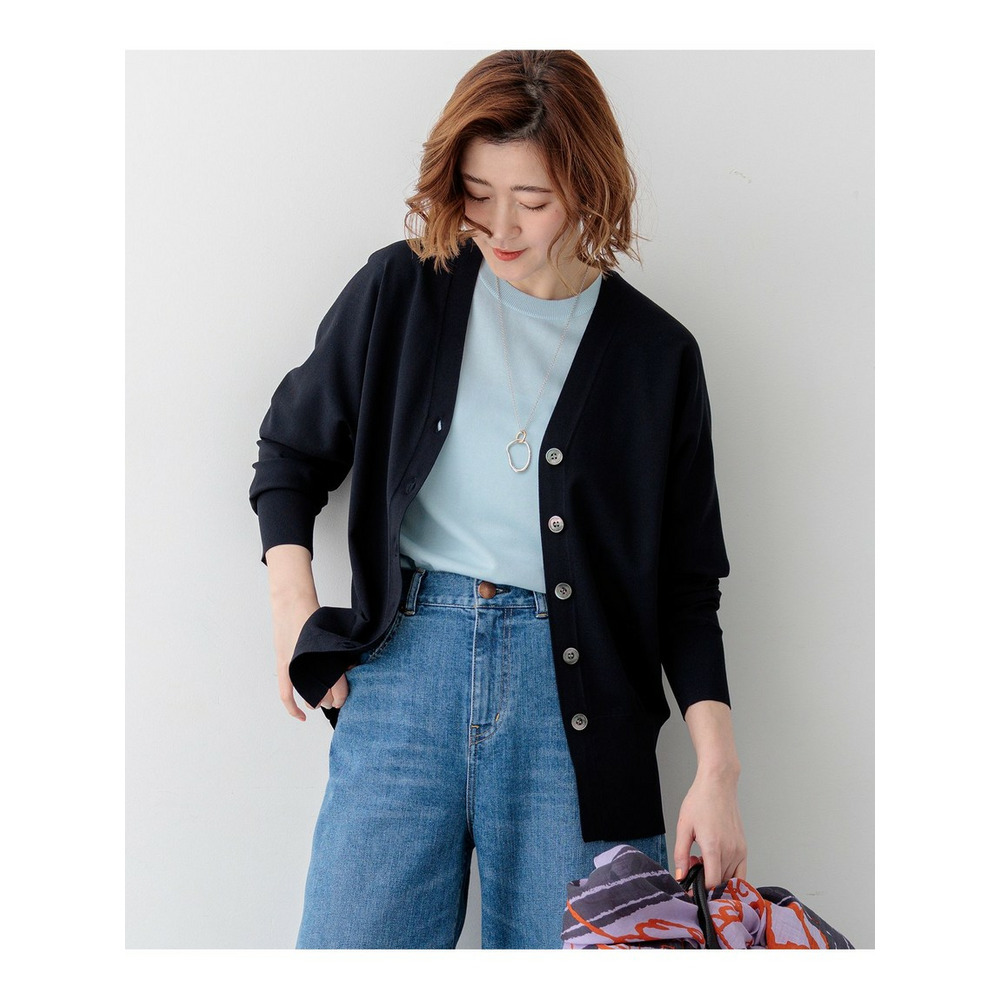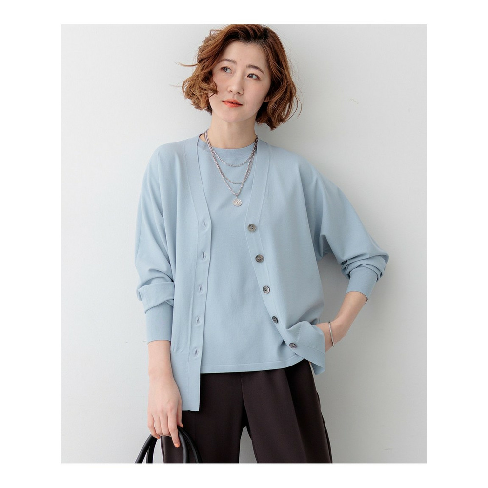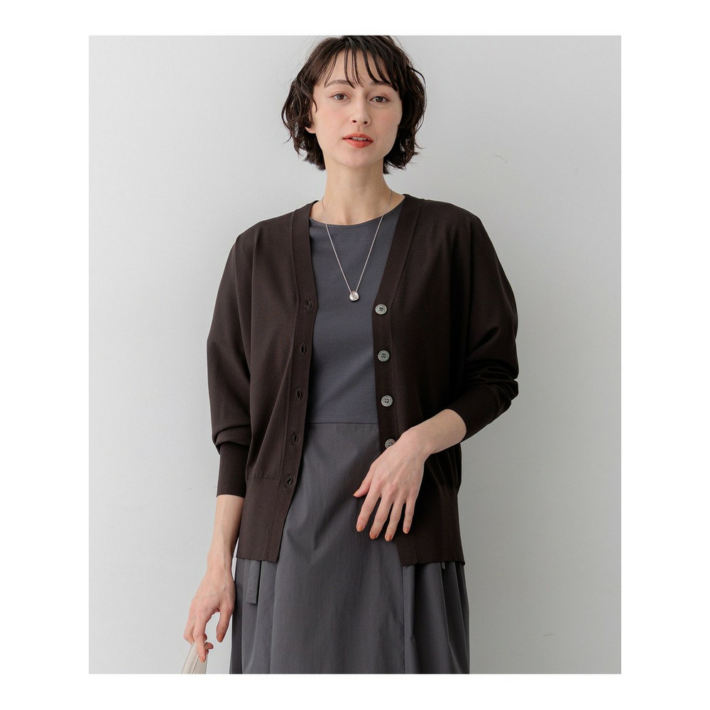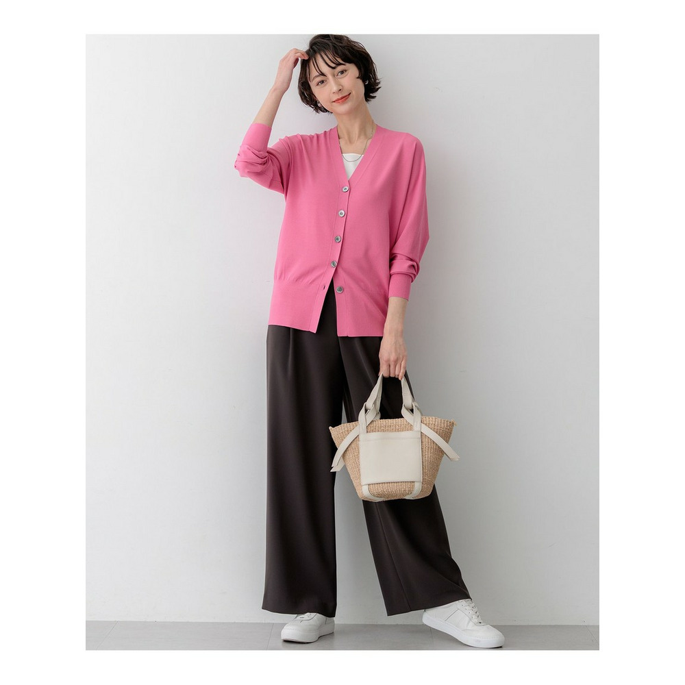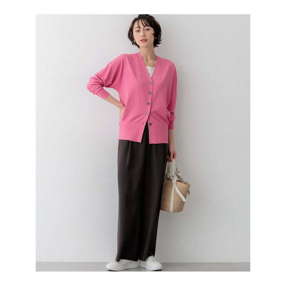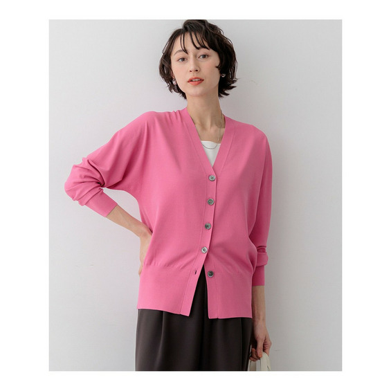 袖から身頃にかけて適度なボリュームを持たせることで立体的なフォルムを出し、メリハリのある美しいシルエットに仕上げた大人のVネックカーディガンです。ボタンを閉めた際に前裾がスリットのようにさりげなく開くデザインが、スタイリングに軽やかな抜け感を演出します。襟を少し後ろに抜いて背中にボリュームを持たせることで、より女性らしく洗練された雰囲気に着こなせます。同素材のトップスとセットアップで合わせれば、オフィスなどのきちんとしたシーンにも対応します。カラーは、着回しやすいホワイト(#001)、知的な印象を醸すネイビー(#075)、パッと目を惹くピンク(#012)、爽やかなスカイブルー(#072)、ニュアンス感のあるダークブラウン(#035)、やわらかな雰囲気のベージュ(#033)の6色展開です。