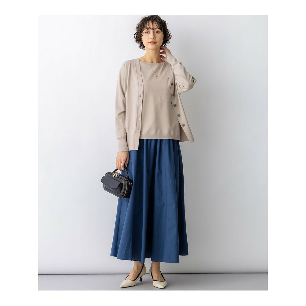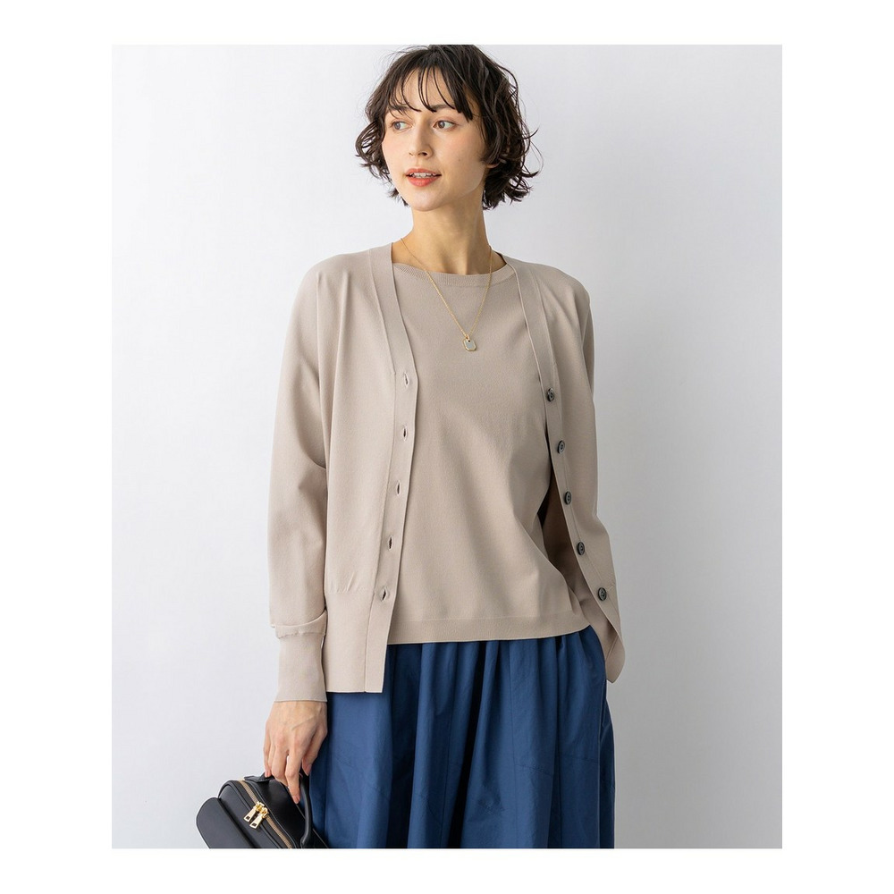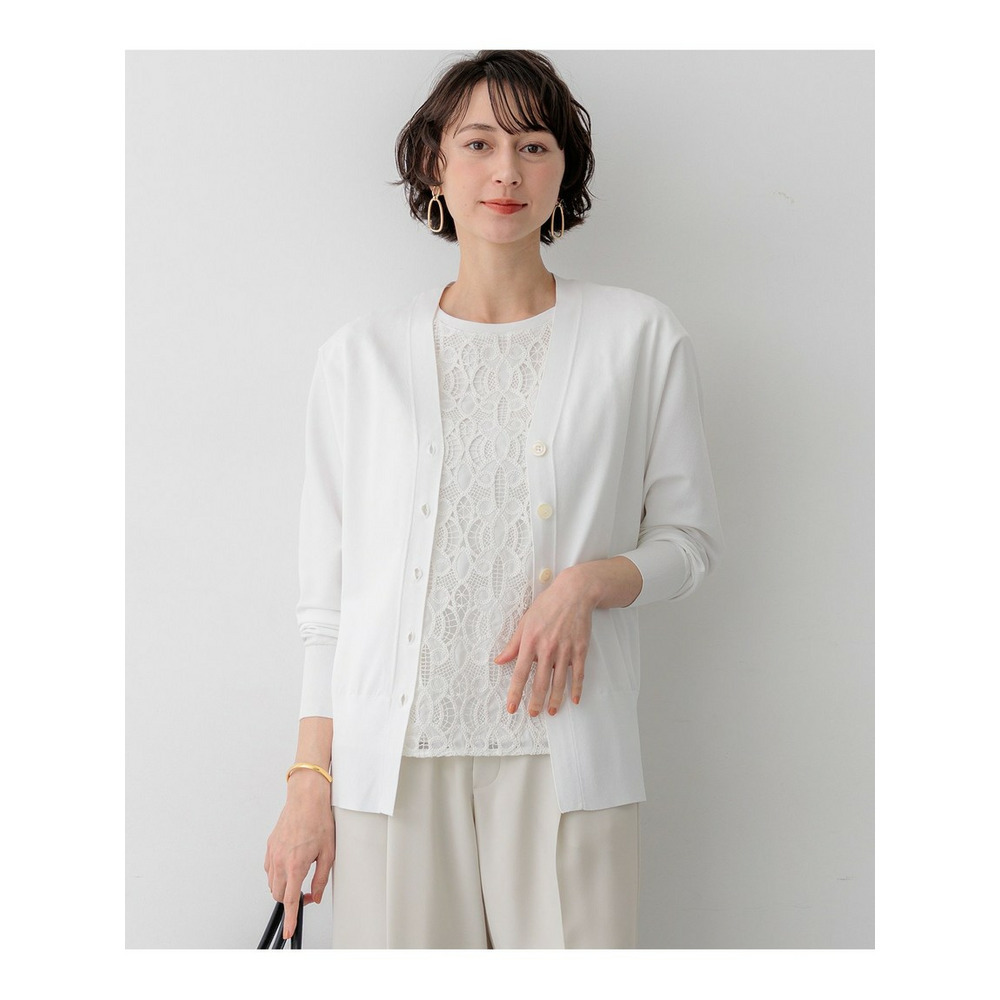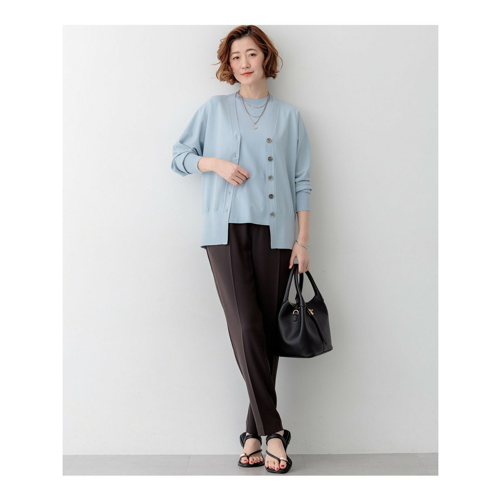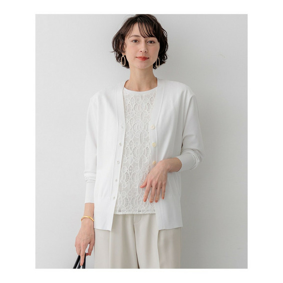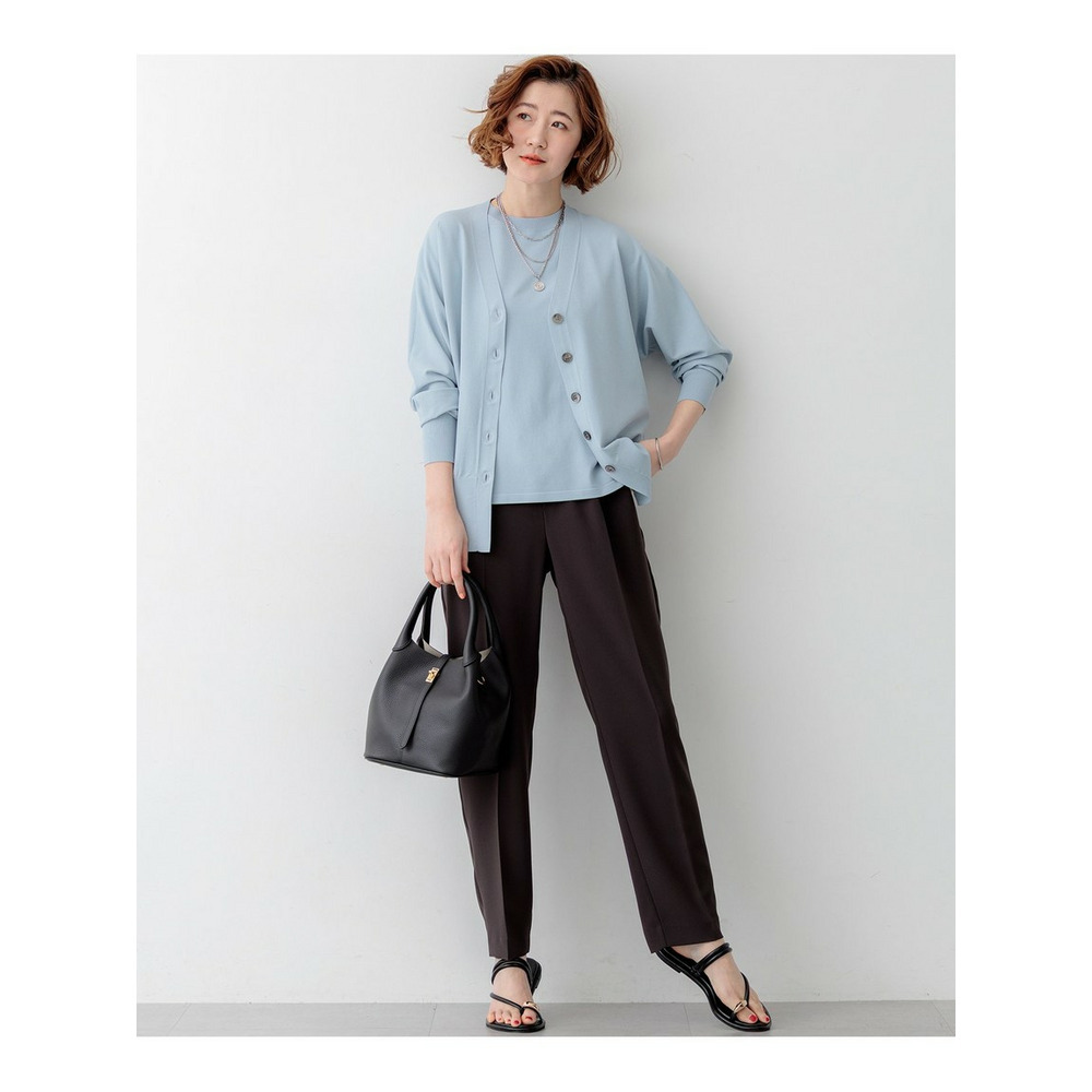 袖から身頃にかけて適度なボリュームを持たせることで立体的なフォルムを出し、メリハリのある美しいシルエットに仕上げた大人のVネックカーディガンです。ボタンを閉めた際に前裾がスリットのようにさりげなく開くデザインが、スタイリングに軽やかな抜け感を演出します。襟を少し後ろに抜いて背中にボリュームを持たせることで、より女性らしく洗練された雰囲気に着こなせます。同素材のトップスとセットアップで合わせれば、オフィスなどのきちんとしたシーンにも対応します。カラーは、着回しやすいホワイト(#001)、知的な印象を醸すネイビー(#075)、パッと目を惹くピンク(#012)、爽やかなスカイブルー(#072)、ニュアンス感のあるダークブラウン(#035)、やわらかな雰囲気のベージュ(#033)の6色展開です。