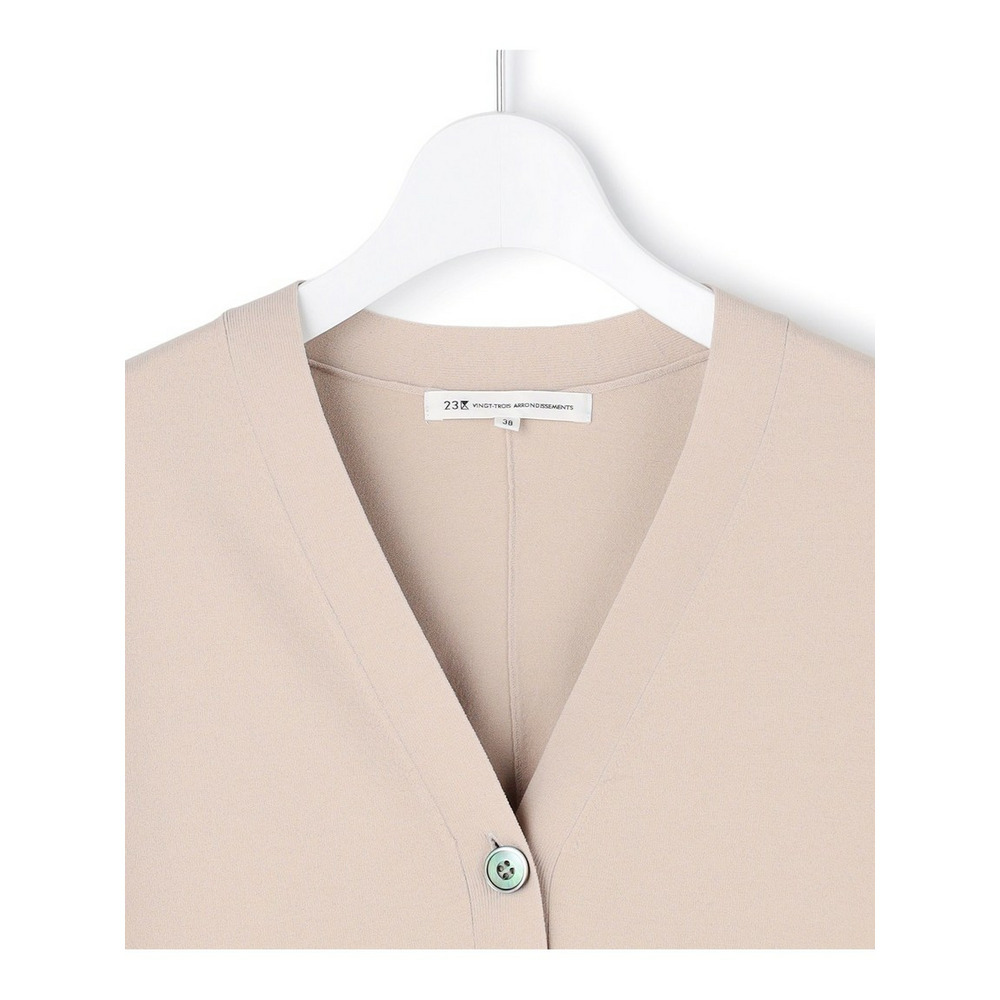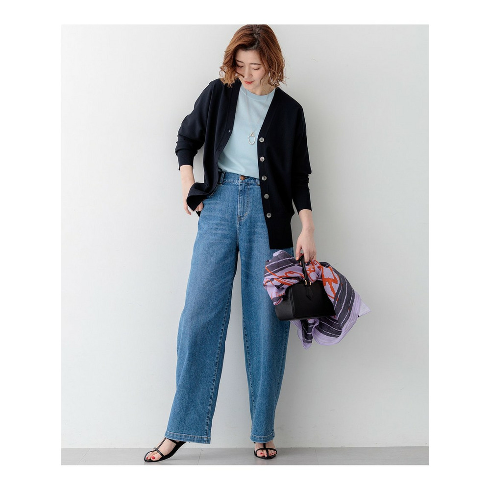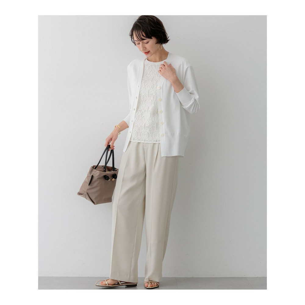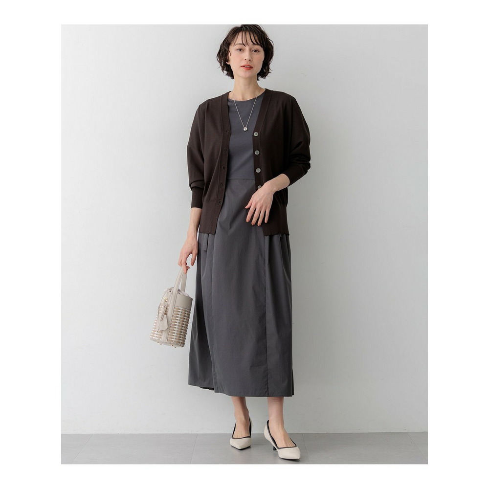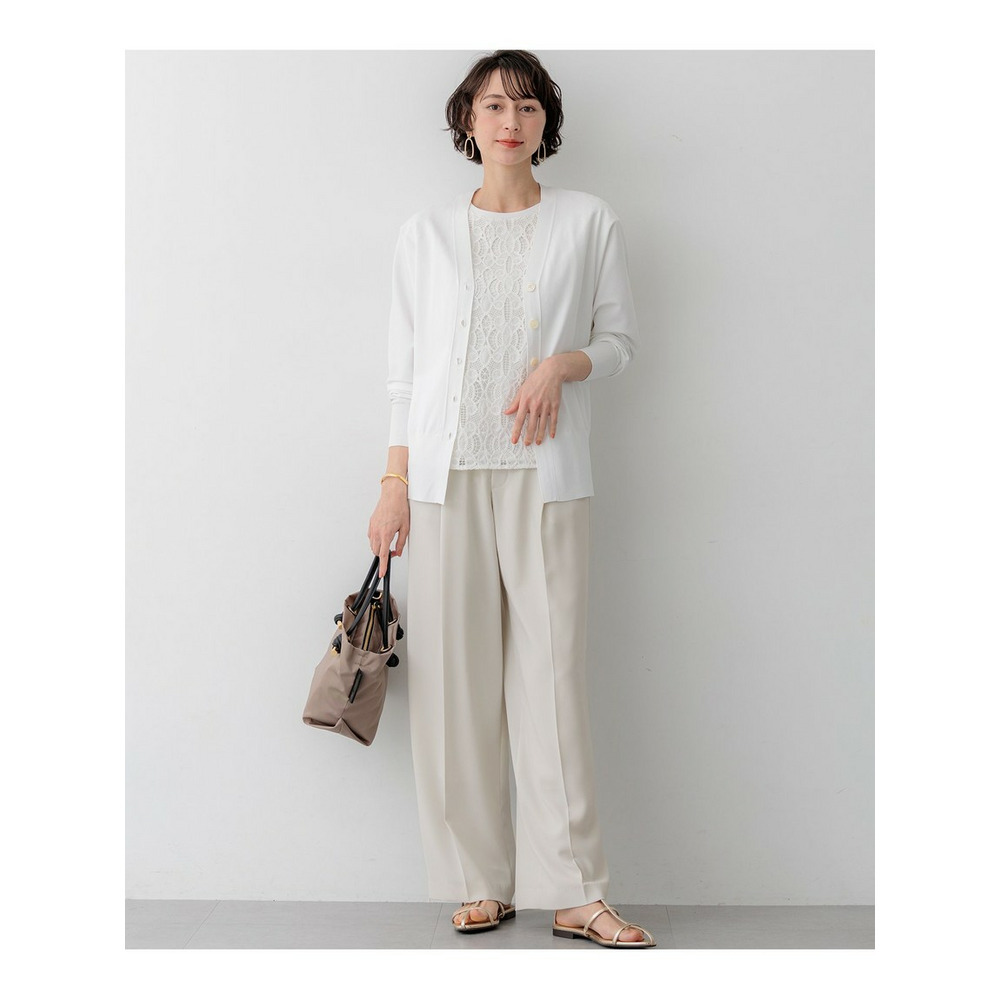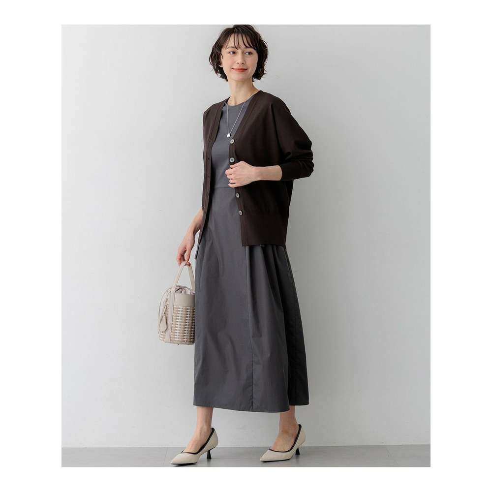 袖から身頃にかけて適度なボリュームを持たせることで立体的なフォルムを出し、メリハリのある美しいシルエットに仕上げた大人のVネックカーディガンです。ボタンを閉めた際に前裾がスリットのようにさりげなく開くデザインが、スタイリングに軽やかな抜け感を演出します。襟を少し後ろに抜いて背中にボリュームを持たせることで、より女性らしく洗練された雰囲気に着こなせます。同素材のトップスとセットアップで合わせれば、オフィスなどのきちんとしたシーンにも対応します。カラーは、着回しやすいホワイト(#001)、知的な印象を醸すネイビー(#075)、パッと目を惹くピンク(#012)、爽やかなスカイブルー(#072)、ニュアンス感のあるダークブラウン(#035)、やわらかな雰囲気のベージュ(#033)の6色展開です。