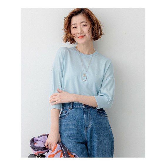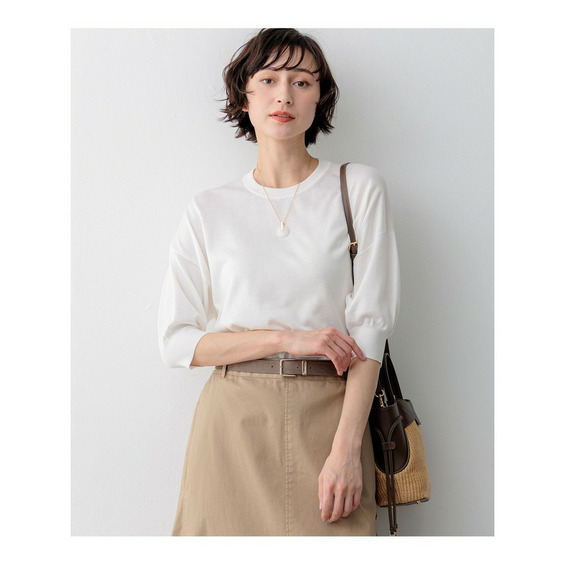 ブラウスのようなきちんと感とカットソーのような気楽さを兼ね備えた、大人のためのニットTシャツです。程よくゆとりのあるサイジングですが、素材特有の美しい落ち感によって、動くたびに女性らしいニュアンスのあるシルエットに。 肘まですっぽりと隠れる袖丈が、気になる二の腕ラインを自然にカバー。締め付け感のないストレスフリーな着心地で、一枚でさらりと着ても様になります。きれいめなテーパードパンツと合わせればオフィスシーンに、デニムやワイドパンツと合わせれば休日のリラックススタイルにと、ボトムスを選ばず幅広いコーディネートで活躍します。 カラーは、清潔感がありどんな色とも相性の良いホワイト(#001)、洒落感のあるキャメル(#034)、爽やかで顔周りを明るく見せるスカイブルー(#072)、シックで知的な印象を与えるネイビー(#075)の4色展開です。