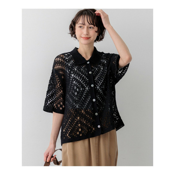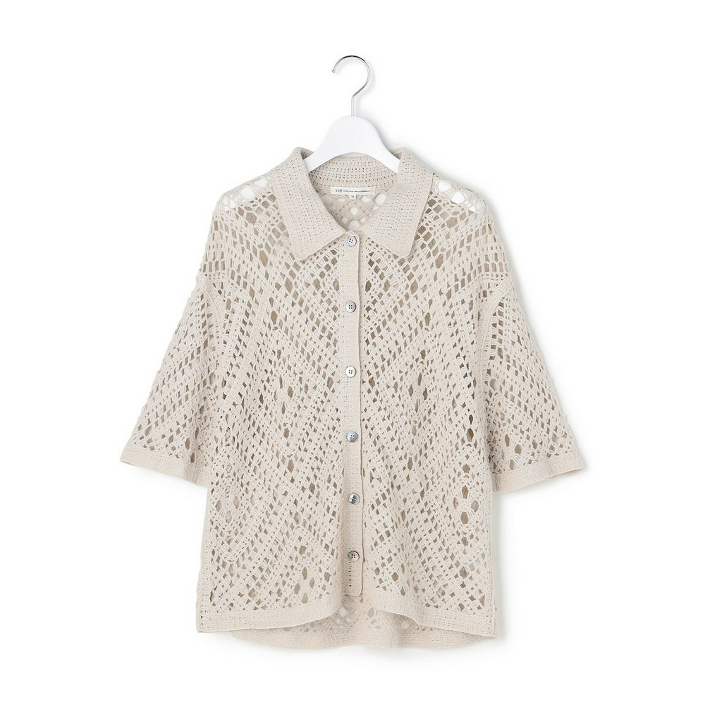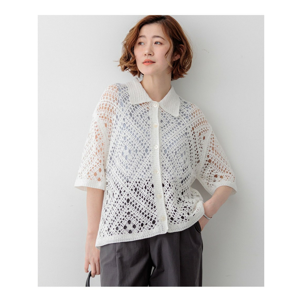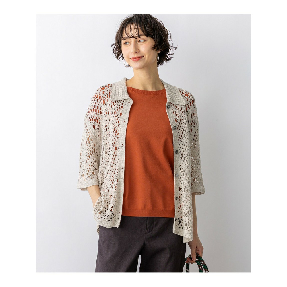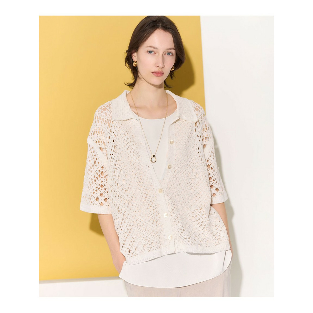 かぎ針編みのような刺繍レースが目を惹く、存在感抜群のポロカーディガンです。襟や前立てのシンプルな柄でトリミングすることで大人の女性でも上品に着こなせる一枚に仕上げました。身体のラインを拾いすぎない程よくゆとりのあるシルエットが、リラックス感のある着心地を叶えます。 ボタンを留めて一枚着風に着るのはもちろん、インナーにキャミソールやタンクトップを合わせて、カーディガンとして羽織るレイヤードスタイルもおすすめです。カラーは、清潔感があり顔周りを明るく見せるホワイト(#001)、シックで洗練された印象を与えるブラック(#005)、肌なじみが良くナチュラルな雰囲気のベージュ(#033)の3色展開です。