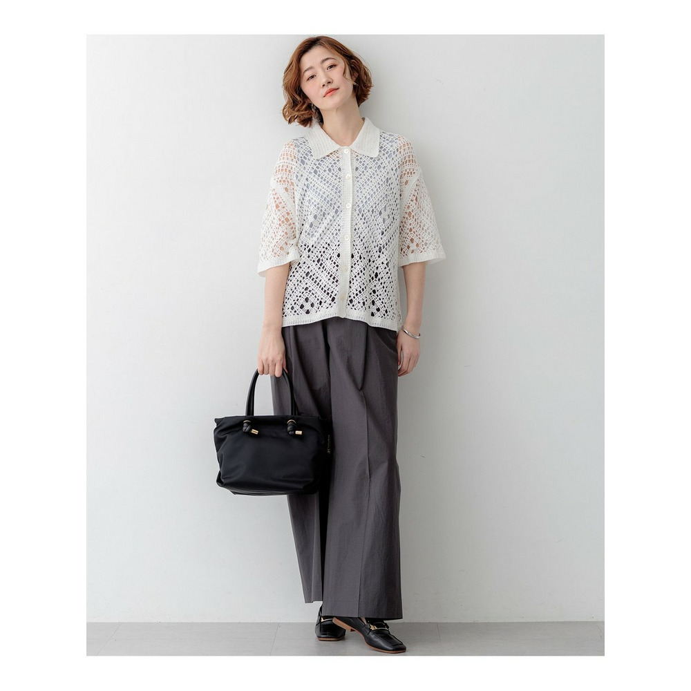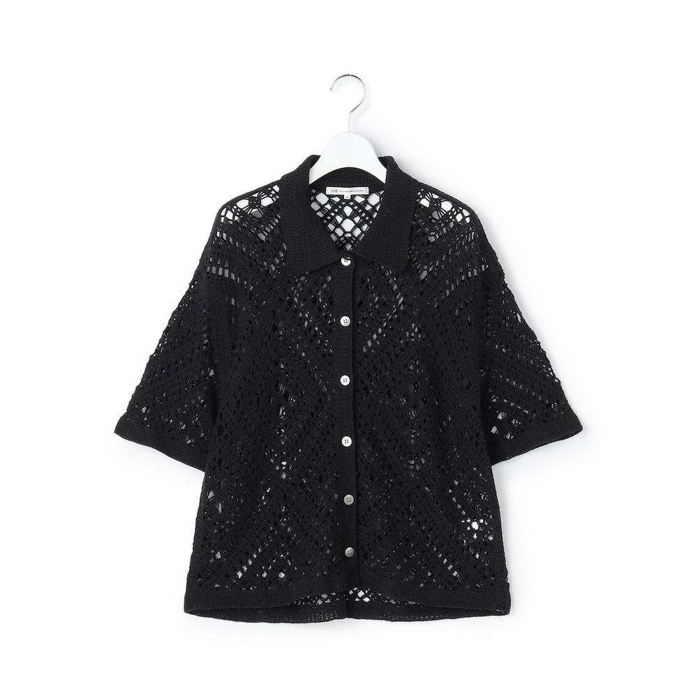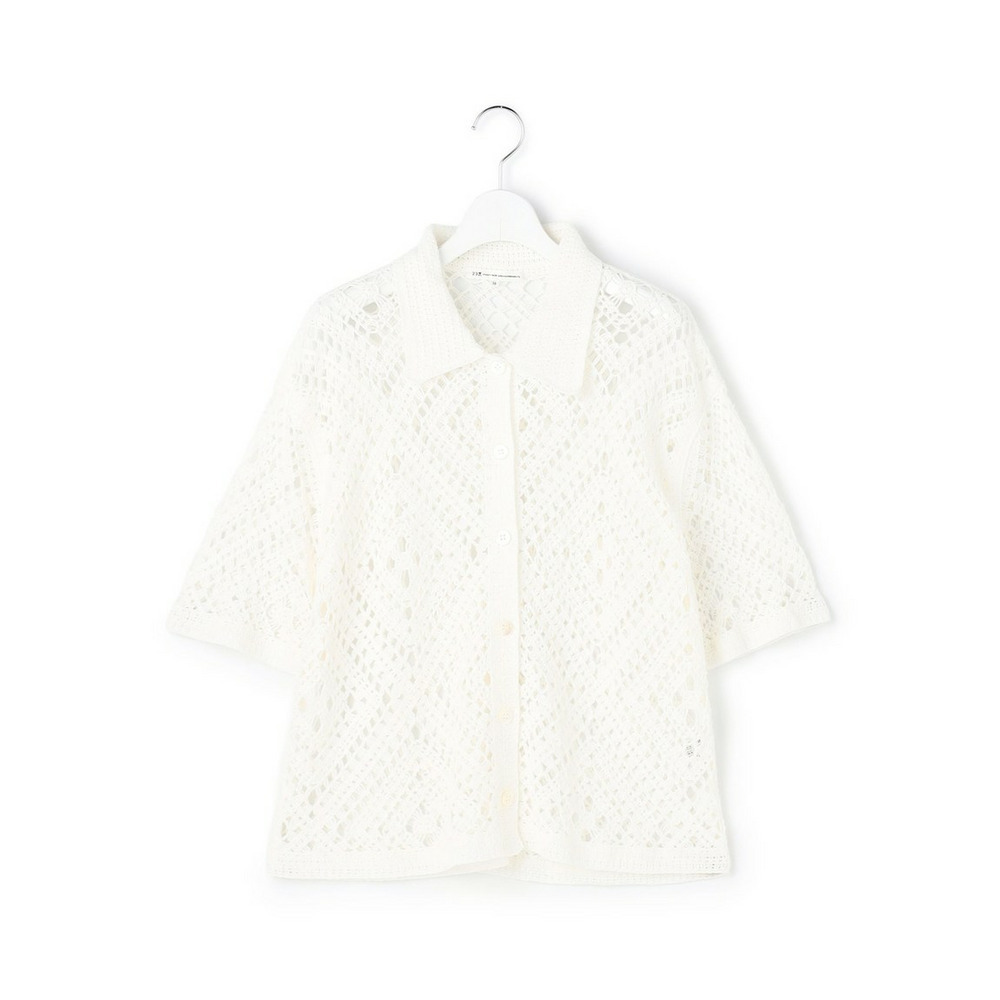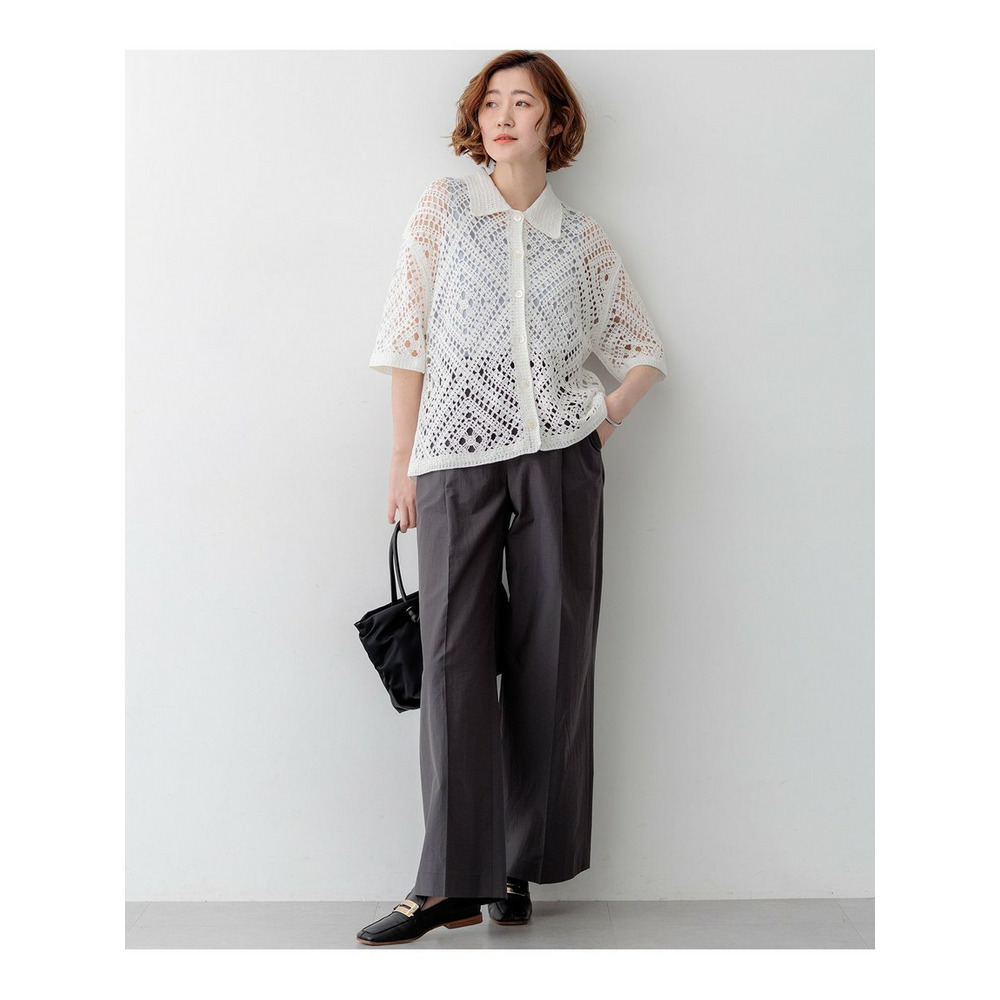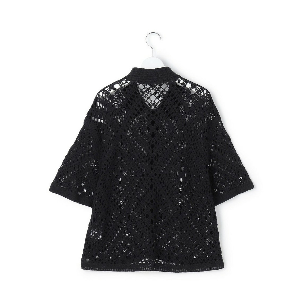 かぎ針編みのような刺繍レースが目を惹く、存在感抜群のポロカーディガンです。襟や前立てのシンプルな柄でトリミングすることで大人の女性でも上品に着こなせる一枚に仕上げました。身体のラインを拾いすぎない程よくゆとりのあるシルエットが、リラックス感のある着心地を叶えます。 ボタンを留めて一枚着風に着るのはもちろん、インナーにキャミソールやタンクトップを合わせて、カーディガンとして羽織るレイヤードスタイルもおすすめです。カラーは、清潔感があり顔周りを明るく見せるホワイト(#001)、シックで洗練された印象を与えるブラック(#005)、肌なじみが良くナチュラルな雰囲気のベージュ(#033)の3色展開です。