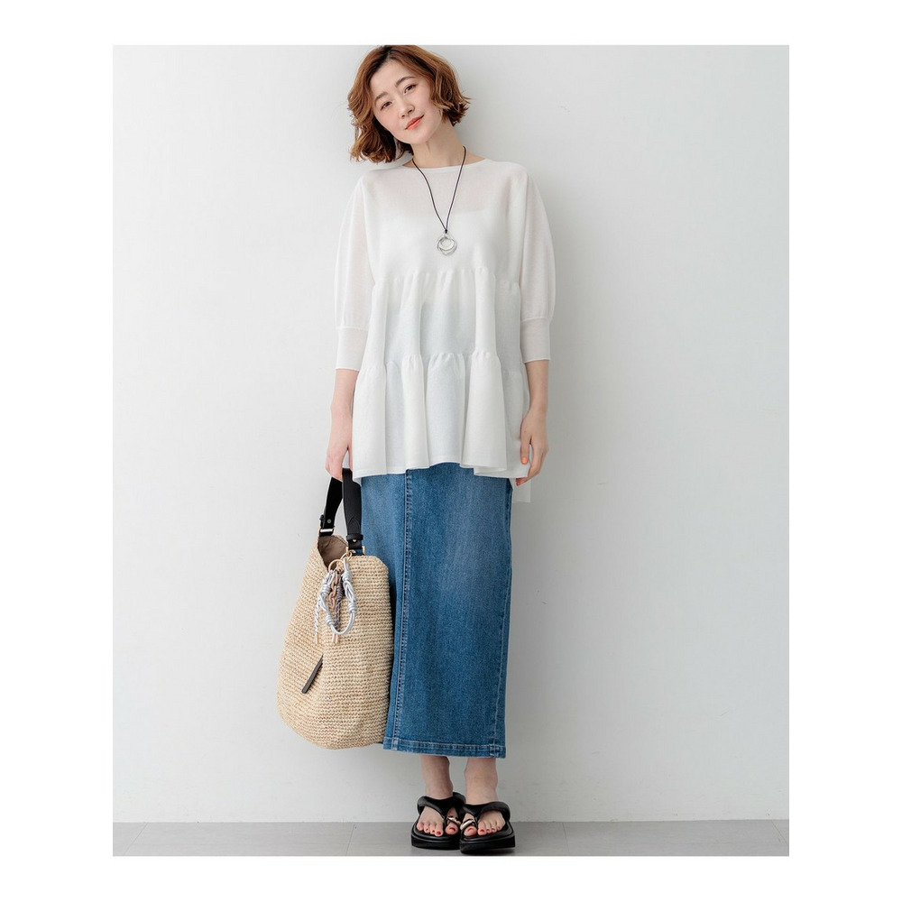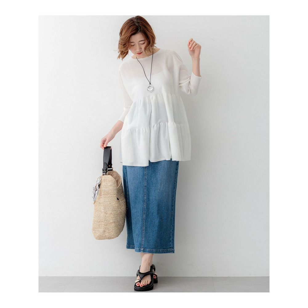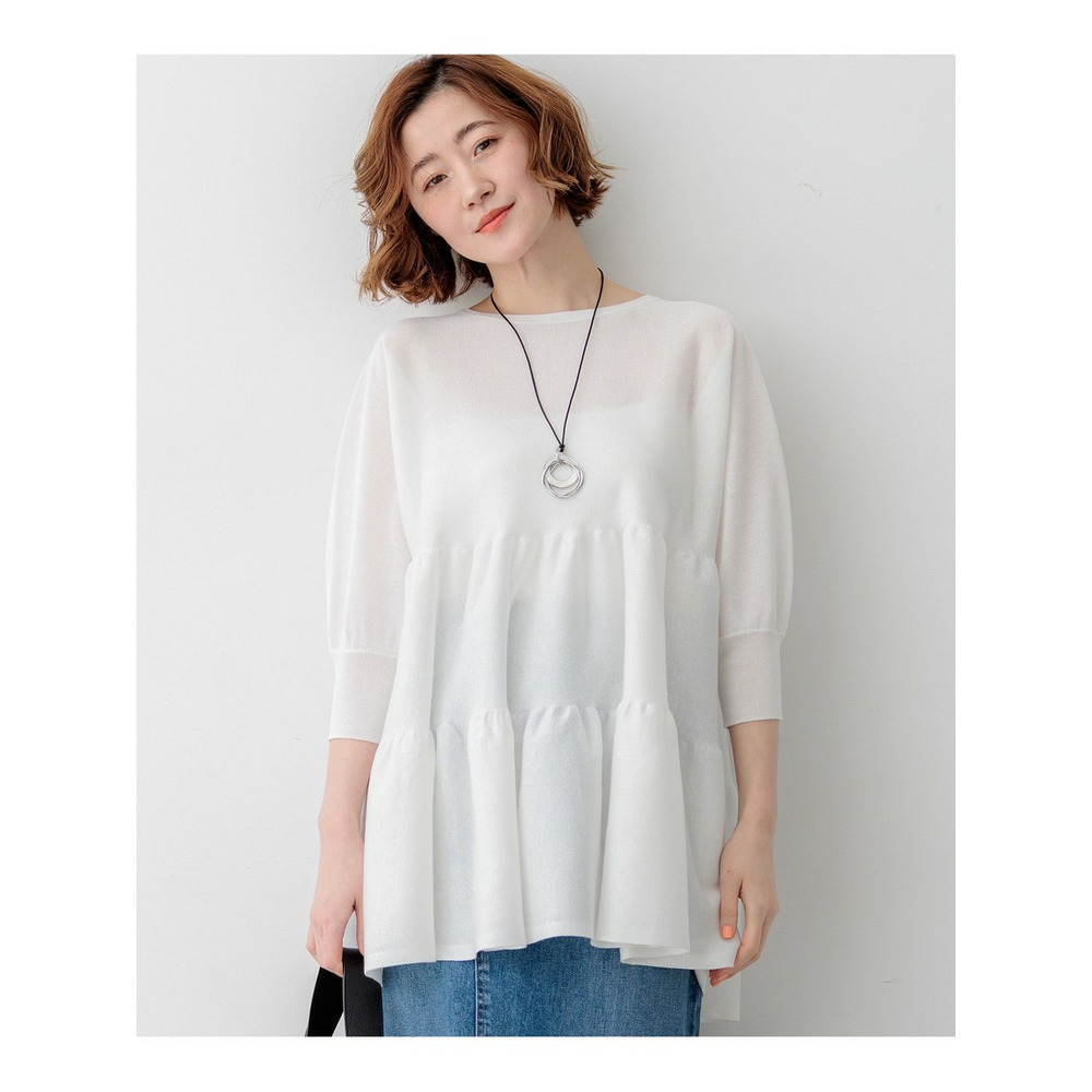 大人の女性にも着こなしやすい、シアー感を抑えた程よい甘さのティアードデザインが魅力のチュニック丈プルオーバーです。切り替え部分を縫い合わせずに編み続きにすることで、縫い代のごわつきやハリを抑え、すとんと落ちる美しいシルエットを実現しました。ボリューム感がありながらも着膨れせず、すっきりとスタイルアップして見せてくれる優秀な一枚です。ヒップが隠れる安心の着丈と、体のラインを拾わないドルマンスリーブが、気になる部分を自然にカバーしてくれます。細身のパンツと合わせたメリハリのあるスタイリングや、ワイドパンツと合わせたリラックス感のあるコーディネートなど、合わせるボトムスを選ばず幅広いシーンで活躍します。カラーは、清涼感のあるホワイト(#001)、シックで万能なブラック(#005)、落ち着いた雰囲気のダークブラウン(#035)の3色展開です。