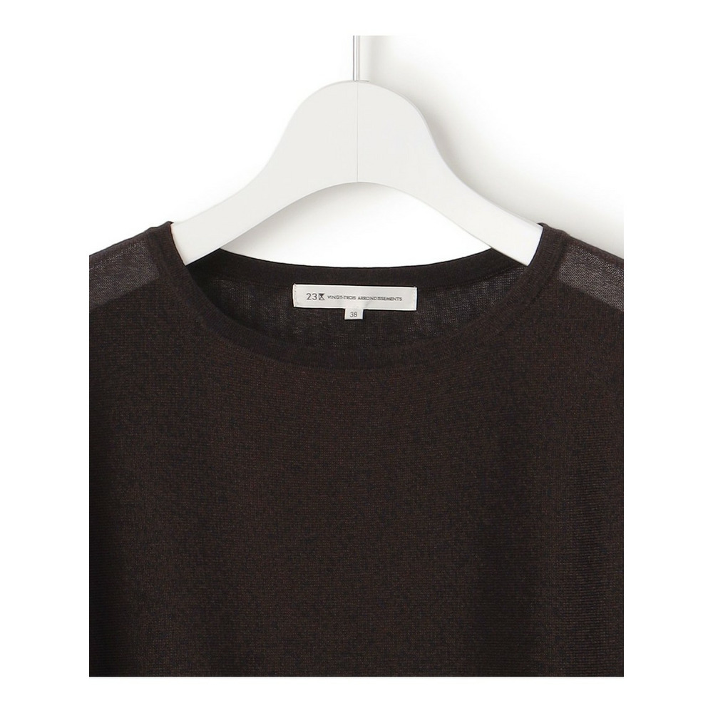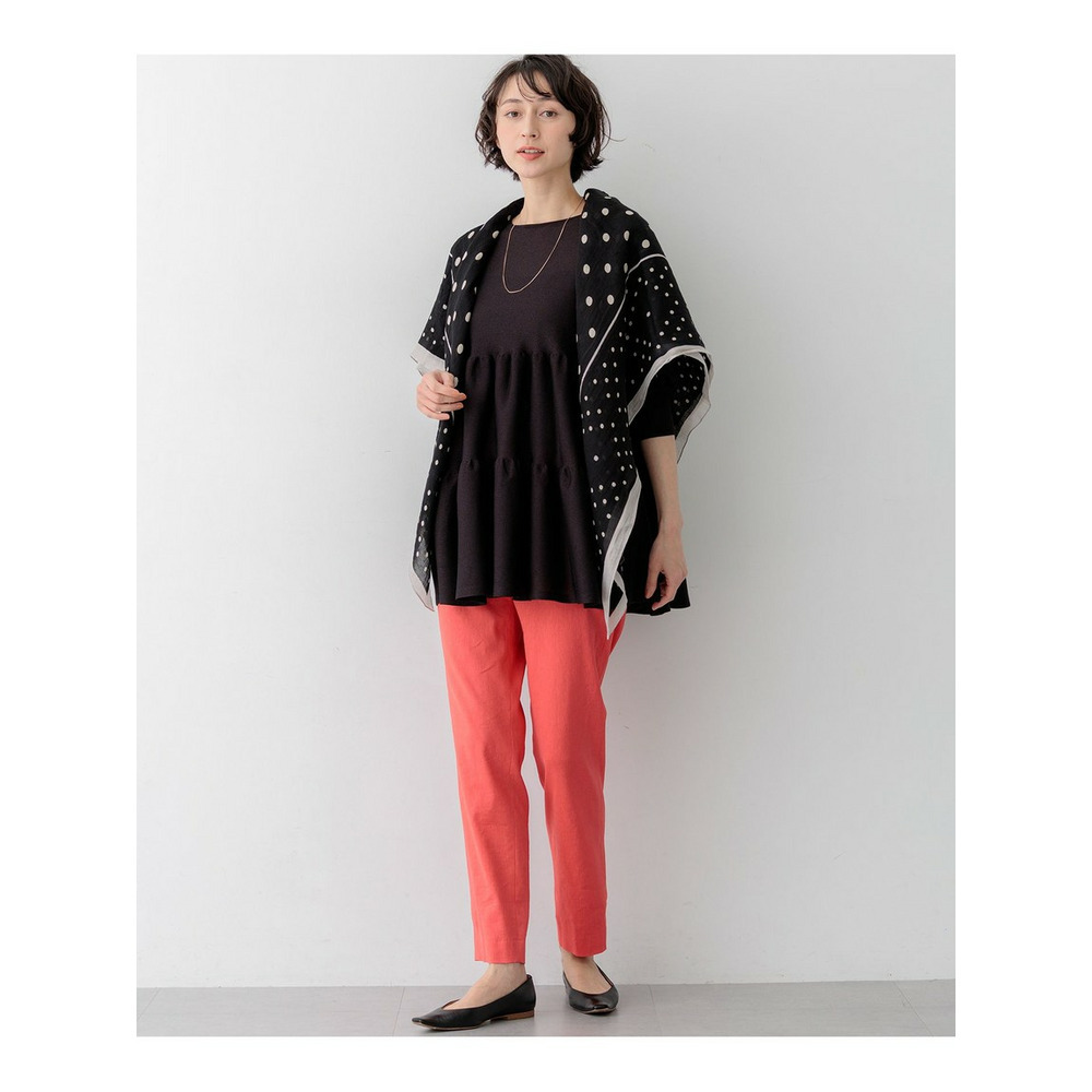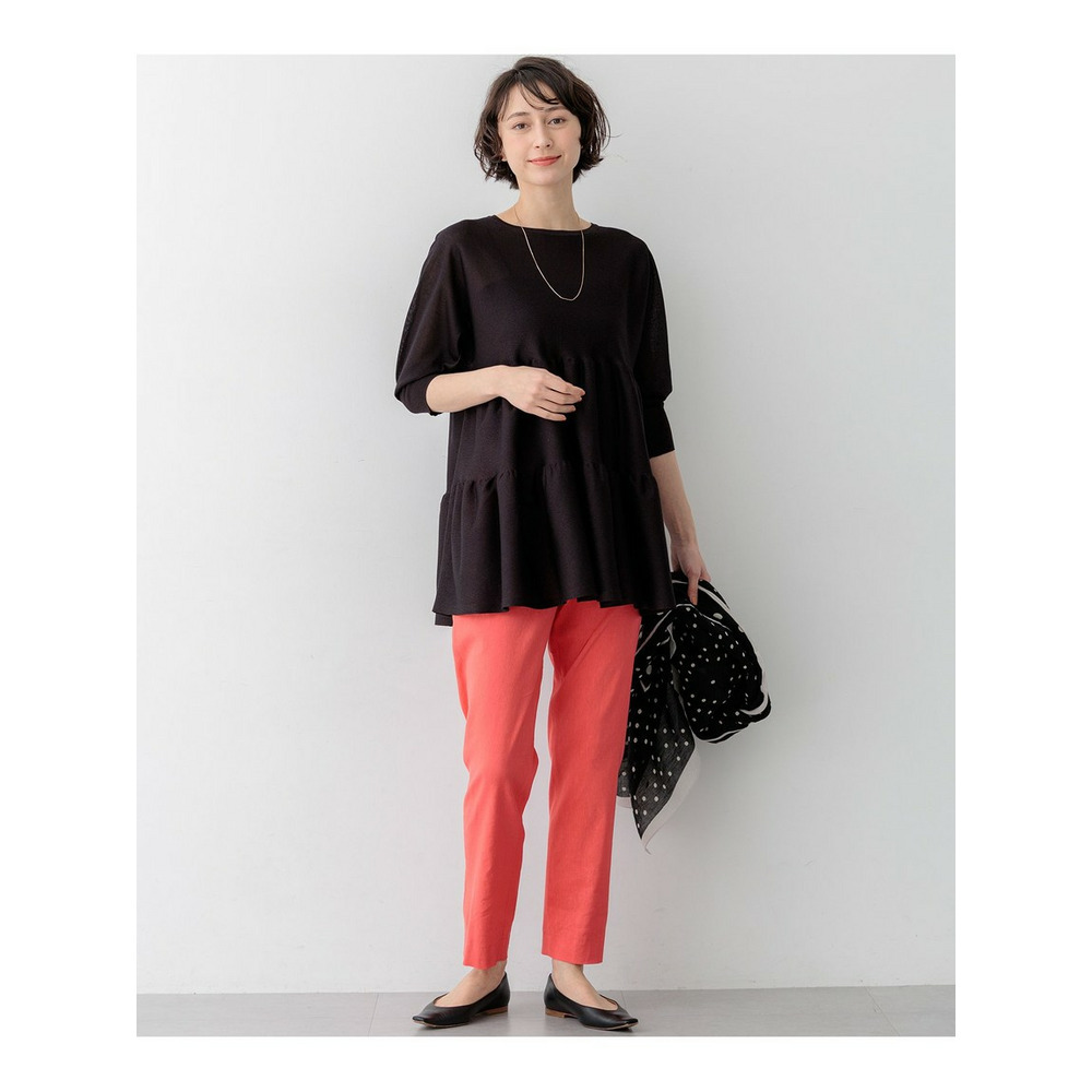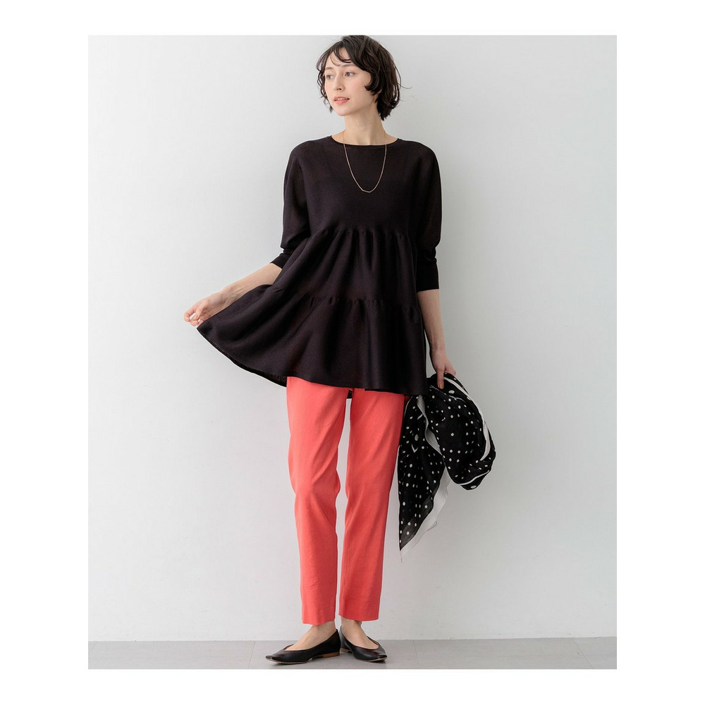 大人の女性にも着こなしやすい、シアー感を抑えた程よい甘さのティアードデザインが魅力のチュニック丈プルオーバーです。切り替え部分を縫い合わせずに編み続きにすることで、縫い代のごわつきやハリを抑え、すとんと落ちる美しいシルエットを実現しました。ボリューム感がありながらも着膨れせず、すっきりとスタイルアップして見せてくれる優秀な一枚です。ヒップが隠れる安心の着丈と、体のラインを拾わないドルマンスリーブが、気になる部分を自然にカバーしてくれます。細身のパンツと合わせたメリハリのあるスタイリングや、ワイドパンツと合わせたリラックス感のあるコーディネートなど、合わせるボトムスを選ばず幅広いシーンで活躍します。カラーは、清涼感のあるホワイト(#001)、シックで万能なブラック(#005)、落ち着いた雰囲気のダークブラウン(#035)の3色展開です。