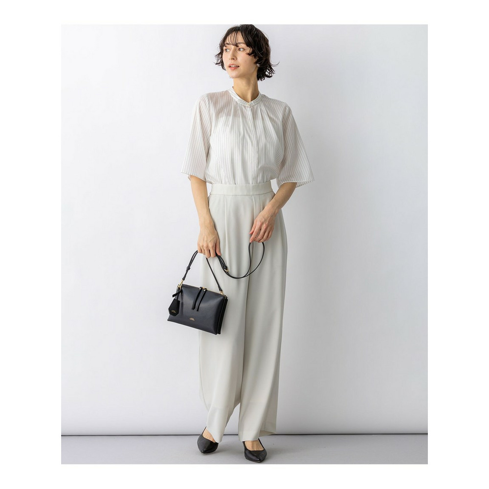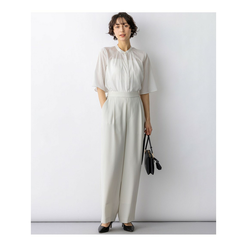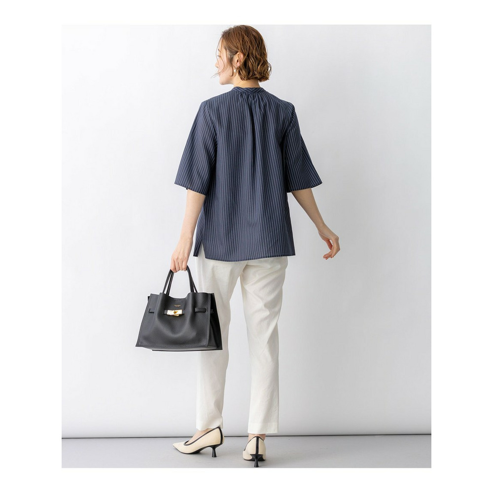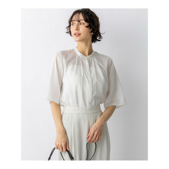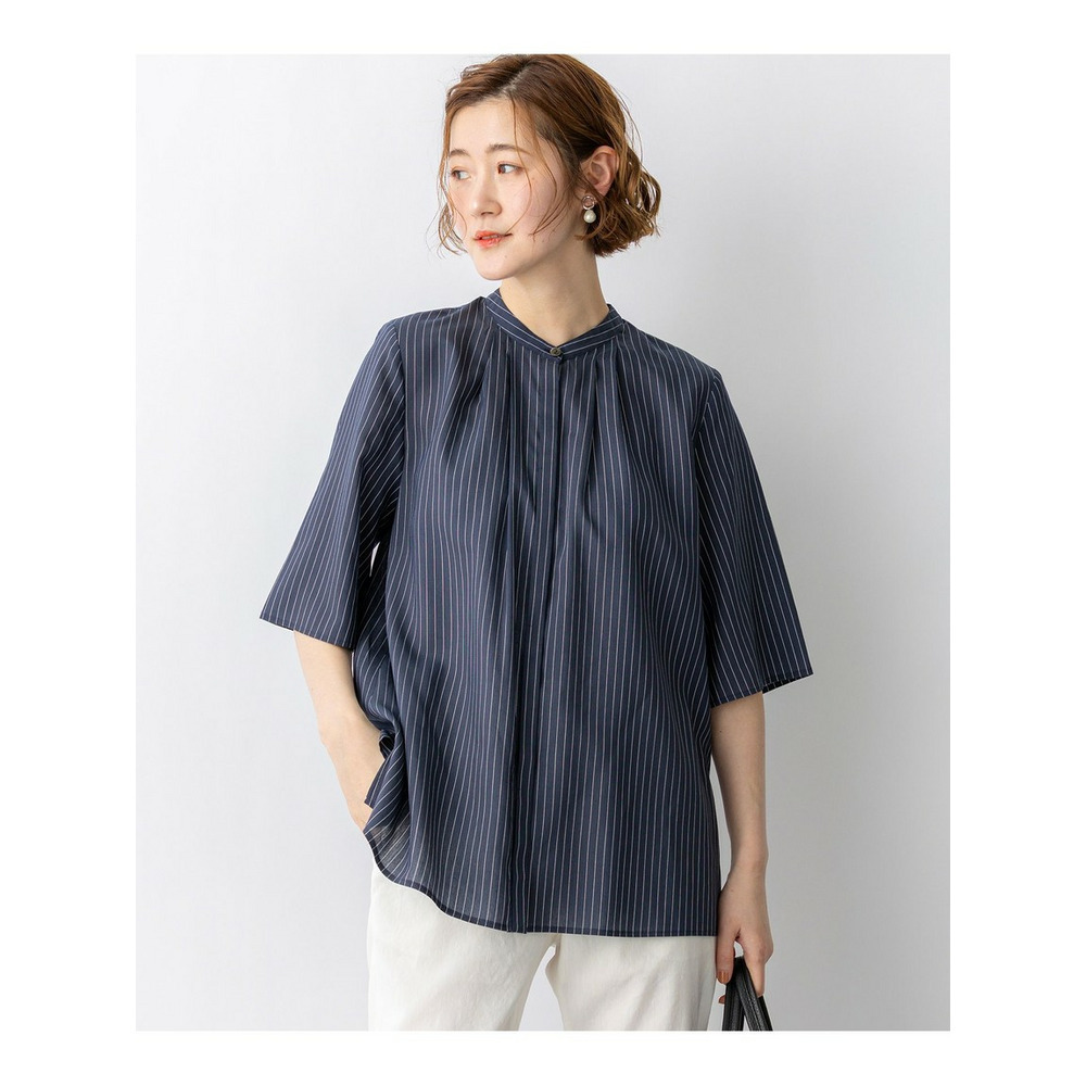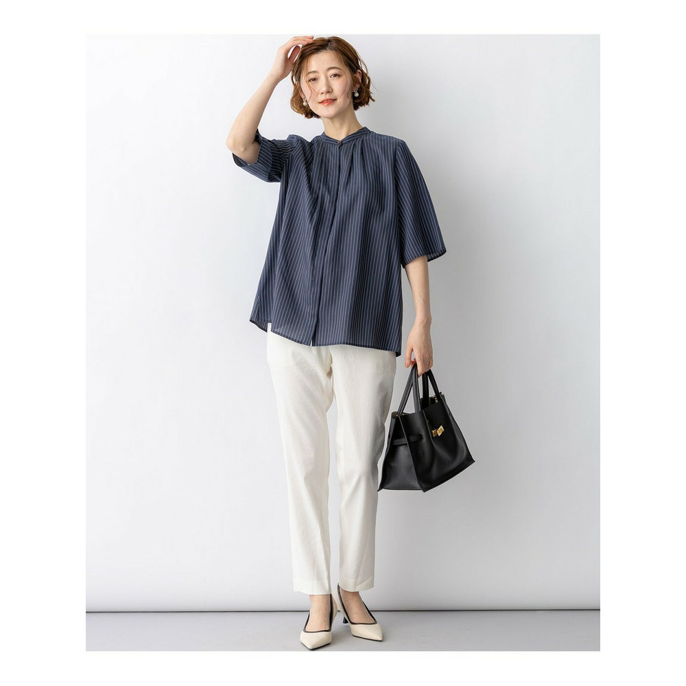 さらっとした質感と、ほんのりとした透け感が涼しげなストライプ柄のバンドカラーブラウスです。フロントに施されたタックデザインが縦のラインを強調し、着用するだけですっきりとしたシャープな印象を与えます。首元のボタンを留めてきちんと感のあるバンドカラーとしてはもちろん、ボタンを外してスキッパー襟のように着用できる仕様も魅力。デコルテをきれいに見せ、程よい抜け感を演出します。ゆとりのあるシルエットでボディラインを拾いにくく、気になる部分を自然にカバーしてくれるのも嬉しいポイントです。すっきりとしたテーパードパンツと合わせてオフィススタイルに、またジャケットのインナーとして合わせてももたつかず、スマートに決まります。カラーは、清涼感あふれるホワイト(#101)と、知的で落ち着いた印象のネイビー(#175)の2色展開です。