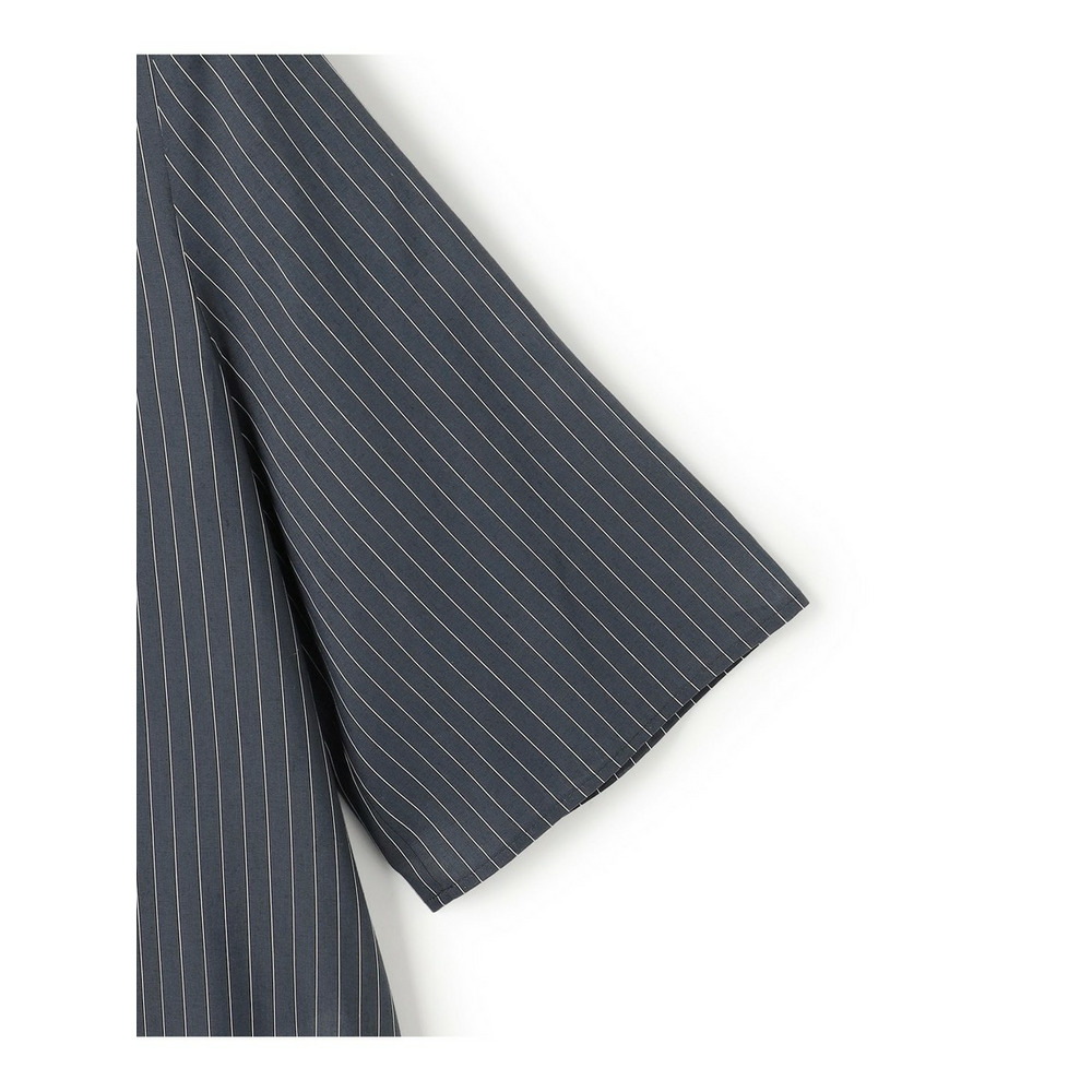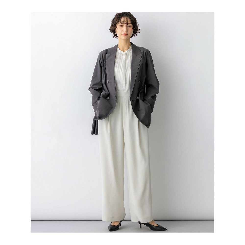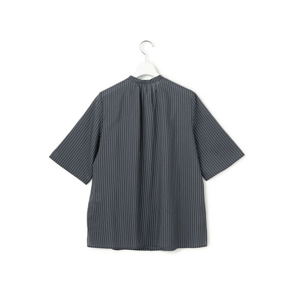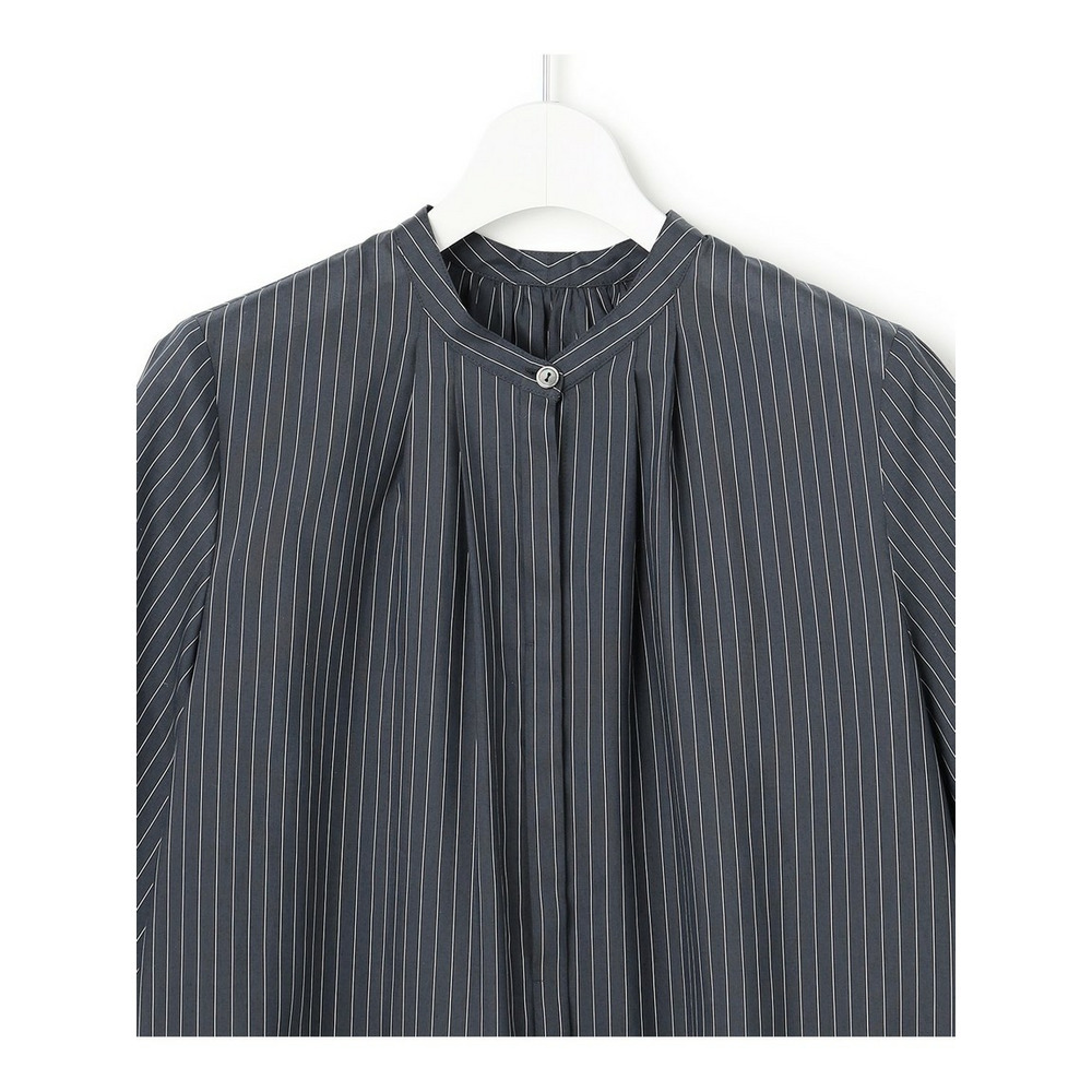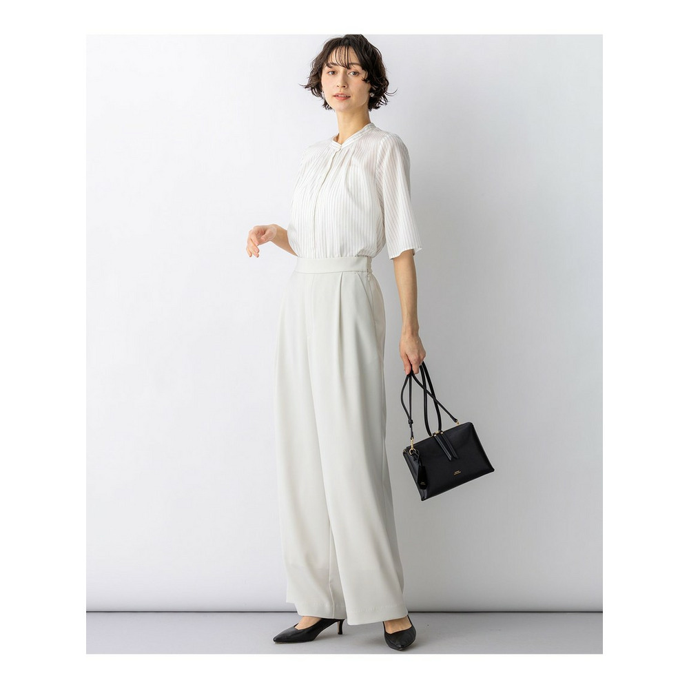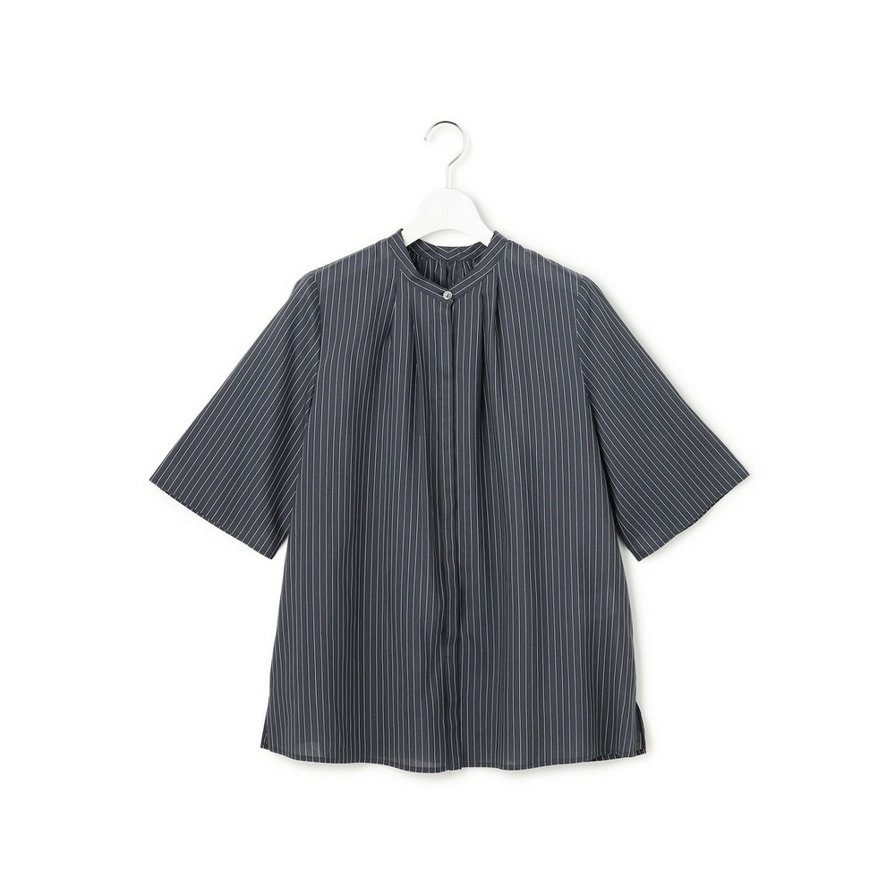 さらっとした質感と、ほんのりとした透け感が涼しげなストライプ柄のバンドカラーブラウスです。フロントに施されたタックデザインが縦のラインを強調し、着用するだけですっきりとしたシャープな印象を与えます。首元のボタンを留めてきちんと感のあるバンドカラーとしてはもちろん、ボタンを外してスキッパー襟のように着用できる仕様も魅力。デコルテをきれいに見せ、程よい抜け感を演出します。ゆとりのあるシルエットでボディラインを拾いにくく、気になる部分を自然にカバーしてくれるのも嬉しいポイントです。すっきりとしたテーパードパンツと合わせてオフィススタイルに、またジャケットのインナーとして合わせてももたつかず、スマートに決まります。カラーは、清涼感あふれるホワイト(#101)と、知的で落ち着いた印象のネイビー(#175)の2色展開です。