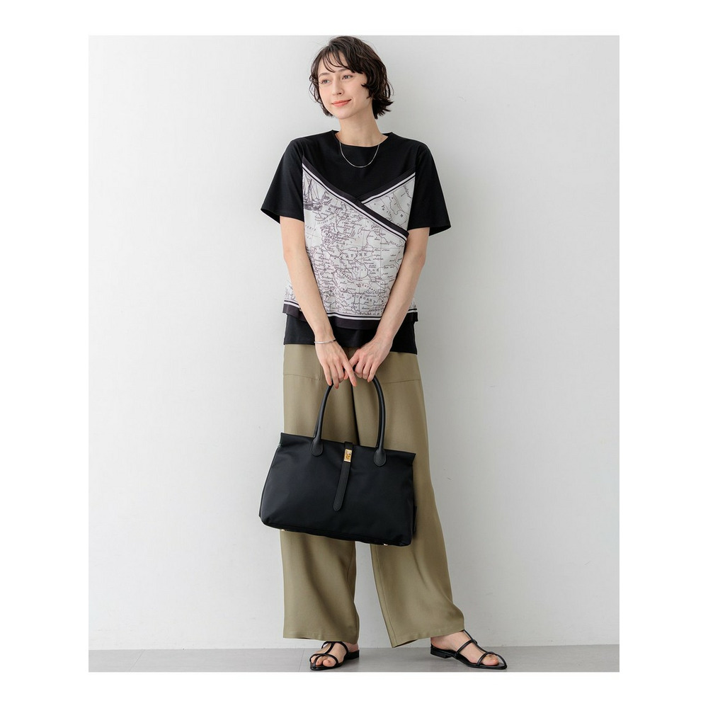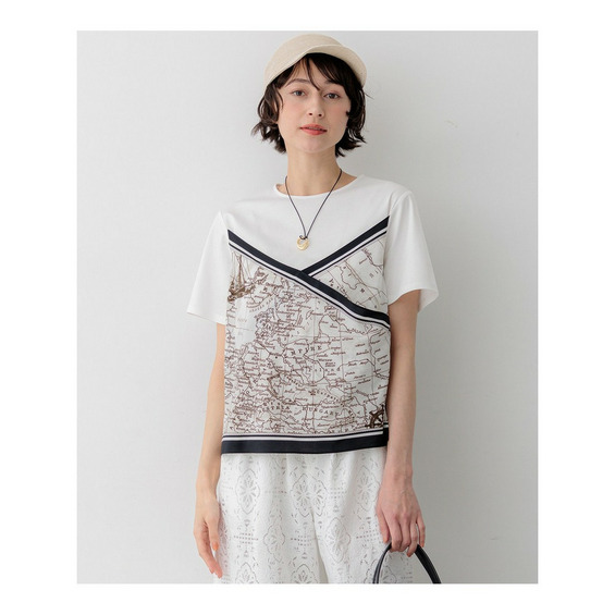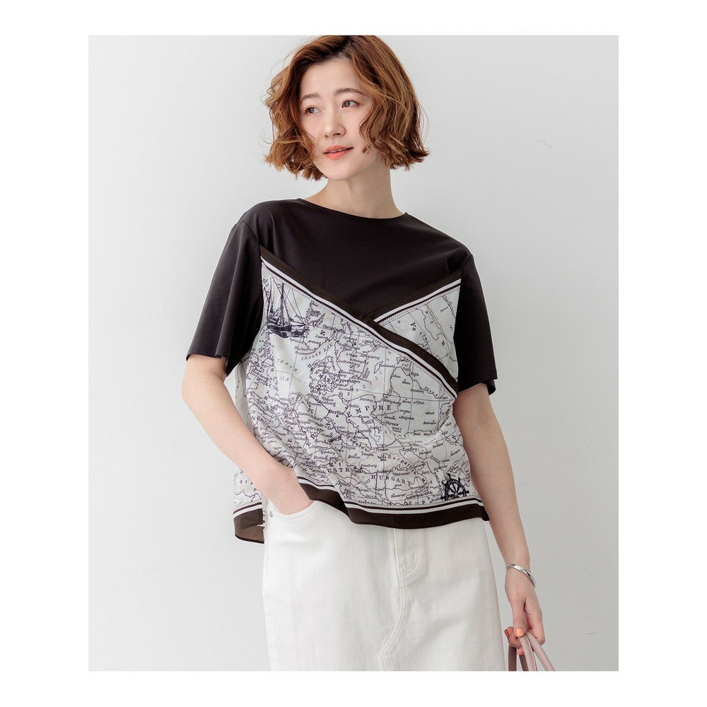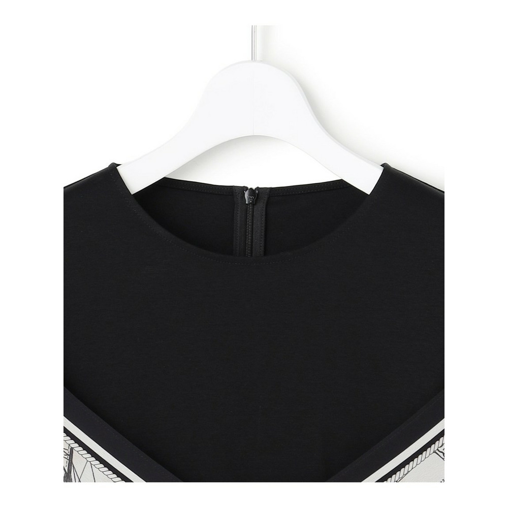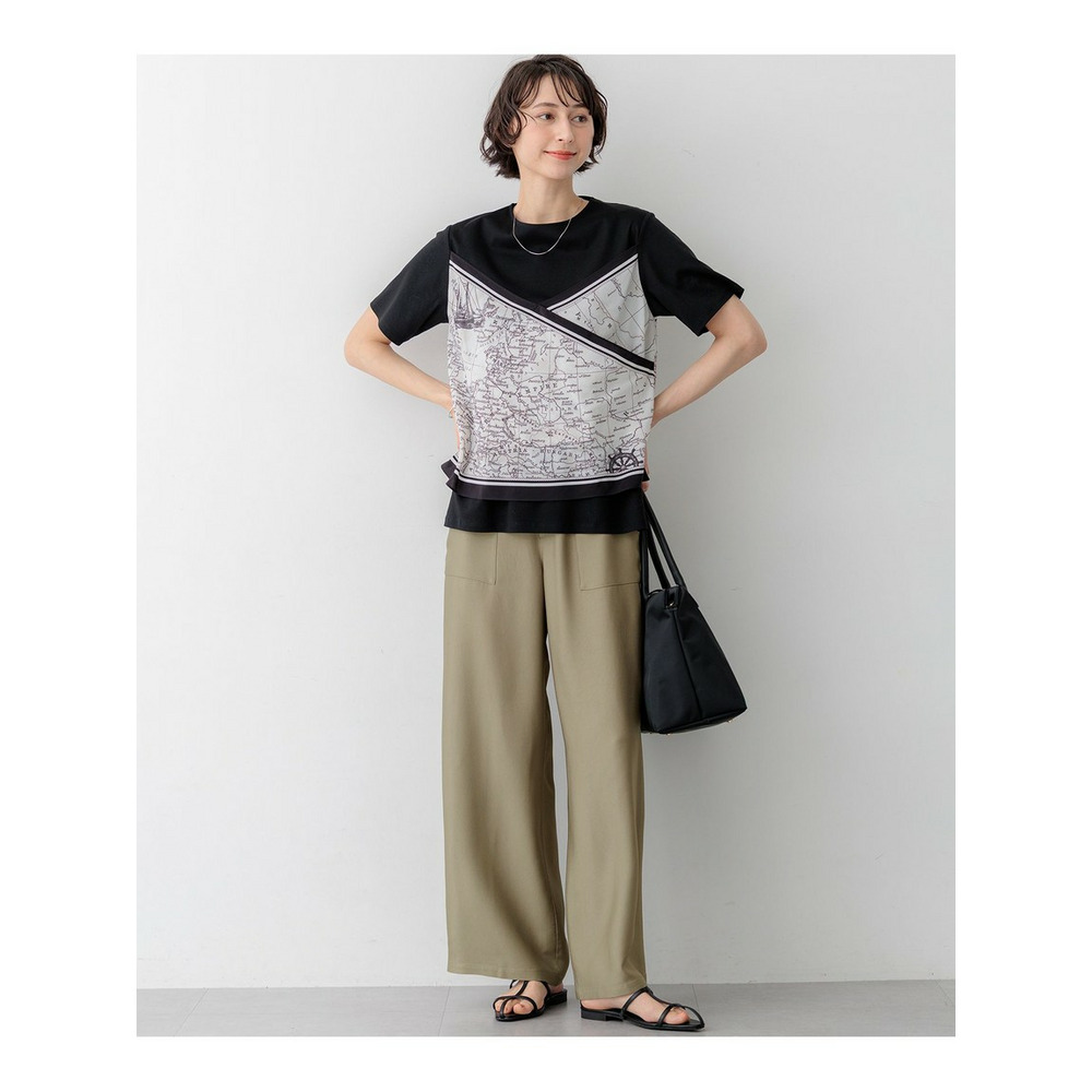 身頃には毛羽立ちを抑えた滑らかな肌触りのスムースジャージー素材を使用しています。程よい厚みがあり透けにくいため、一枚でも安心してご着用いただけます。プリント部分には、このアイテムのパターンに合わせて図案を作成した23区オリジナルのスカーフ柄を採用しており、特別感のある仕上がりです。