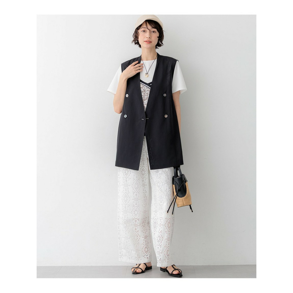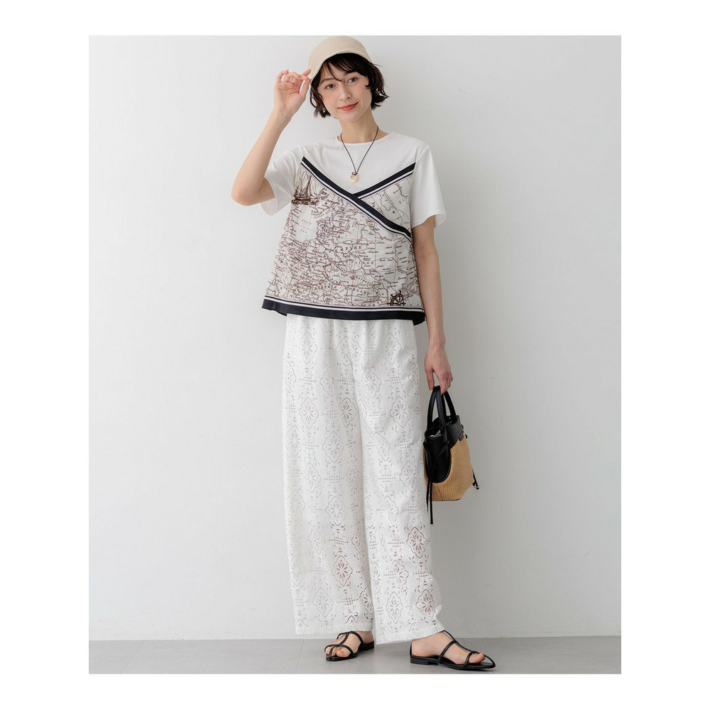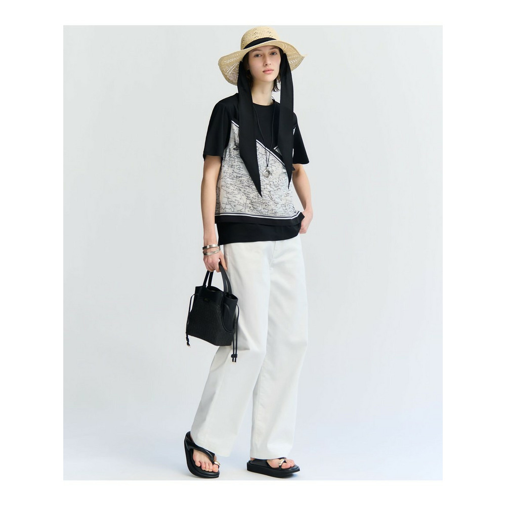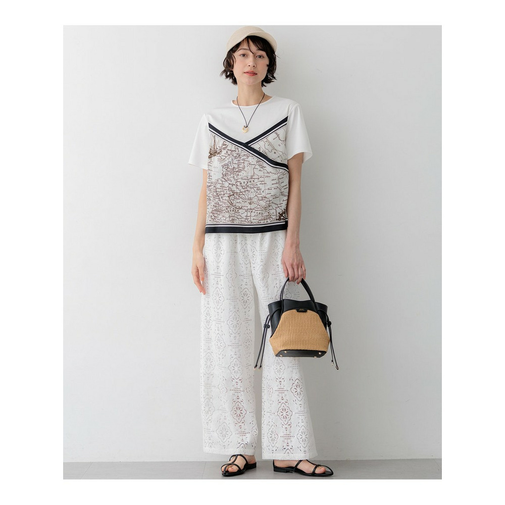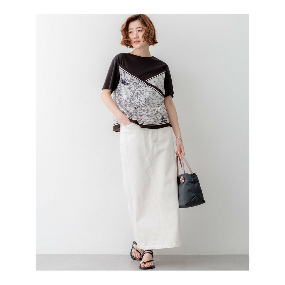 身頃には毛羽立ちを抑えた滑らかな肌触りのスムースジャージー素材を使用しています。程よい厚みがあり透けにくいため、一枚でも安心してご着用いただけます。プリント部分には、このアイテムのパターンに合わせて図案を作成した23区オリジナルのスカーフ柄を採用しており、特別感のある仕上がりです。