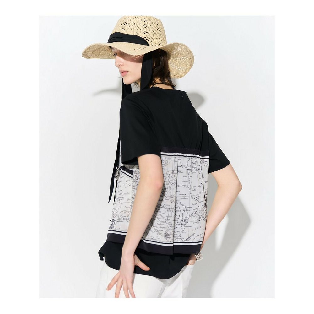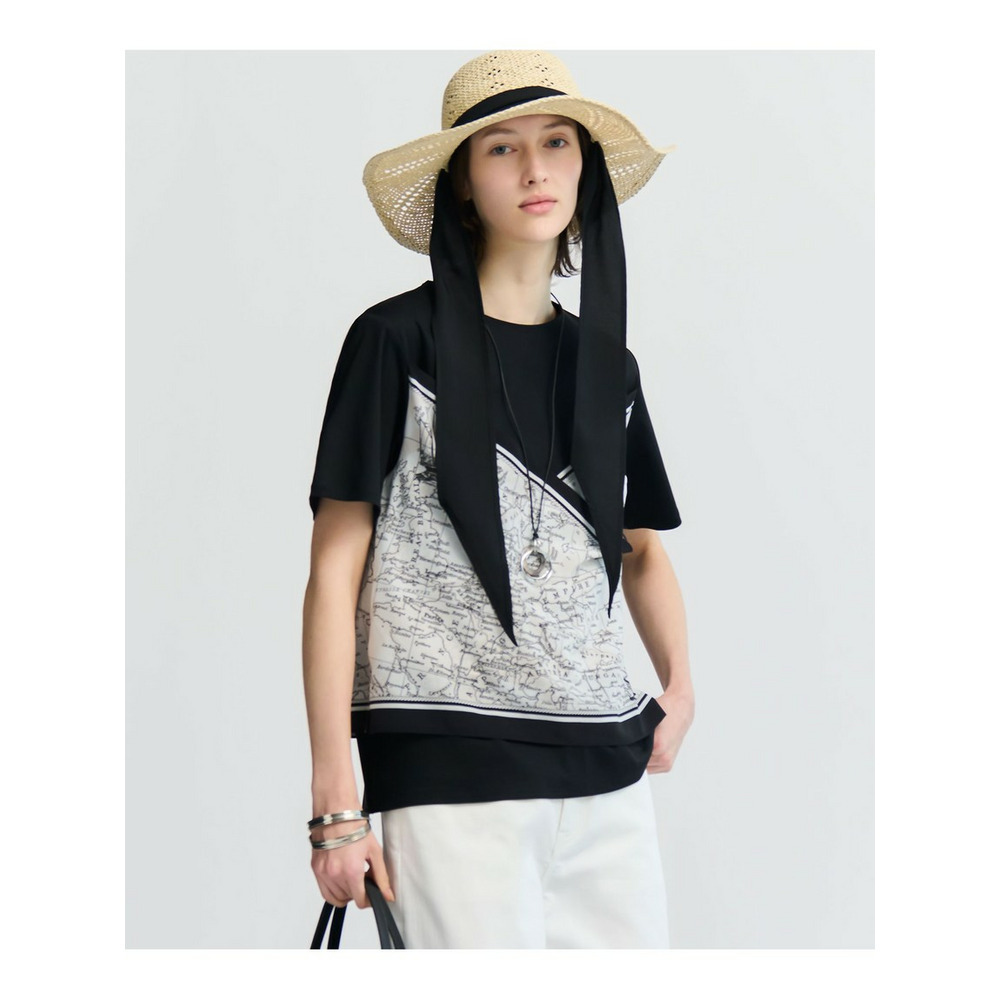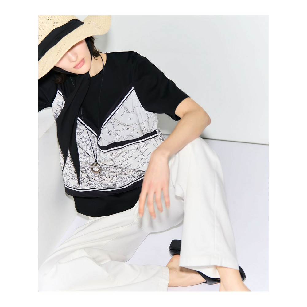 スカーフとTシャツを重ね着したような、一枚で今年らしいレイヤードスタイルが完成するトップスです。身頃のTシャツ部分を裾をボトムスにインしてもアウトにしても美しく決まる丈感に仕上げました。後ろ身頃にはギャザーを施すことで、デザインのアクセントになるとともに着脱もスムーズに行えます。デニムと合わせてカジュアルダウンしたり、きれいめなパンツやスカートと合わせたお出かけスタイルを楽しんだりと、幅広いコーディネートを楽しめます。カラーは、爽やかな印象のオフ×ネイビー(#501)、シックで落ち着いたブラウン×ブラウン(#535)、モードな雰囲気が魅力のブラック×オフ(#505)の3色展開です。