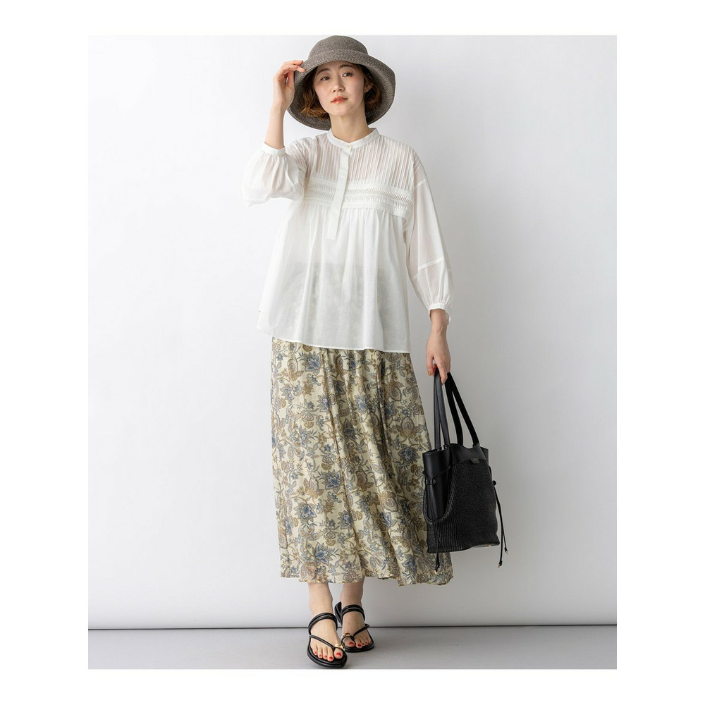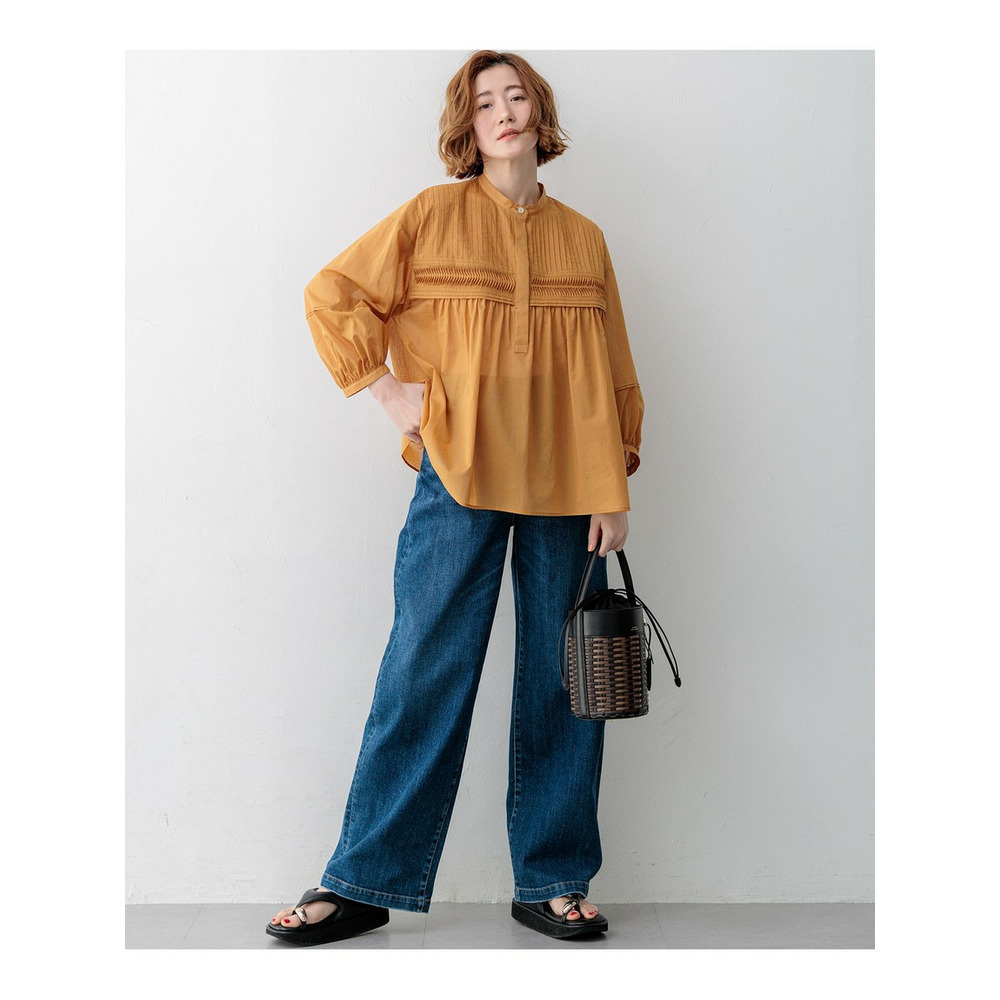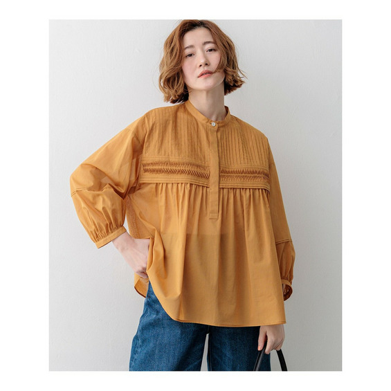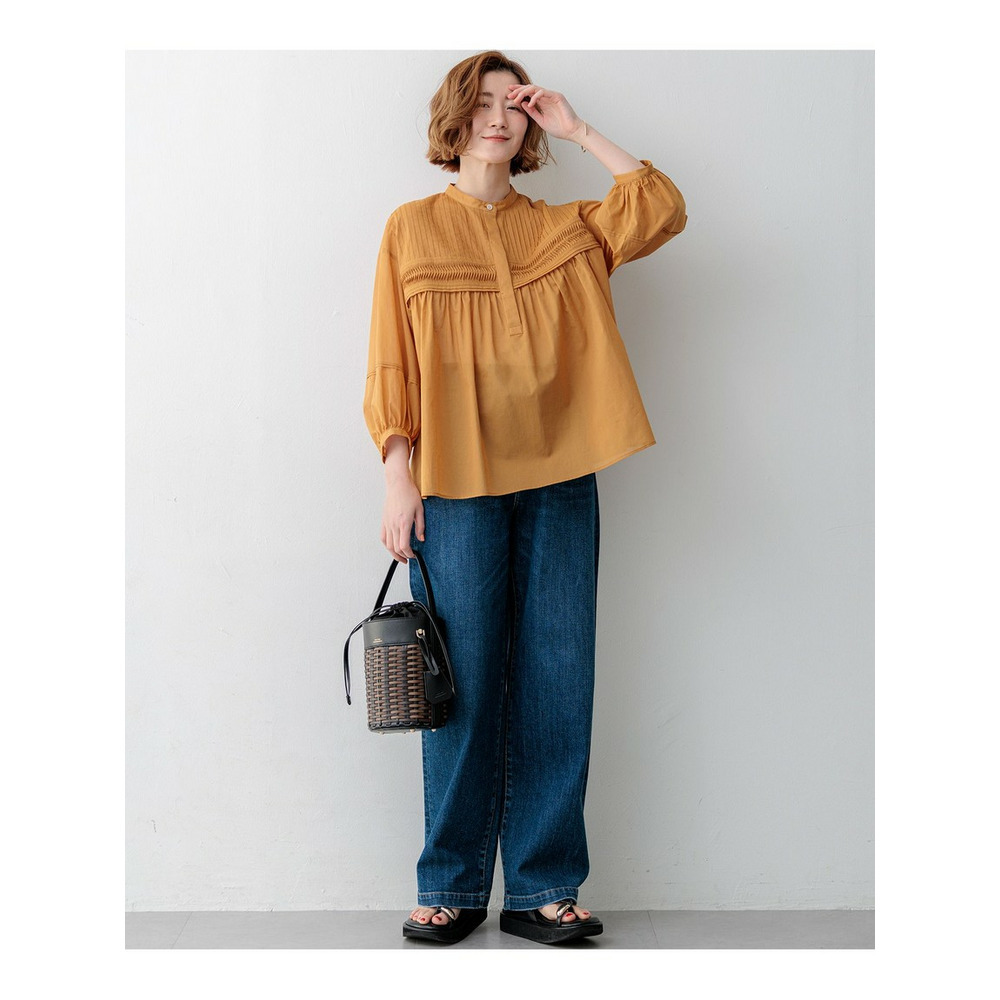 繊細なピンタックを贅沢にあしらった、フェミニンな表情のブラウスです。ふんわりとしたパフスリーブが気になる二の腕を優しくカバーし、胸下の切り替えから広がるギャザーがお腹周りのラインを自然に隠してくれます。スタンドカラーですっきりとした首元を演出し、甘くなりすぎない大人のバランスに仕上げました。デニムと合わせてカジュアルダウンしたり、柄パンツと合わせてリゾート風に着こなしたりと、一枚で主役になるアイテムです。カラーは、爽やかで万能なホワイト(#001)、シックで大人っぽいブラック(#005)、こなれ感のある華やかなキャメル(#034)の3色展開です。