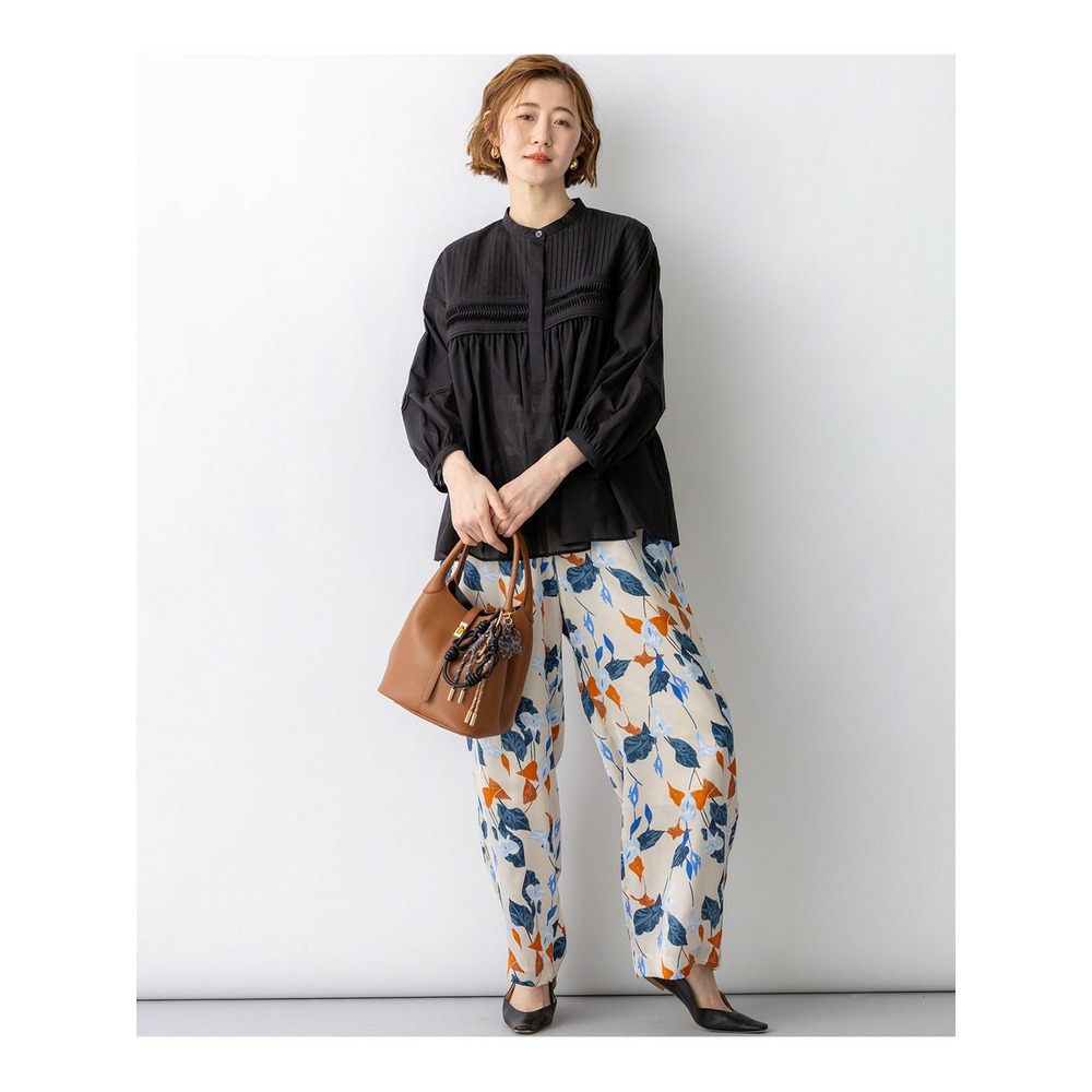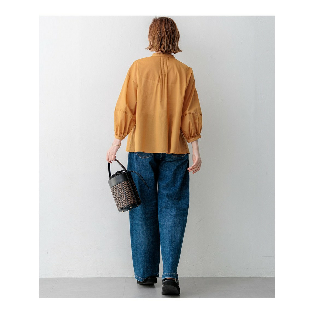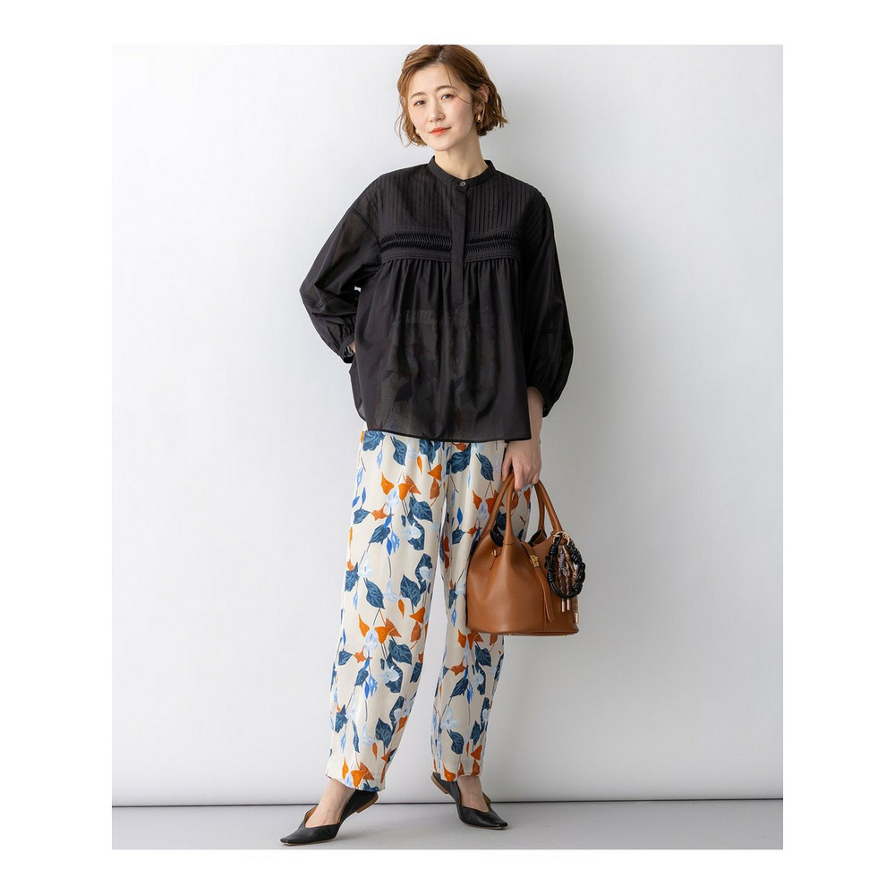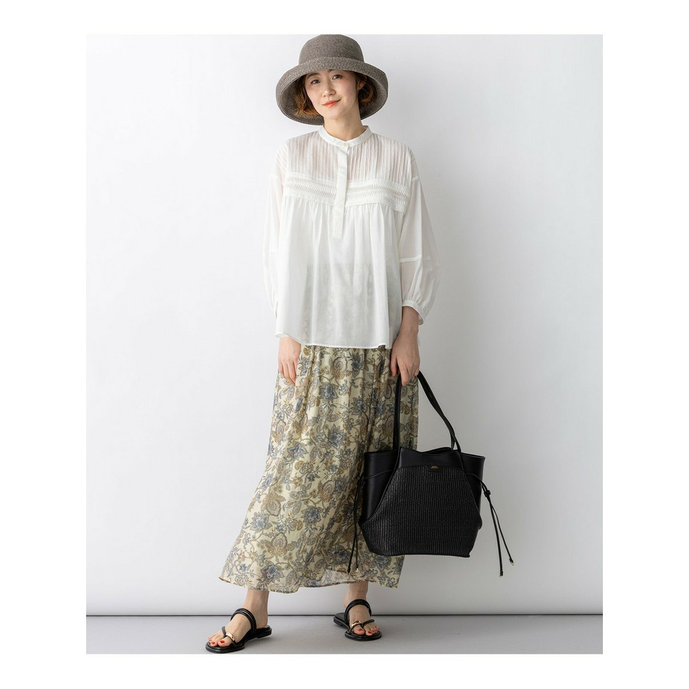 繊細なピンタックを贅沢にあしらった、フェミニンな表情のブラウスです。ふんわりとしたパフスリーブが気になる二の腕を優しくカバーし、胸下の切り替えから広がるギャザーがお腹周りのラインを自然に隠してくれます。スタンドカラーですっきりとした首元を演出し、甘くなりすぎない大人のバランスに仕上げました。デニムと合わせてカジュアルダウンしたり、柄パンツと合わせてリゾート風に着こなしたりと、一枚で主役になるアイテムです。カラーは、爽やかで万能なホワイト(#001)、シックで大人っぽいブラック(#005)、こなれ感のある華やかなキャメル(#034)の3色展開です。