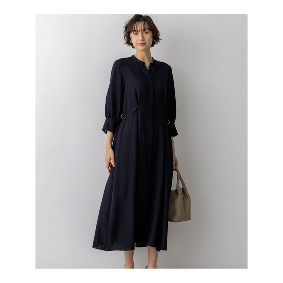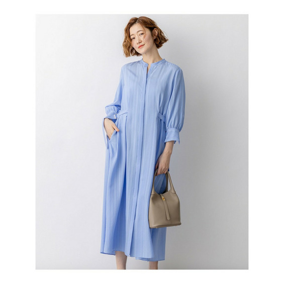 ウエストに施されたタック使いとサイドのバックルディテールが、ボディラインを美しく見せるワンピース。襟元はバンドカラーですっきりと仕上げ、知的な印象に。ウエストタックの効果ですっきりとしたシルエット。またサイドのバックルでウエストの絞りを調整できるため、その日の気分やスタイリングに合わせてシルエットを変化させることができます。前ボタンを全て開ければ、軽やかな羽織りとしても活躍する2WAY仕様。季節の変わり目のライトアウターとしても重宝します。 カラーは、爽やかな印象のスカイブルー(#172)、知的な品を感じるネイビー(#175)の2色展開です。