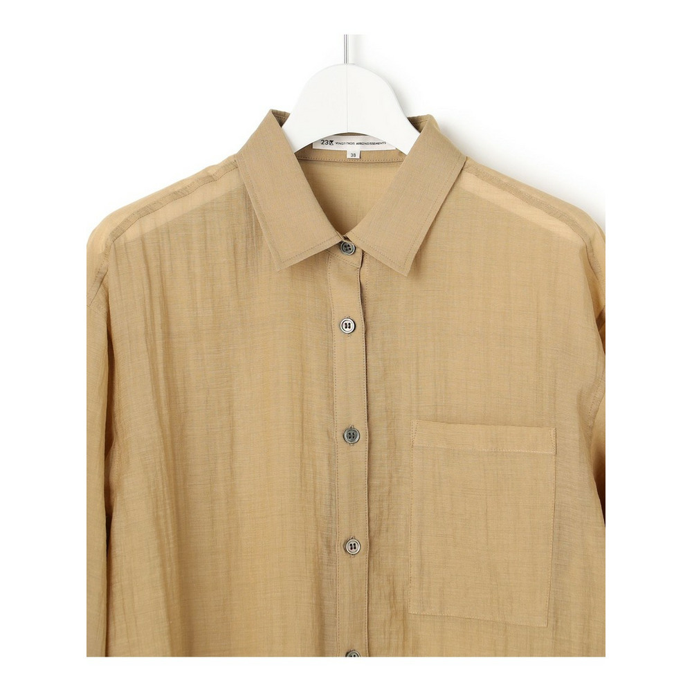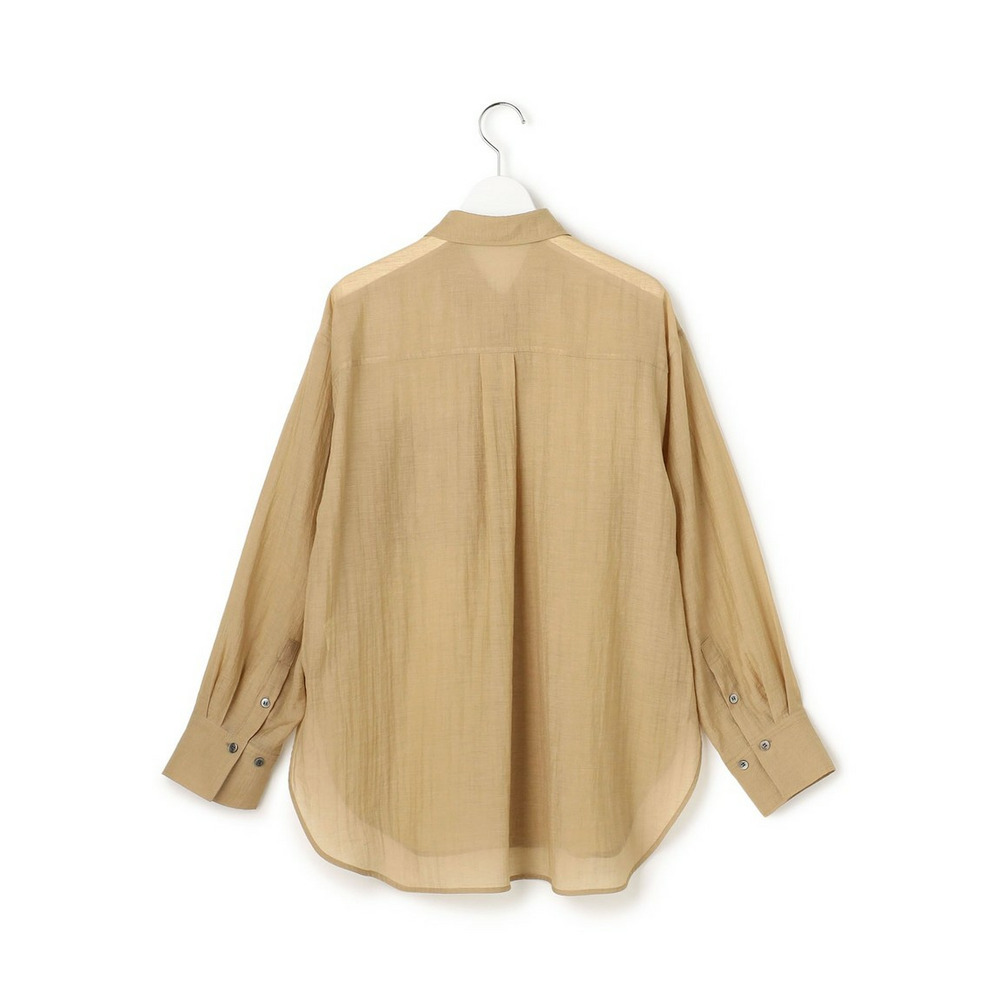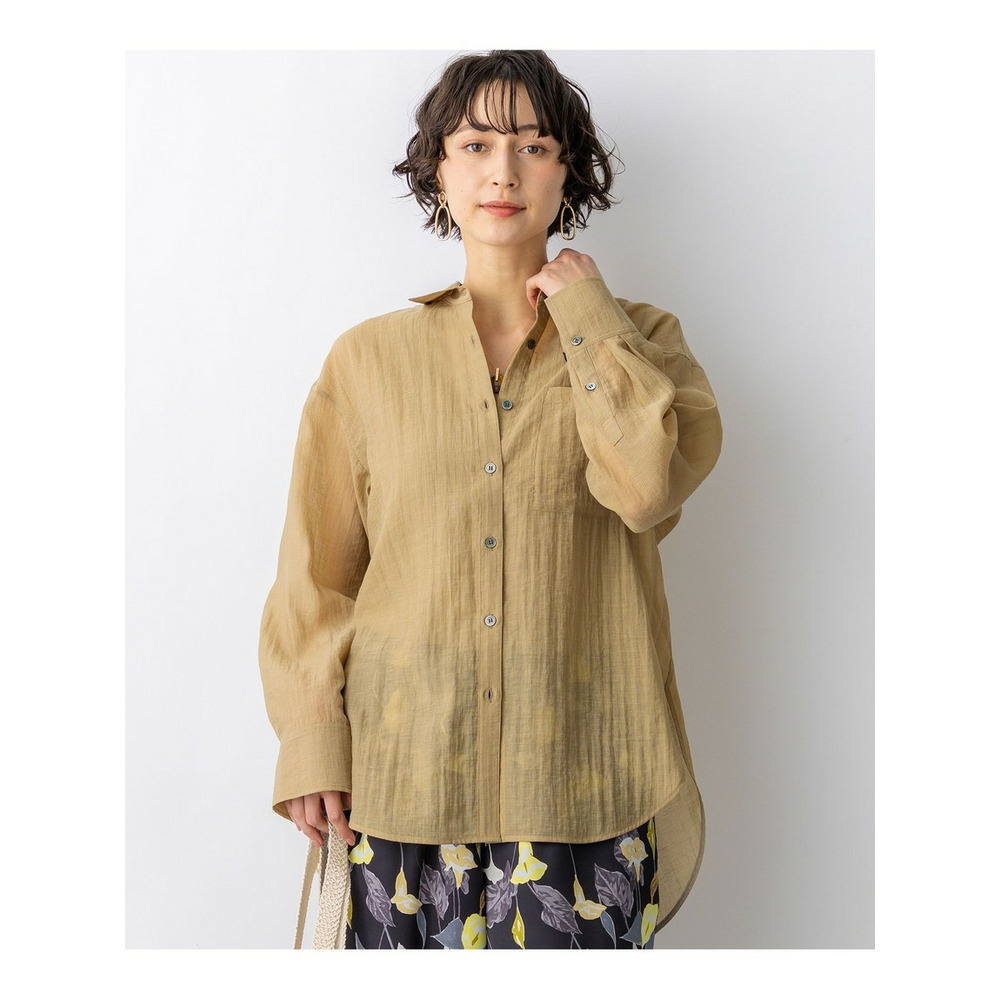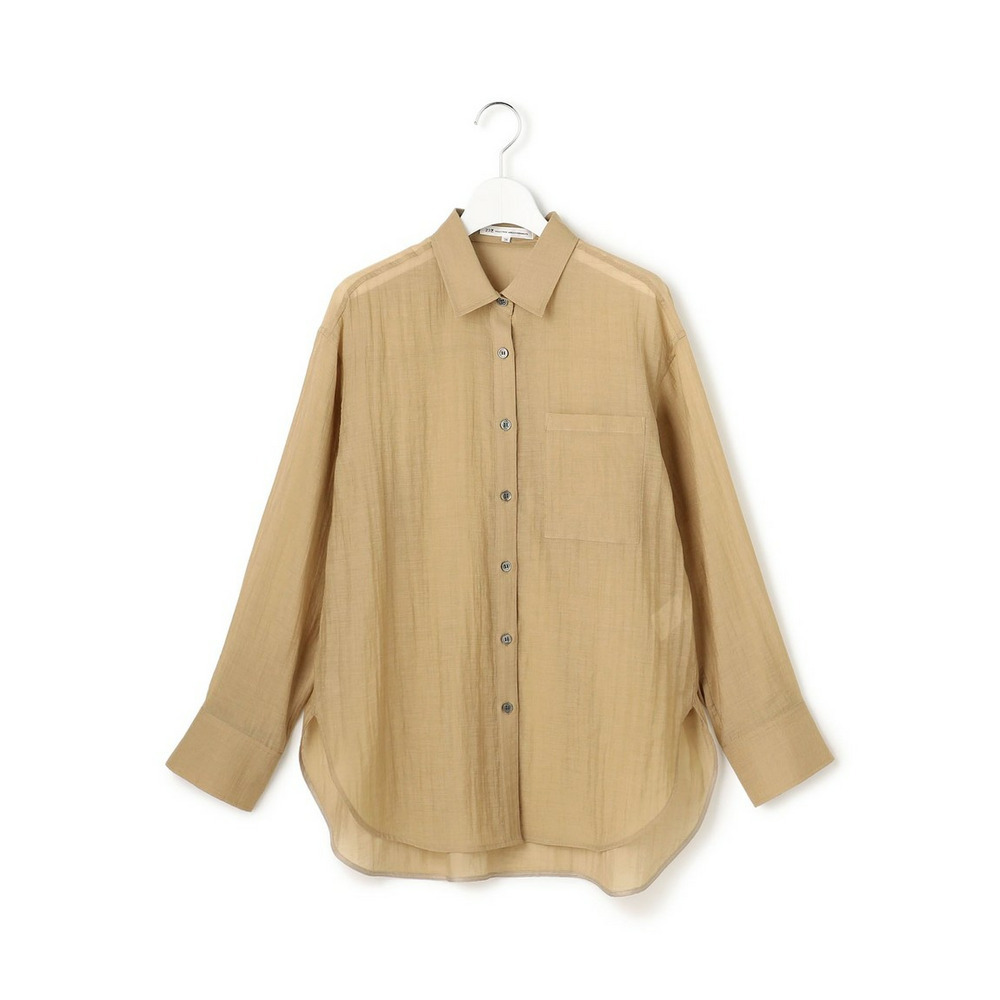 ナチュラルな表情が魅力の、涼し気なシアーシャツです。程よくゆとりのあるオーバーシルエットと、ヒップにかかる長めの着丈が、縦のラインを強調しすっきりとした印象を与えます。ボタンを閉めてシャツとしてはもちろん、タンクトップやキャミソールの上にさらりと羽織るスタイルもおすすめ。ドライな肌触りで清涼感があり、気温の上がる夏場まで長く着回せる便利な一枚です。シンプルなボトムと合わせるだけで、洗練された大人のリラックススタイルが完成します。カラーは、シックで万能なブラック(#005)、肌馴染みが良く上品なベージュ(#033)、こなれ感のある大人なカーキ(#054)の3色展開です。