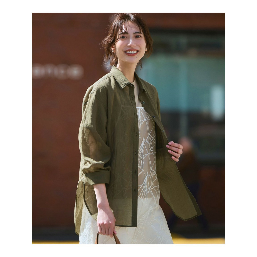 ナチュラルな表情が魅力の、涼し気なシアーシャツです。程よくゆとりのあるオーバーシルエットと、ヒップにかかる長めの着丈が、縦のラインを強調しすっきりとした印象を与えます。ボタンを閉めてシャツとしてはもちろん、タンクトップやキャミソールの上にさらりと羽織るスタイルもおすすめ。ドライな肌触りで清涼感があり、気温の上がる夏場まで長く着回せる便利な一枚です。シンプルなボトムと合わせるだけで、洗練された大人のリラックススタイルが完成します。カラーは、シックで万能なブラック(#005)、肌馴染みが良く上品なベージュ(#033)、こなれ感のある大人なカーキ(#054)の3色展開です。